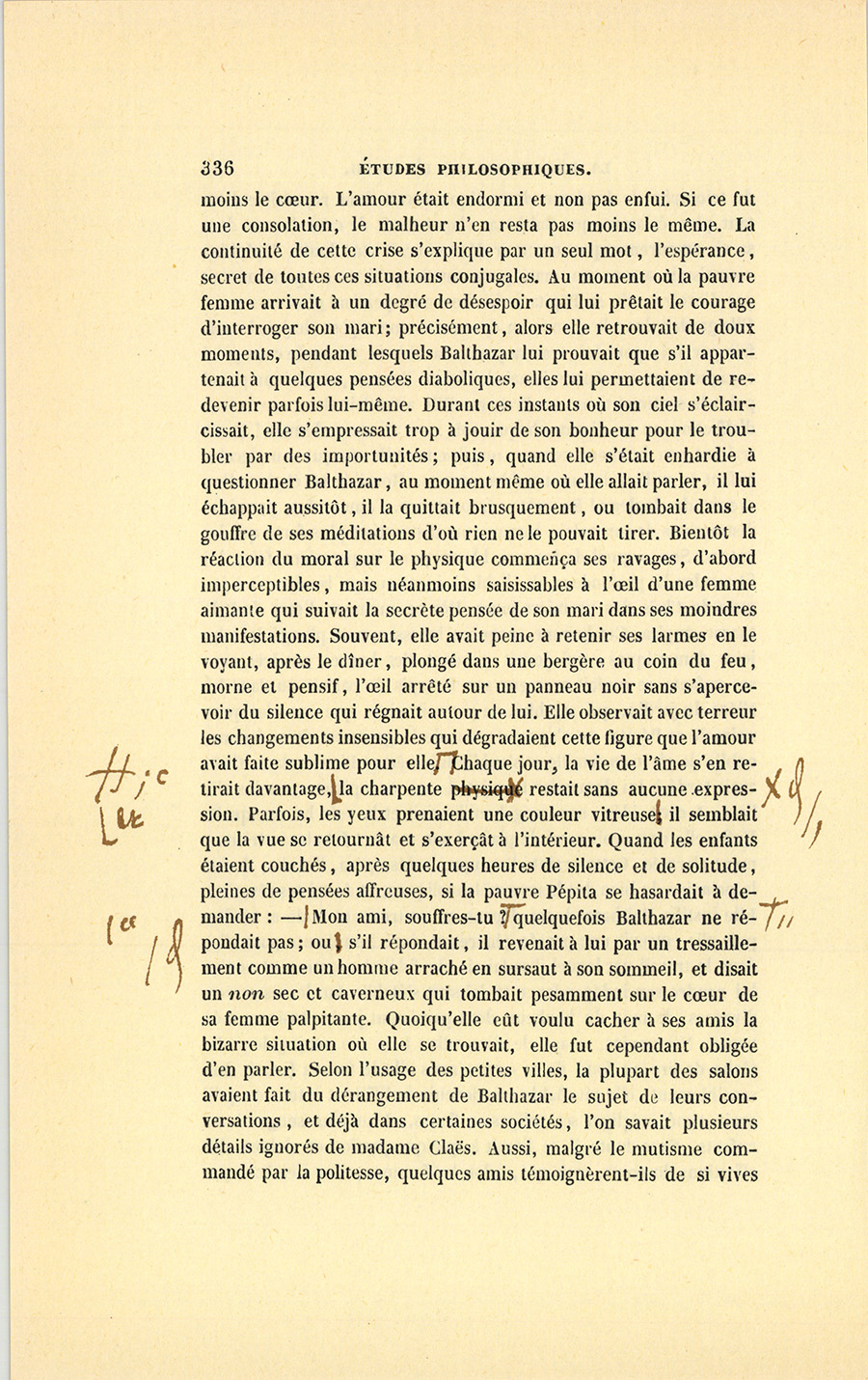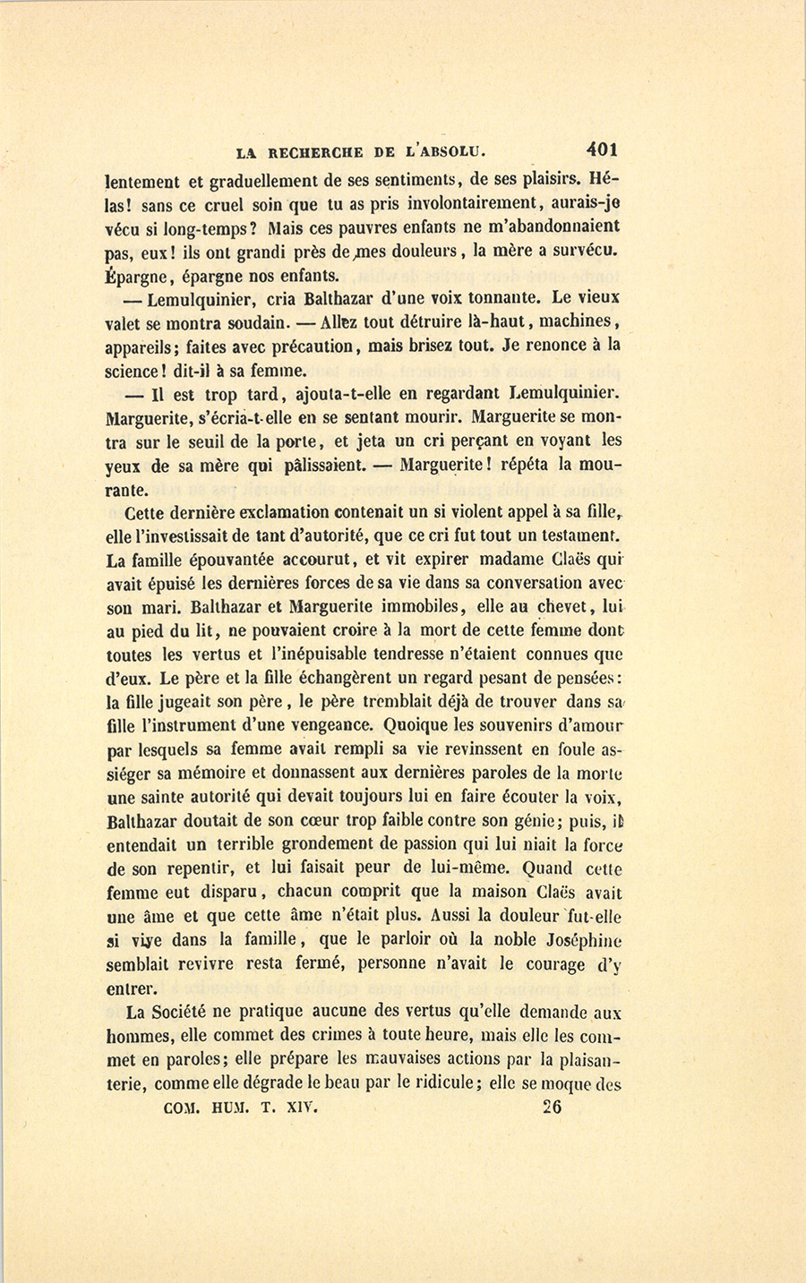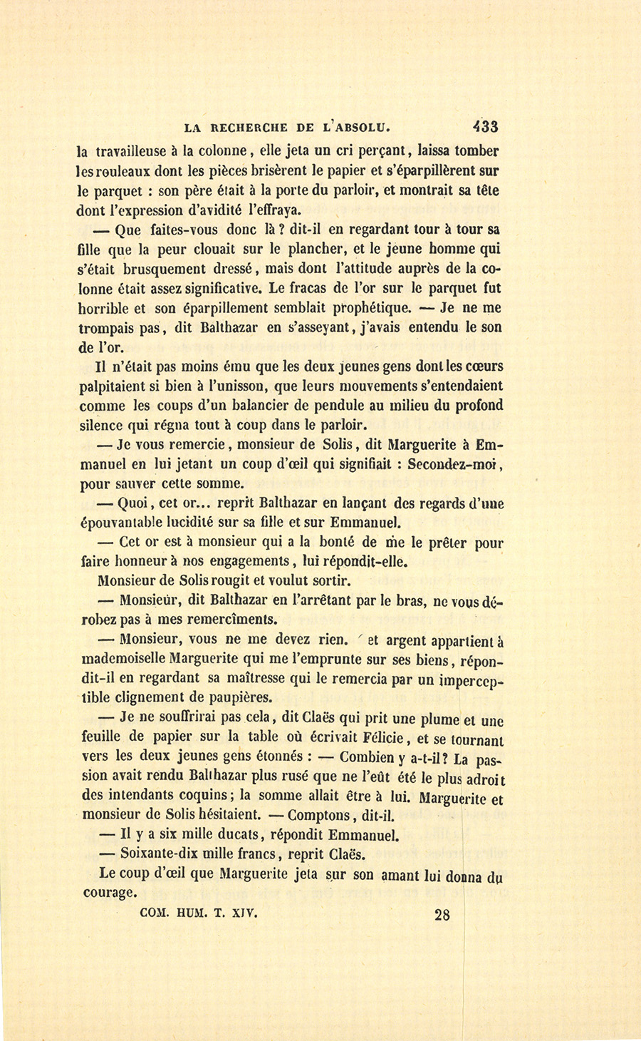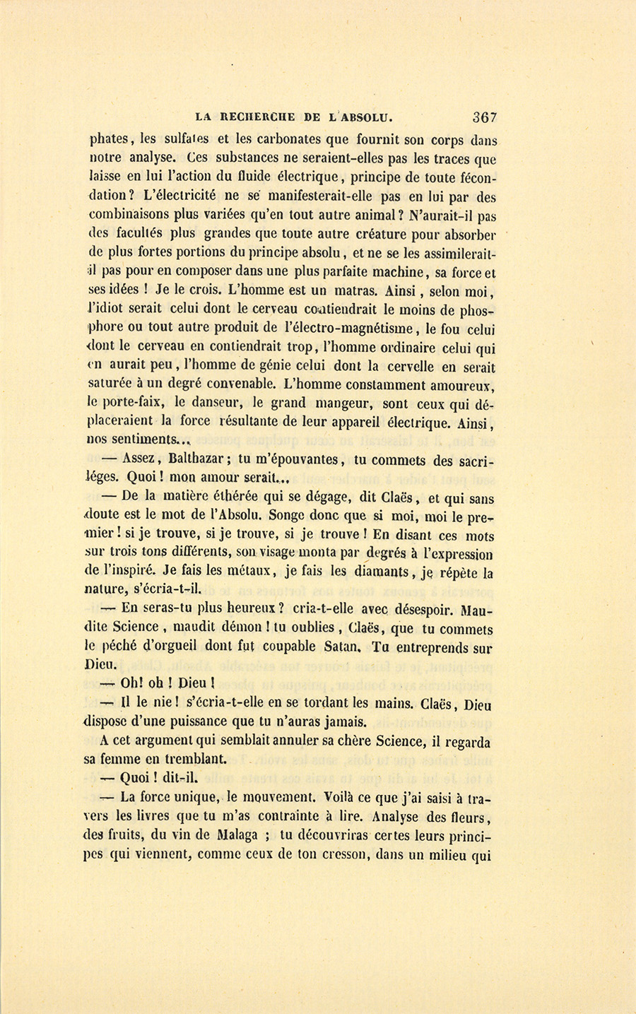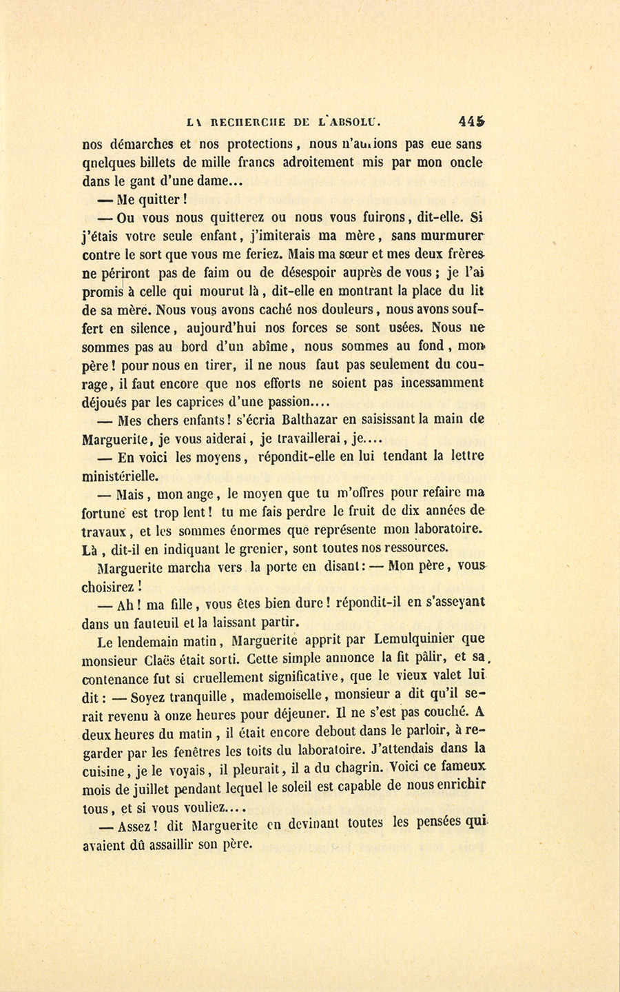 Le vieillard se livrait à des mouvements d’une force incroyable pour secouer les liens de la paralysie ; il désirait parler et remuait la langue sans pouvoir former de sons ; ses yeux flamboyants projetaient des pensées ; ses traits contractés exprimaient des douleurs inouïes ; ses doigts s’agitaient désespérément, il suait à grosses gouttes. Le matin, les enfants vinrent embrasser leur père avec cette affection que la crainte de sa mort prochaine leur faisait épancher tous les jours plus ardente et plus vive ; mais il ne leur témoigna point la satisfaction que lui causaient habituellement ces témoignages de tendresse. Emmanuel, averti par Pierquin, s’empressa de décacheter le journal pour voir si cette lecture ferait diversion aux crises intérieures qui travaillaient Balthazar. En dépliant la feuille, il vit ces mots, découverte de l’absolu, qui le frappèrent vivement, et il lut à Marguerite un article où il était parlé d’un procès {p. 476} relatif à la vente qu’un célèbre mathématicien polonais avait faite de l’Absolu. Quoique Emmanuel lût tout bas l’annonce du fait à Marguerite qui le pria de passer l’article, Balthazar avait entendu.