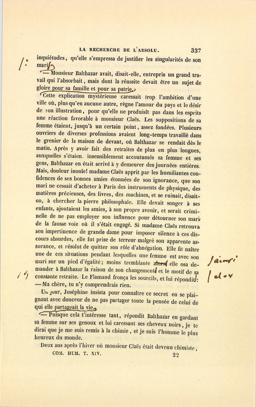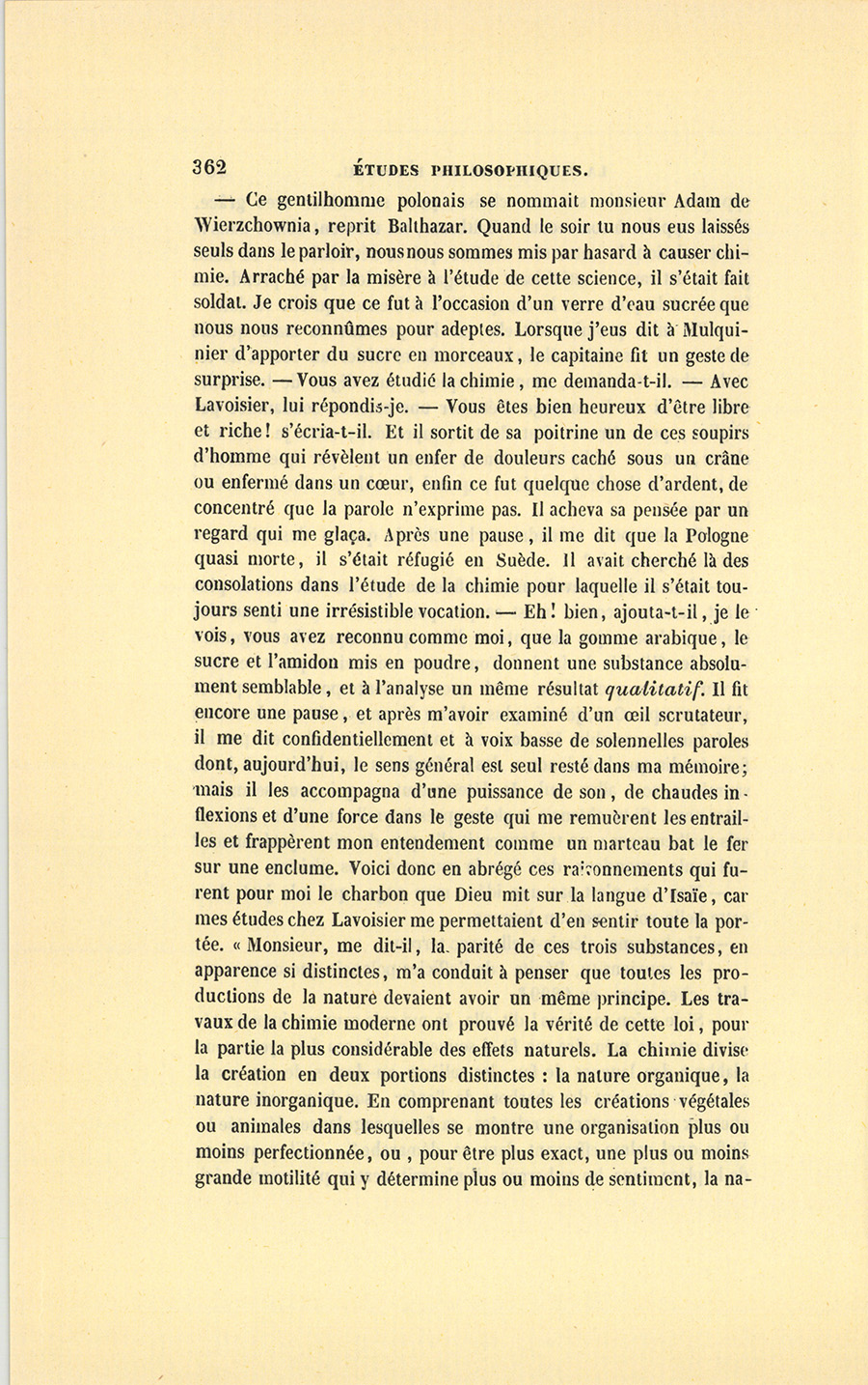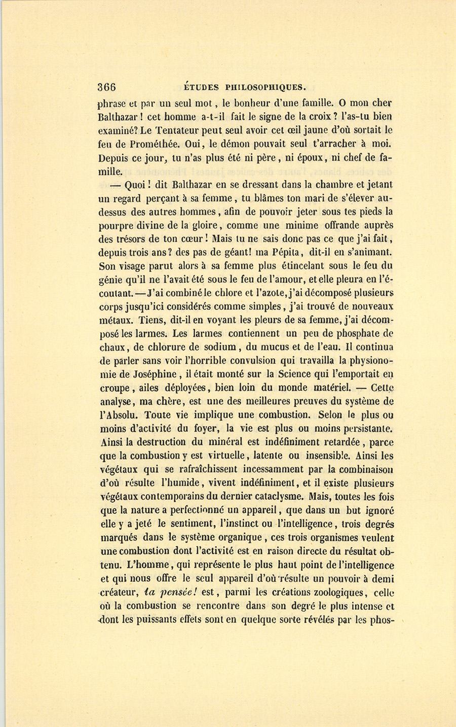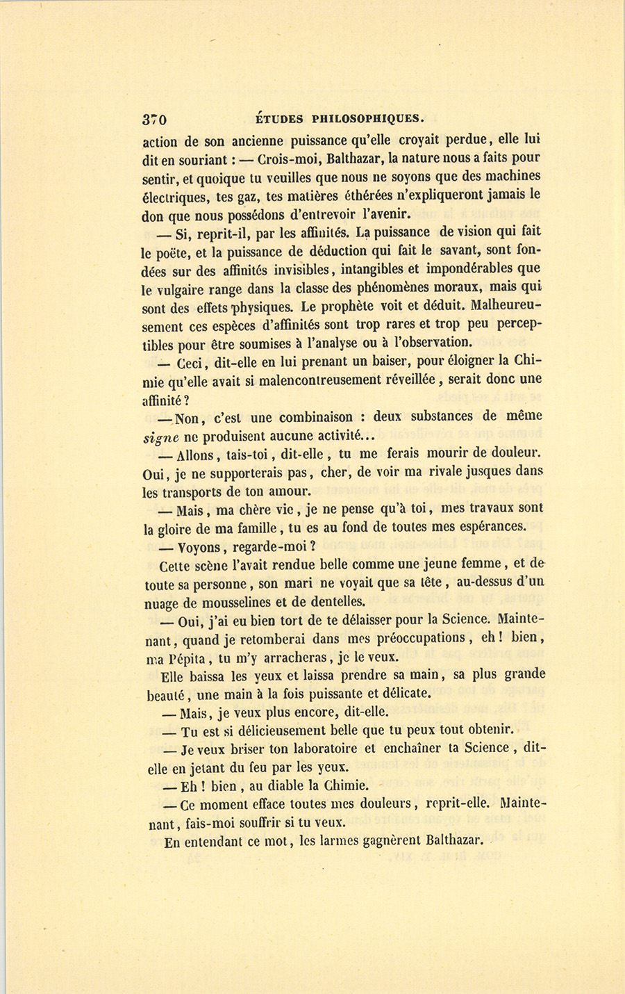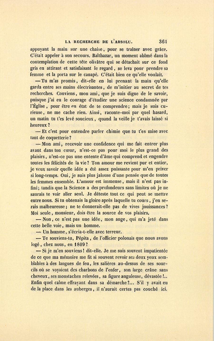 Un jour, Joséphine insista pour connaître ce secret en se plaignant avec douceur de ne pas partager toute la pensée de celui de qui elle partageait la vie. – Puisque cela t’intéresse tant, répondit Balthazar en gardant sa femme sur ses genoux et lui caressant ses cheveux noirs, je te dirai que je me suis remis à la chimie, et que je suis3 l’homme le plus heureux du monde.