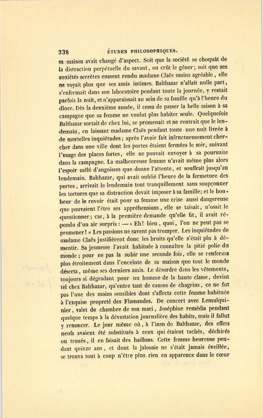 Deux ans après l’hiver où monsieur Claës était devenu chimiste, {p. 338} sa maison avait changé d’aspect. Soit que la société se choquât de la distraction perpétuelle du savant, ou crût le gêner ; soit que ses anxiétés secrètes eussent rendu madame Claës moins agréable, elle ne voyait plus que ses amis intimes. Balthazar n’allait nulle part, s’enfermait dans son laboratoire pendant toute la journée, y restait parfois la nuit, et n’apparaissait au sein de sa famille qu’à l’heure du dîner. Dès la deuxième année, il cessa de passer la belle saison à sa campagne que sa femme ne voulut plus habiter seule. Quelquefois Balthazar sortait de chez lui, se promenait et ne rentrait que le lendemain, en laissant madame Claës pendant toute une nuit livrée à de mortelles inquiétudes ; après l’avoir fait infructueusement chercher dans une ville dont les portes étaient fermées le soir, suivant l’usage des places fortes, elle ne pouvait envoyer à sa poursuite dans la campagne. La malheureuse femme n’avait même plus alors l’espoir mêlé d’angoisses que donne l’attente, et souffrait jusqu’au lendemain. Balthazar, qui avait oublié l’heure de la fermeture des portes, arrivait le lendemain tout tranquillement sans soupçonner les tortures que sa distraction devait imposer à sa famille ; et le bonheur de le revoir était pour sa femme une crise aussi dangereuse que pouvaient l’être ses appréhensions, elle se taisait, n’osait le questionner ; car, à la première demande qu’elle fit, il avait répondu d’un air surpris : – « Eh ! bien, quoi, l’on ne peut pas se promener ! » Les passions ne savent pas tromper. Les inquiétudes de madame Claës justifièrent donc les bruits qu’elle s’était plu à démentir. Sa jeunesse l’avait habituée à connaître la pitié polie du monde ; pour ne pas la subir une seconde fois, elle se renferma plus étroitement dans l’enceinte de sa maison que tout le monde déserta, même ses derniers amis. Le désordre dans les vêtements, toujours si dégradant pour un homme de la haute classe, devint tel chez Balthazar, qu’entre tant de causes de chagrins, ce ne fut pas l’une des moins sensibles dont s’affecta cette femme habituée à l’exquise propreté des Flamandes. De concert avec Lemulquinier, valet de chambre de son mari, Joséphine remédia pendant quelque temps à la dévastation journalière des habits, mais il fallut y renoncer. Le jour même où, à l’insu de Balthazar, des effets neufs avaient été substitués à ceux qui étaient tachés, déchirés ou troués, il en faisait des haillons. Cette femme heureuse pendant quinze ans, et dont la jalousie ne s’était jamais éveillée, se trouva tout à coup n’être plus rien en apparence dans le cœur {p. 339} où elle régnait naguère. Espagnole d’origine, le sentiment de la femme espagnole gronda chez elle, quand elle se découvrit une rivale dans la Science qui lui enlevait son mari ; les tourments de la jalousie lui dévorèrent le cœur, et rénovèrent son amour. Mais que faire contre la Science ? comment en combattre le pouvoir incessant, tyrannique et croissant ? Comment tuer une rivale invisible ? Comment une femme, dont le pouvoir est limité par la nature, peut-elle lutter avec une idée dont les jouissances sont infinies et les attraits toujours nouveaux ? Que tenter contre la coquetterie des idées qui se rafraîchissent, renaissent plus belles dans les difficultés, et entraînent un homme si loin du monde qu’il oublie jusqu’à ses plus chères affections ? Enfin un jour, malgré les ordres sévères que Balthazar avait donnés, sa femme voulut au moins ne pas le quitter, s’enfermer avec lui dans ce grenier où il se retirait, combattre corps à corps avec sa rivale en assistant son mari durant les longues heures qu’il prodiguait à cette terrible maîtresse. Elle voulut se glisser secrètement dans ce mystérieux atelier de séduction, et acquérir le droit d’y rester toujours. Elle essaya donc de partager avec Lemulquinier le droit d’entrer dans le laboratoire ; mais, pour ne pas le rendre témoin d’une querelle qu’elle redoutait, elle attendit un jour où son mari se passerait du valet de chambre. Depuis quelque temps, elle étudiait les allées et venues de ce domestique avec une impatience haineuse ; ne savait-il pas tout ce qu’elle désirait apprendre, ce que son mari lui cachait et ce qu’elle n’osait lui demander ; elle trouvait Lemulquinier plus favorisé qu’elle, elle, l’épouse !