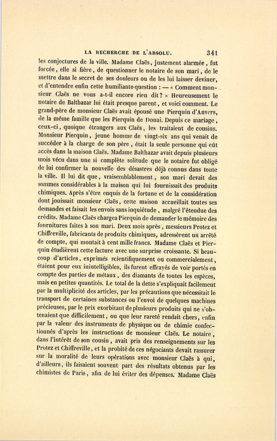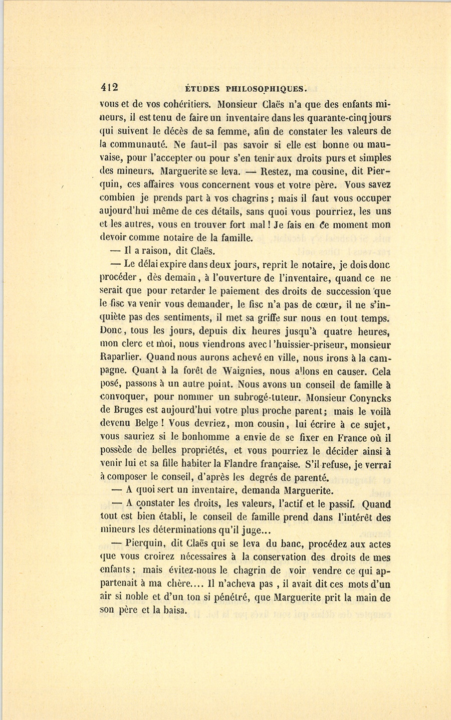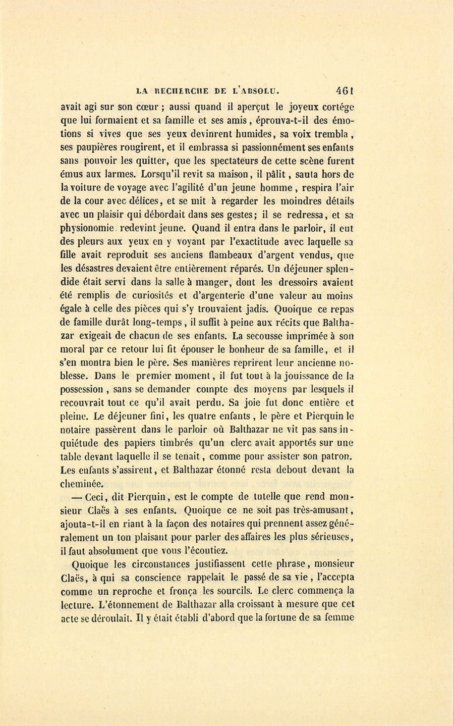 – Ceci, dit Pierquin, est le compte de tutelle que rend monsieur Claës à ses enfants. Quoique ce ne soit pas très-amusant, ajouta-t-il en riant à la façon des notaires qui prennent assez généralement un ton plaisant pour parler des affaires les plus sérieuses, il faut absolument que vous l’écoutiez.
