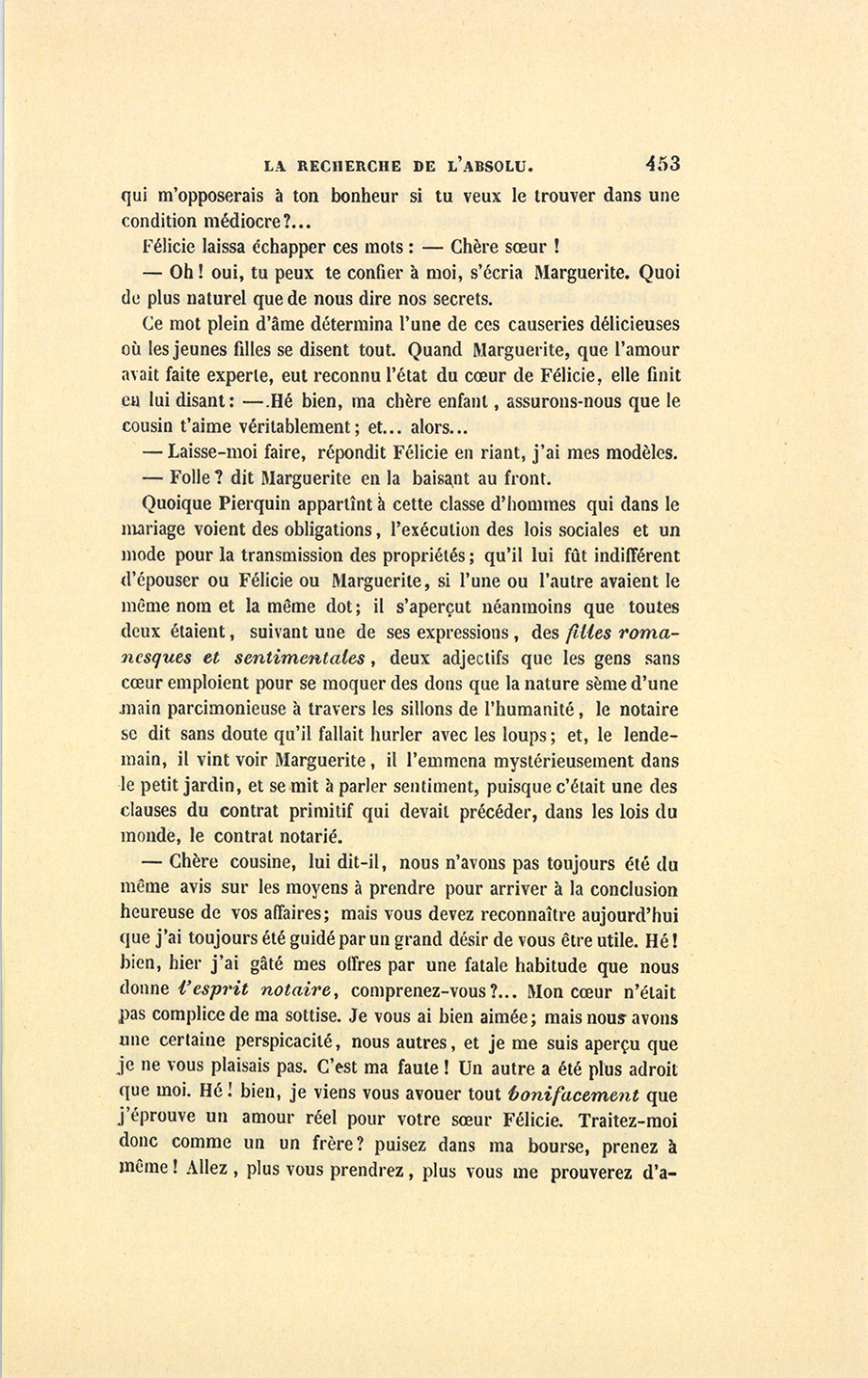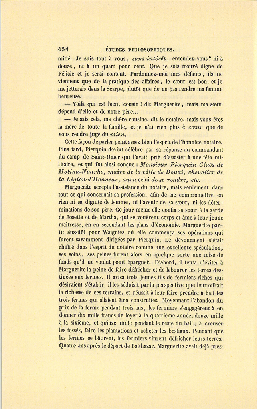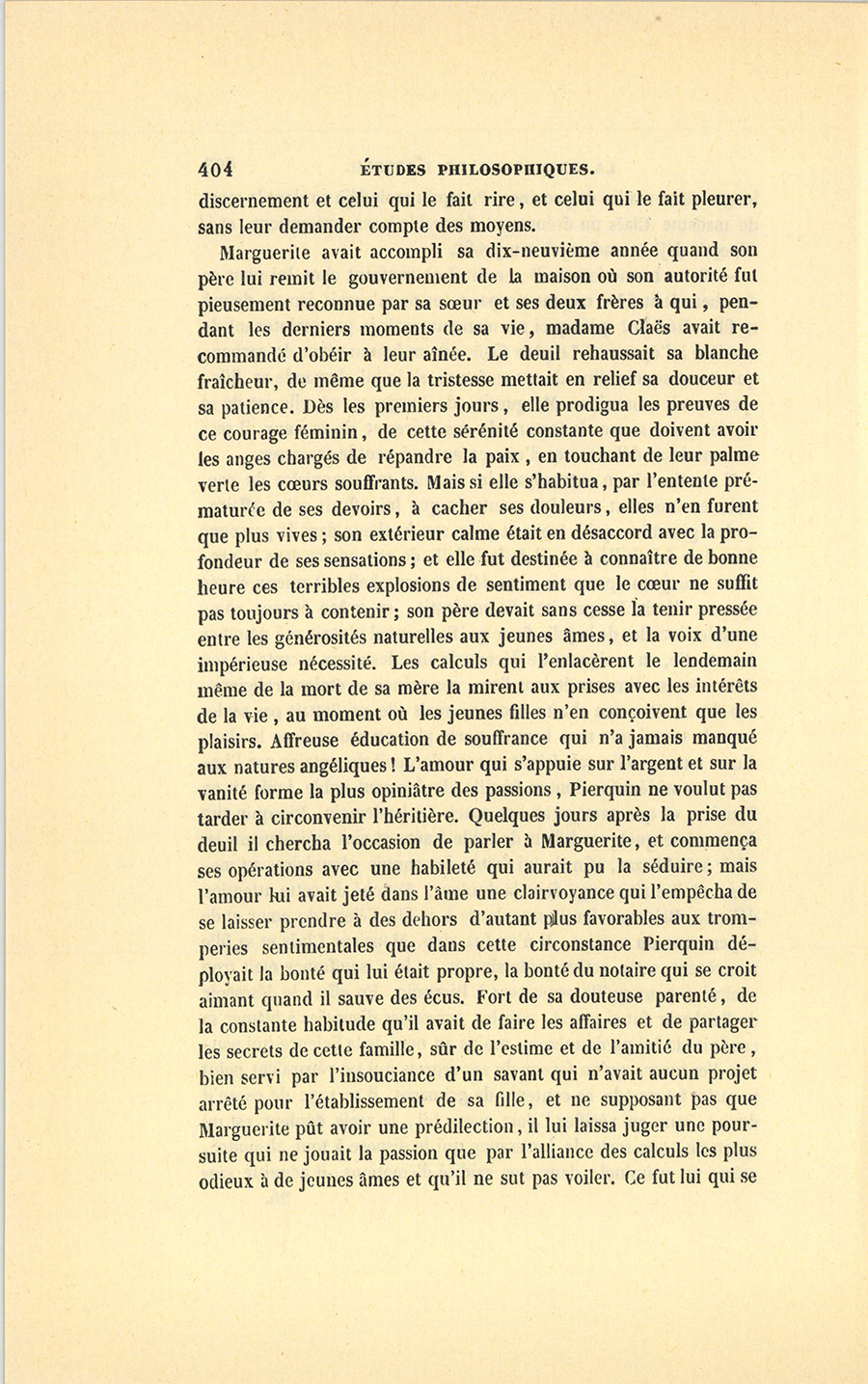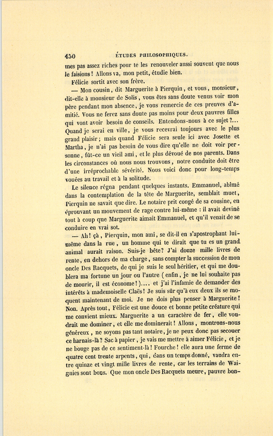 Quoique Pierquin appartînt à cette classe d’hommes qui dans le mariage voient des obligations, l’exécution des lois sociales et un mode pour la transmission des propriétés ; qu’il lui fût indifférent d’épouser ou Félicie ou Marguerite, si l’une ou l’autre avaient le même nom et la même dot ; il s’aperçut néanmoins que toutes deux étaient, suivant une de ses expressions, des filles romanesques et sentimentales, deux adjectifs que les gens sans cœur emploient pour se moquer des dons que la nature sème d’une main parcimonieuse à travers les sillons de l’humanité, le notaire se dit sans doute qu’il fallait hurler avec les loups ; et, le lendemain, il vint voir Marguerite, il l’emmena mystérieusement dans le petit jardin, et se mit à parler sentiment, puisque c’était une des clauses du contrat primitif qui devait précéder, dans les lois du monde, le contrat notarié.