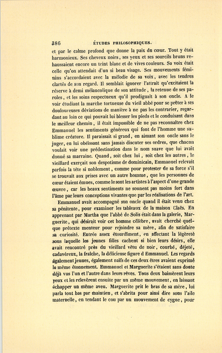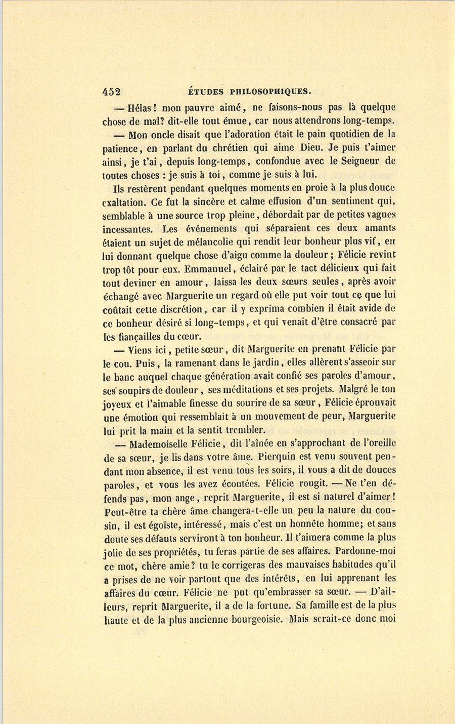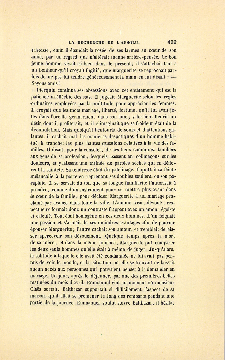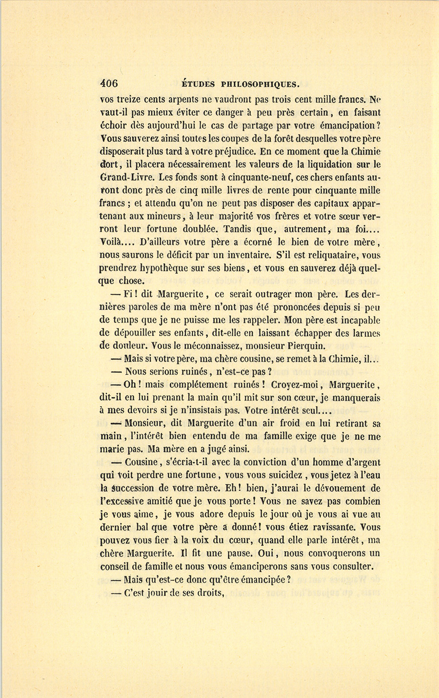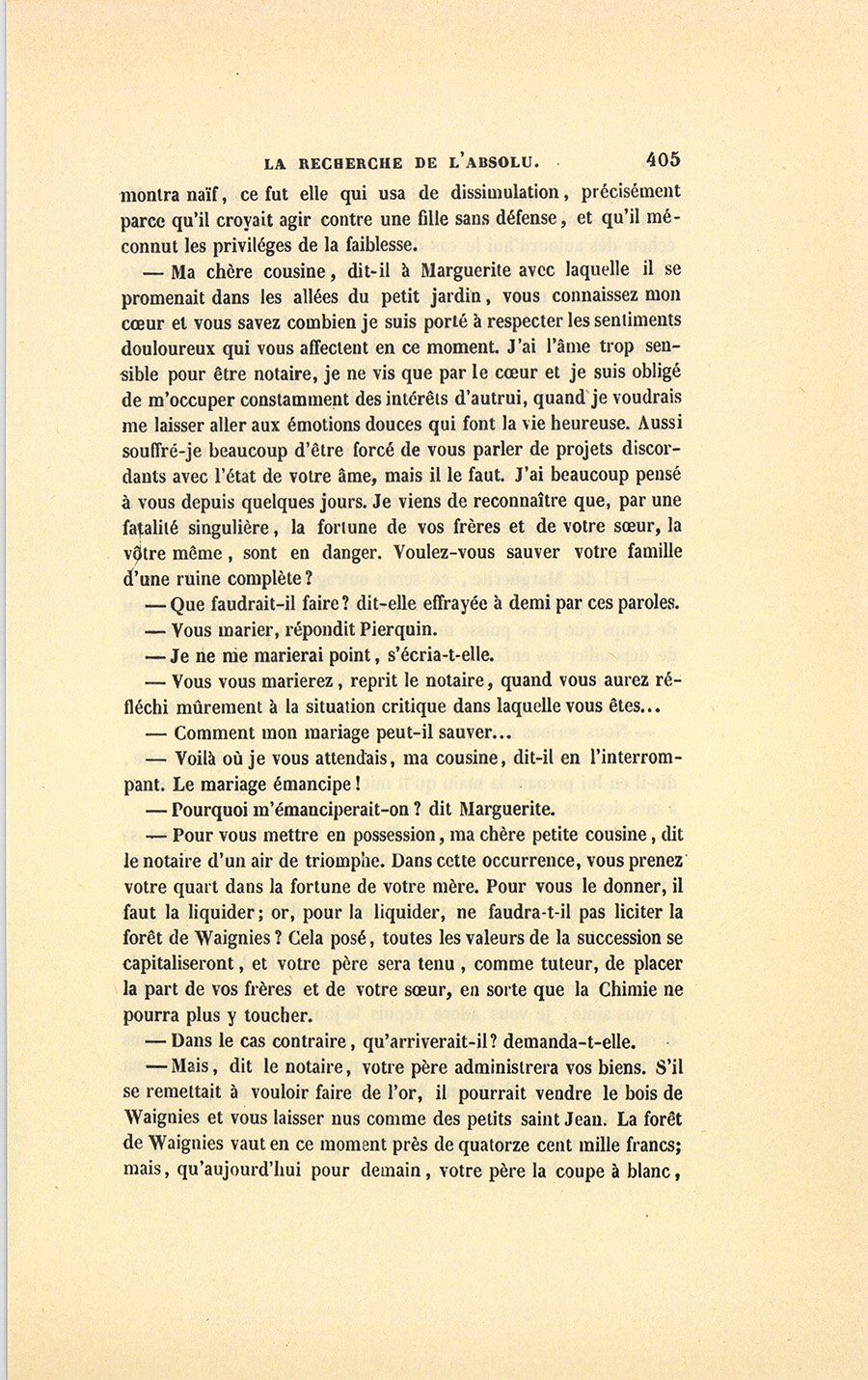 Quoique Pierquin appartînt à cette classe d’hommes qui dans le mariage voient des obligations, l’exécution des lois sociales et un mode pour la transmission des propriétés ; qu’il lui fût indifférent d’épouser ou Félicie ou Marguerite, si l’une ou l’autre avaient le même nom et la même dot ; il s’aperçut néanmoins que toutes deux étaient, suivant une de ses expressions, des filles romanesques et sentimentales, deux adjectifs que les gens sans cœur emploient pour se moquer des dons que la nature sème d’une main parcimonieuse à travers les sillons de l’humanité, le notaire se dit sans doute qu’il fallait hurler avec les loups ; et, le lendemain, il vint voir Marguerite, il l’emmena mystérieusement dans le petit jardin, et se mit à parler sentiment, puisque c’était une des clauses du contrat primitif qui devait précéder, dans les lois du monde, le contrat notarié.