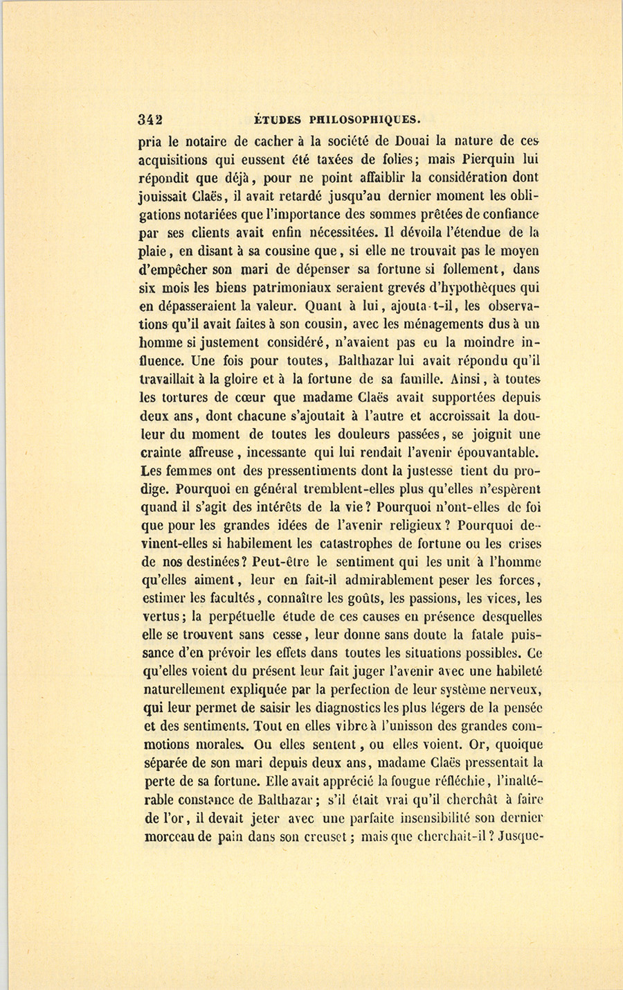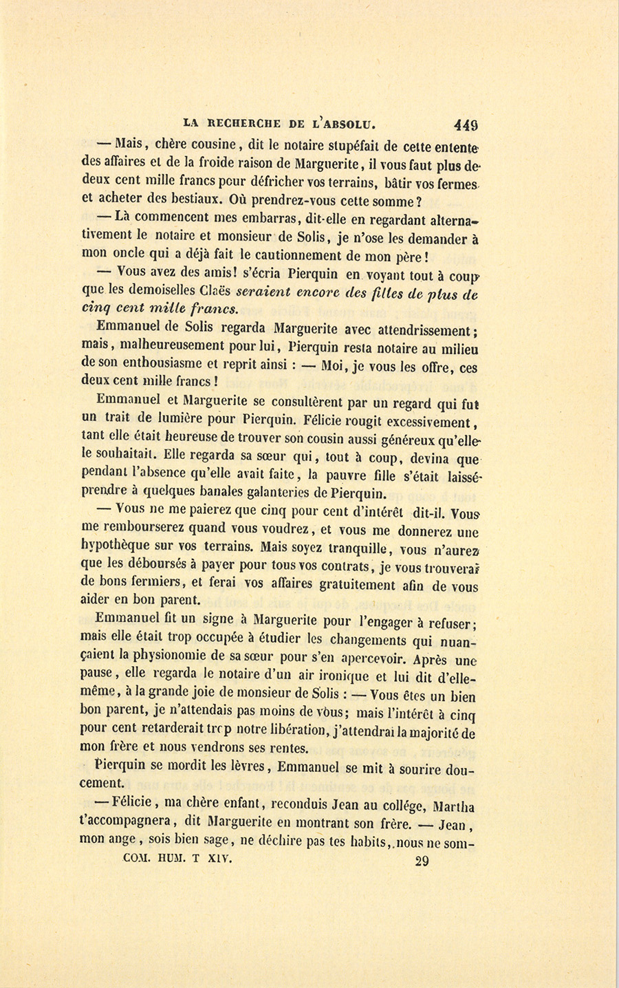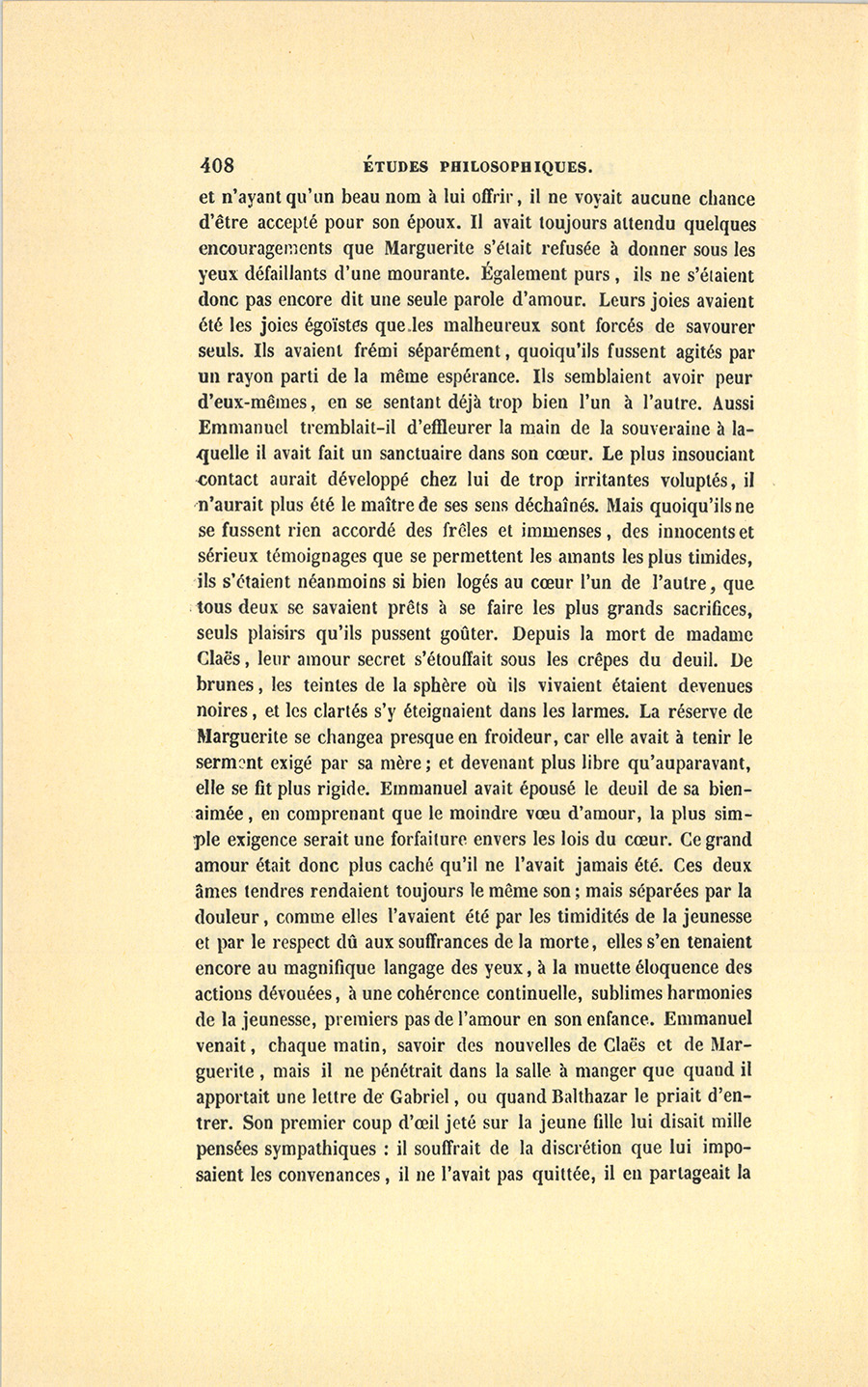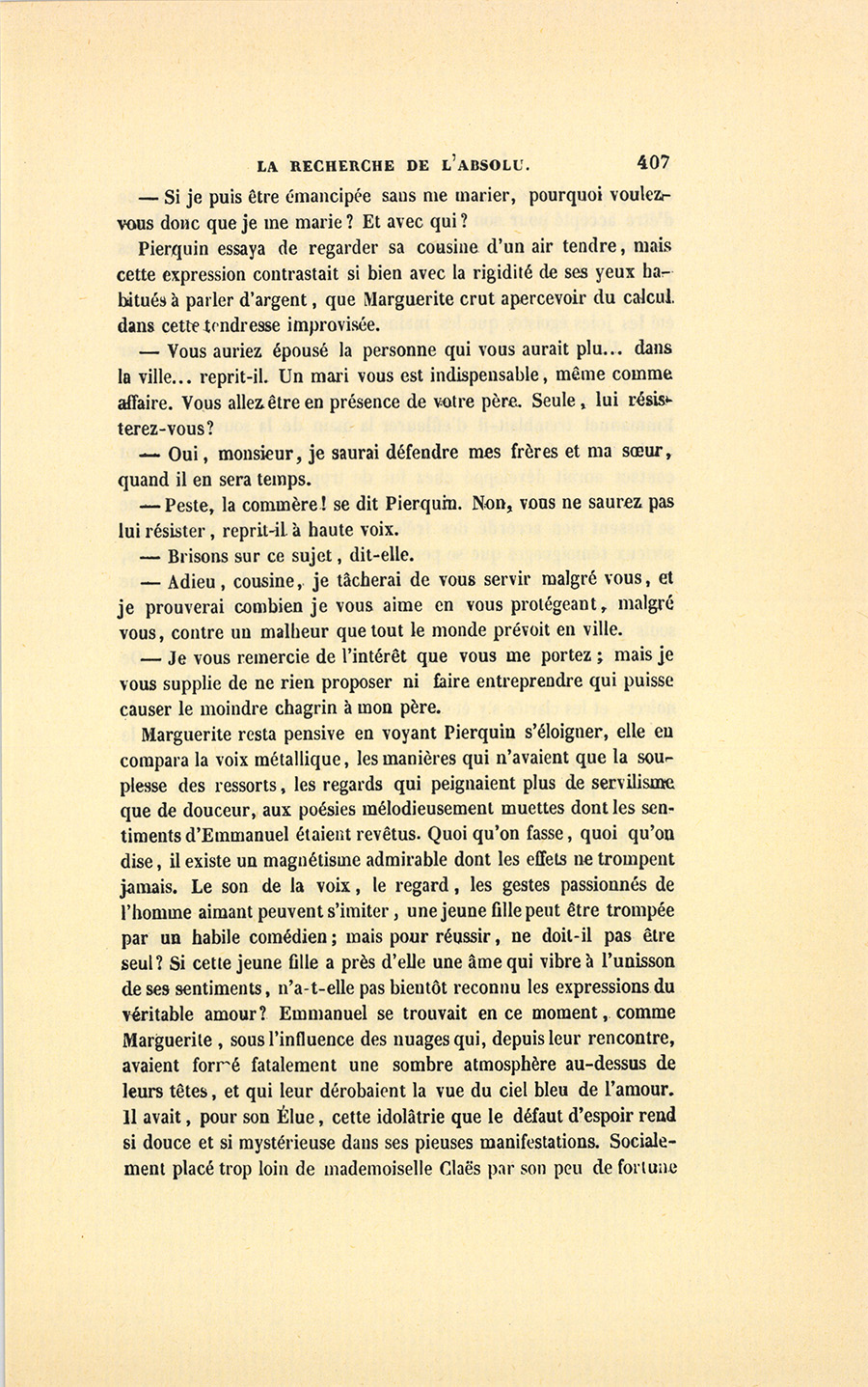 Quoique Pierquin appartînt à cette classe d’hommes qui dans le mariage voient des obligations, l’exécution des lois sociales et un mode pour la transmission des propriétés ; qu’il lui fût indifférent d’épouser ou Félicie ou Marguerite, si l’une ou l’autre avaient le même nom et la même dot ; il s’aperçut néanmoins que toutes deux étaient, suivant une de ses expressions, des filles romanesques et sentimentales, deux adjectifs que les gens sans cœur emploient pour se moquer des dons que la nature sème d’une main parcimonieuse à travers les sillons de l’humanité, le notaire se dit sans doute qu’il fallait hurler avec les loups ; et, le lendemain, il vint voir Marguerite, il l’emmena mystérieusement dans le petit jardin, et se mit à parler sentiment, puisque c’était une des clauses du contrat primitif qui devait précéder, dans les lois du monde, le contrat notarié.