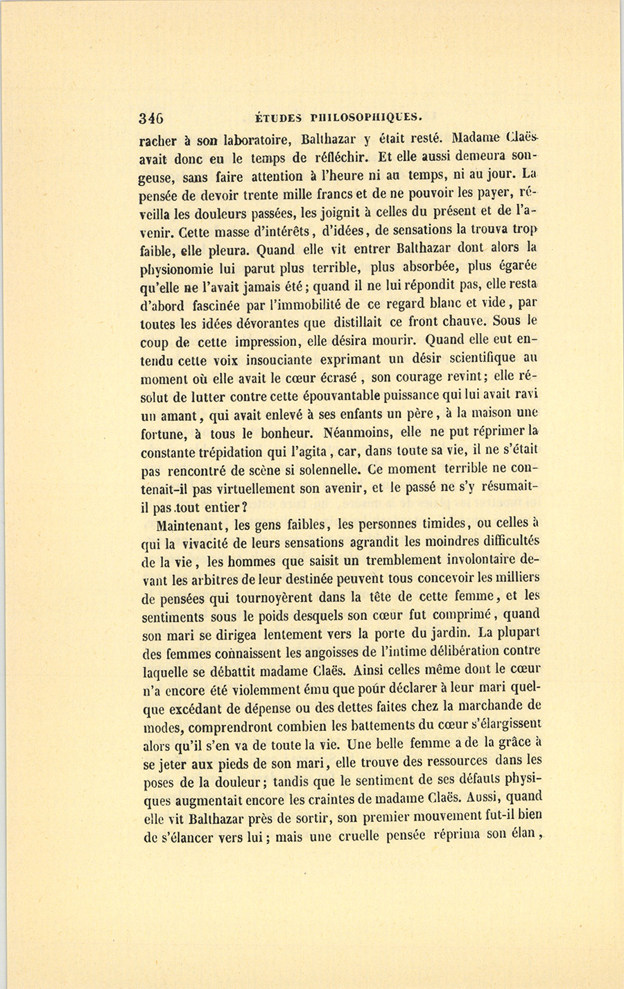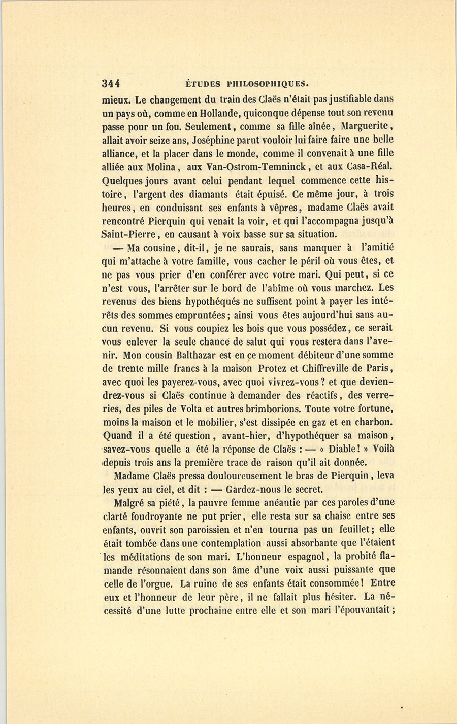 Telles furent les transitions successives par lesquelles le malheur fit passer la maison Claës, avant de l’amener à l’espèce de mort civile dont elle est frappée au moment où cette histoire commence.