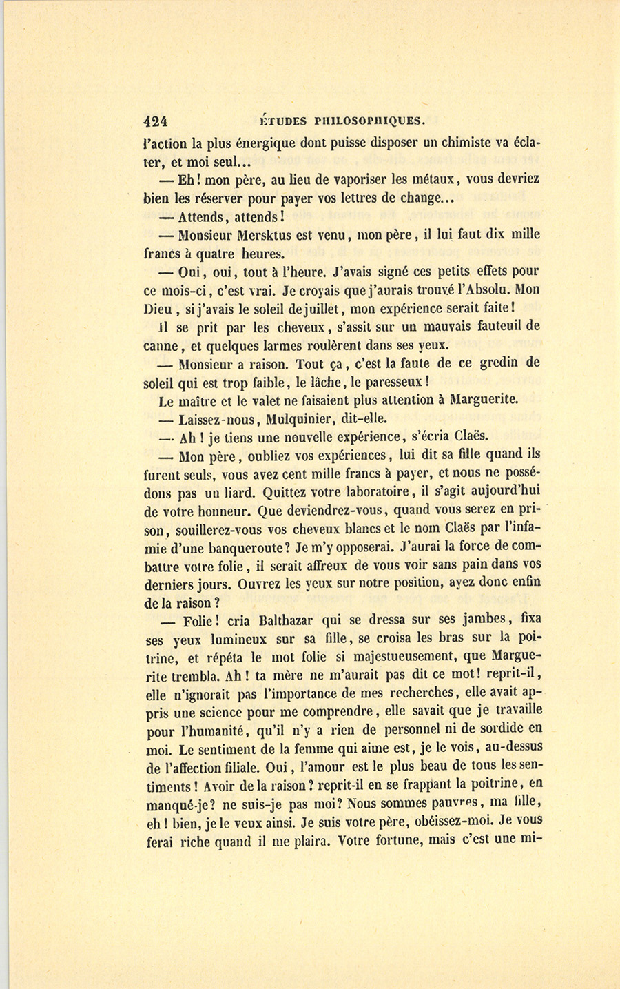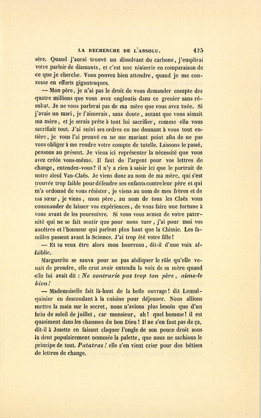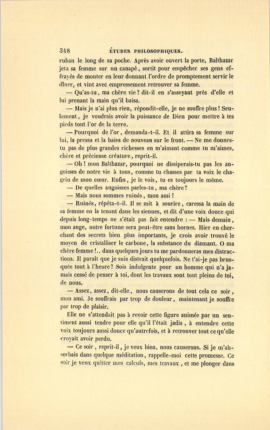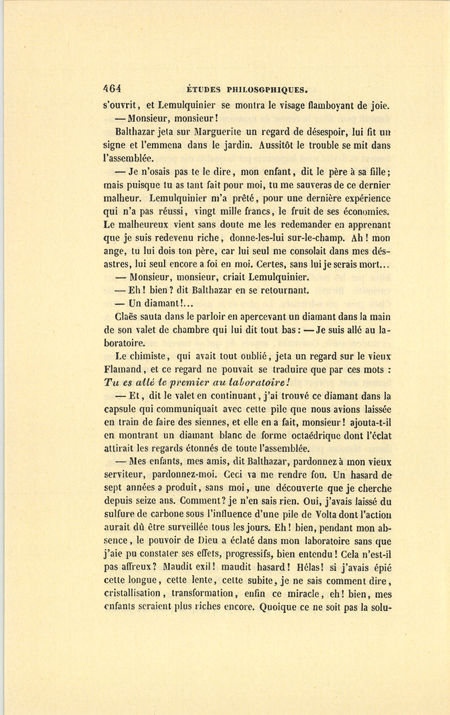 Claës sauta dans le parloir en apercevant un diamant dans la main de son valet de chambre qui lui dit tout bas : – Je suis allé au laboratoire.