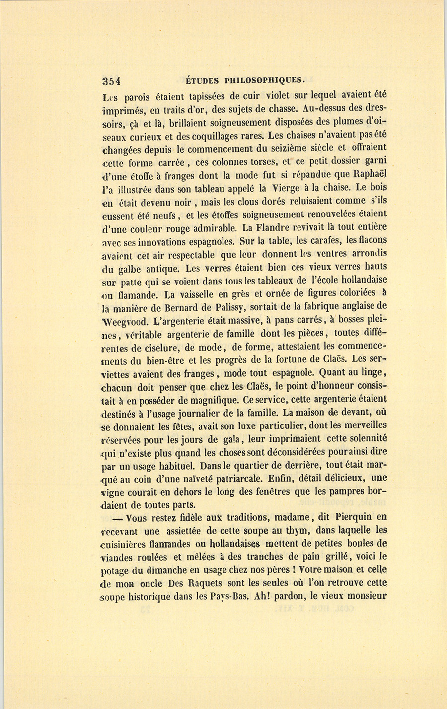 Cette pièce dont le plafond se composait de poutres apparentes, mais enjolivées par des peintures, lavées et rafraîchies tous les ans, était garnie de hauts dressoirs en chêne sur les tablettes desquels se voyaient les plus curieuses pièces de la vaisselle patrimoniale. {p. 354} Les parois étaient tapissées de cuir violet sur lequel avaient été imprimés, en traits d’or, des sujets de chasse. Au-dessus des dressoirs, çà et là, brillaient soigneusement disposées des plumes d’oiseaux curieux et des coquillages rares. Les chaises n’avaient pas été changées depuis le commencement du seizième siècle et offraient cette forme carrée, ces colonnes torses, et ce petit dossier garni d’une étoffe à franges dont la mode fut si répandue que Raphaël l’a illustrée dans son tableau appelé la Vierge à la chaise. Le bois en était devenu noir, mais les clous dorés reluisaient comme s’ils eussent été neufs, et les étoffes soigneusement renouvelées étaient d’une couleur rouge admirable. La Flandre revivait là tout entière avec ses innovations espagnoles. Sur la table, les carafes, les flacons avaient cet air respectable que leur donnent les ventres arrondis du galbe antique. Les verres étaient bien ces vieux verres hauts sur patte qui se voient dans tous les tableaux de l’école hollandaise ou flamande. La vaisselle en grès et ornée de figures coloriées à la manière de Bernard de Palissy, sortait de la fabrique anglaise de Weegvood. L’argenterie était massive, à pans carrés, à bosses pleines, véritable argenterie de famille dont les pièces, toutes différentes de ciselure, de mode, de forme, attestaient les commencements du bien-être et les progrès de la fortune de Claës. Les serviettes avaient des franges, mode tout espagnole. Quant au linge, chacun doit penser que chez les Claës, le point d’honneur consistait à en posséder de magnifique. Ce service, cette argenterie étaient destinés à l’usage journalier de la famille. La maison de devant, où se donnaient les fêtes, avait son luxe particulier, dont les merveilles réservées pour les jours de gala, leur imprimaient cette solennité qui n’existe plus quand les choses sont déconsidérées pour ainsi dire par un usage habituel. Dans le quartier de derrière, tout était marqué au coin d’une naïveté patriarcale. Enfin, détail délicieux, une vigne courait en dehors le long des fenêtres que les pampres bordaient de toutes parts.