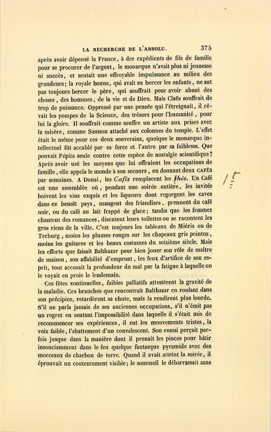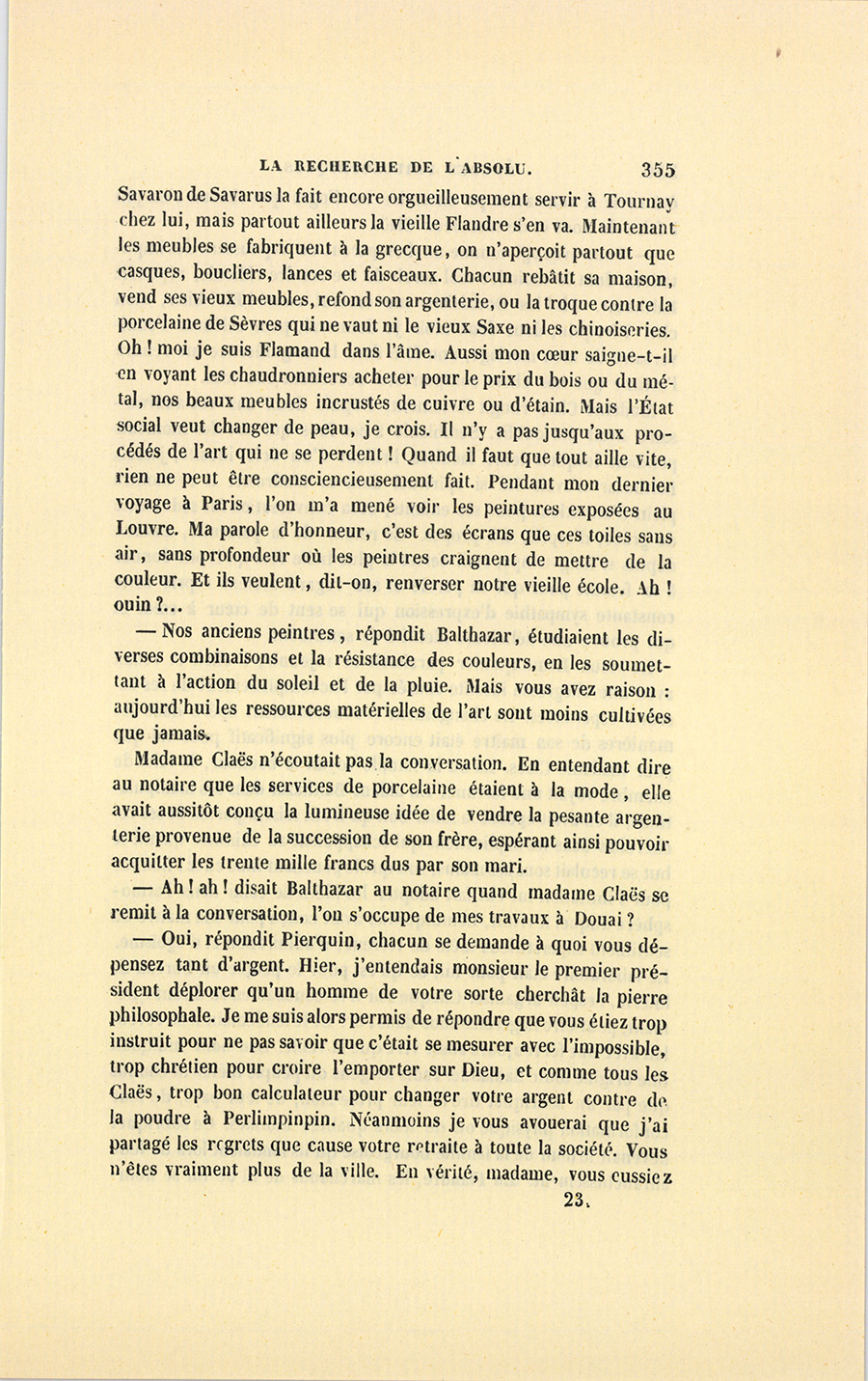– Oui, répondit Pierquin, chacun se demande à quoi vous dépensez tant d’argent. Hier, j’entendais monsieur le premier président déplorer qu’un homme de votre sorte cherchât la pierre philosophale. Je me suis alors permis de répondre que vous étiez trop instruit pour ne pas savoir que c’était se mesurer avec l’impossible, trop chrétien pour croire l’emporter sur Dieu, et comme tous les Claës, trop bon calculateur pour changer votre argent contre de la poudre à Perlimpinpin. Néanmoins je vous avouerai que j’ai partagé les regrets que cause votre retraite à toute la société. Vous n’êtes vraiment plus de la ville. En vérité, madame, vous eussiez {p. 356} été ravie si vous aviez pu entendre les éloges que chacun s’est plu à faire de vous et de monsieur Claës.