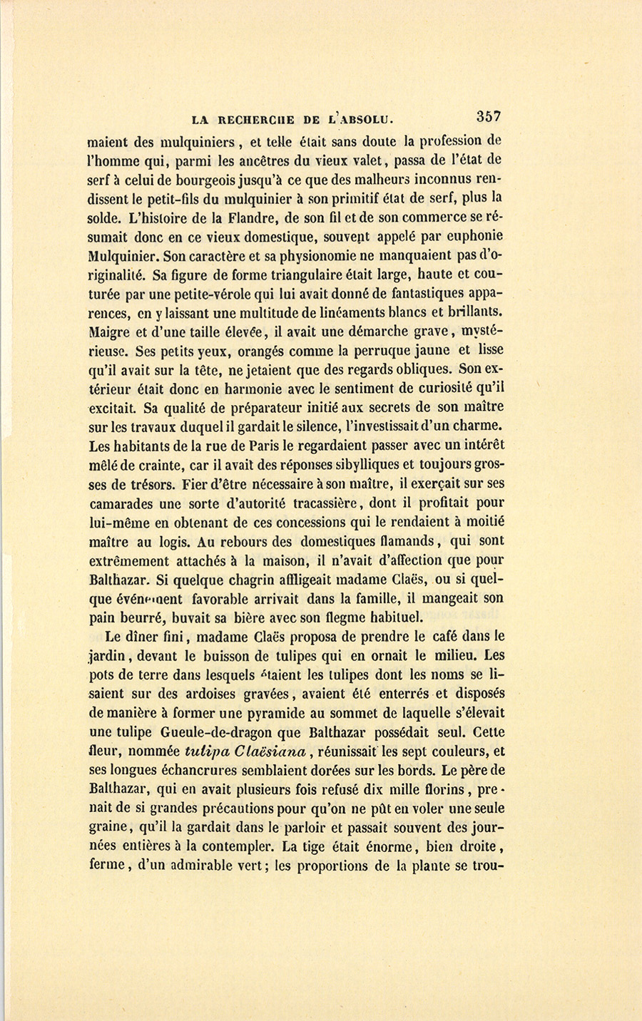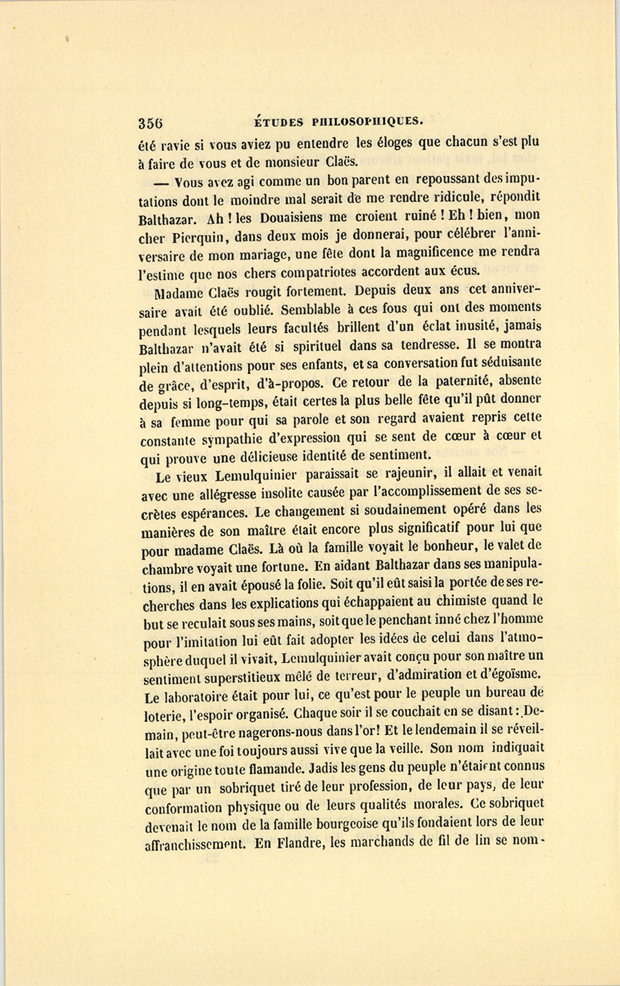 Le vieux Lemulquinier paraissait se rajeunir, il allait et venait avec une allégresse insolite causée par l’accomplissement de ses secrètes espérances. Le changement si soudainement opéré dans les manières de son maître était encore plus significatif pour lui que pour madame Claës. Là où la famille voyait le bonheur, le valet de chambre voyait une fortune. En aidant Balthazar dans ses manipulations, il en avait épousé la folie. Soit qu’il eût saisi la portée de ses recherches dans les explications qui échappaient au chimiste quand le but se reculait sous ses mains, soit que le penchant inné chez l’homme pour l’imitation lui eût fait adopter les idées de celui dans l’atmosphère duquel il vivait, Lemulquinier avait conçu pour son maître un sentiment superstitieux mêlé de terreur, d’admiration et d’égoïsme. [ill.] Le laboratoire était pour lui, ce qu’est pour le peuple un bureau de loterie, l’espoir organisé. Chaque soir il se couchait en se disant : Demain, peut-être nagerons-nous dans l’or ! Et le lendemain il se réveillait avec une foi toujours aussi vive que la veille. Son nom indiquait une origine toute flamande. Jadis les gens du peuple n’étaient connus que par un sobriquet tiré de leur profession, de leur pays, de leur conformation physique ou de leurs qualités morales. Ce sobriquet devenait le nom de la famille bourgeoise qu’ils fondaient lors de leur affranchissement. En Flandre, les marchands de fil de lin se {p. 357} nommaient des mulquiniers, et telle était sans doute la profession de l’homme qui, parmi les ancêtres du vieux valet, passa de l’état de serf à celui de bourgeois jusqu’à ce que des malheurs inconnus rendissent le petit-fils du mulquinier à son primitif état de serf, plus la solde. L’histoire de la Flandre, de son fil et de son commerce se résumait donc en ce vieux domestique, souvent appelé par euphonie Mulquinier. Son caractère et sa physionomie ne manquaient pas d’originalité. Sa figure de forme triangulaire était large, haute et couturée par une petite-vérole qui lui avait donné de fantastiques apparences, en y laissant une multitude de linéaments blancs et brillants. Maigre et d’une taille élevée, il avait une démarche grave, mystérieuse. Ses petits yeux, orangés comme la perruque jaune et lisse qu’il avait sur la tête, ne jetaient que des regards obliques. Son extérieur était donc en harmonie avec le sentiment de curiosité qu’il excitait. Sa qualité de préparateur initié aux secrets de son maître sur les travaux duquel il gardait le silence, l’investissait d’un charme. Les habitants de la rue de Paris le regardaient passer avec un intérêt mêlé de crainte, car il avait des réponses sibylliques et toujours grosses de trésors. Fier d’être nécessaire à son maître, il exerçait sur ses camarades une sorte d’autorité tracassière, dont il profitait pour lui-même en obtenant de ces concessions qui le rendaient à moitié maître au logis. Au rebours des domestiques flamands, qui sont extrêmement attachés à la maison, il n’avait d’affection que pour Balthazar. Si quelque chagrin affligeait madame Claës, ou si quelque événement favorable arrivait dans la famille, il mangeait son pain beurré, buvait sa bière avec son flegme habituel.