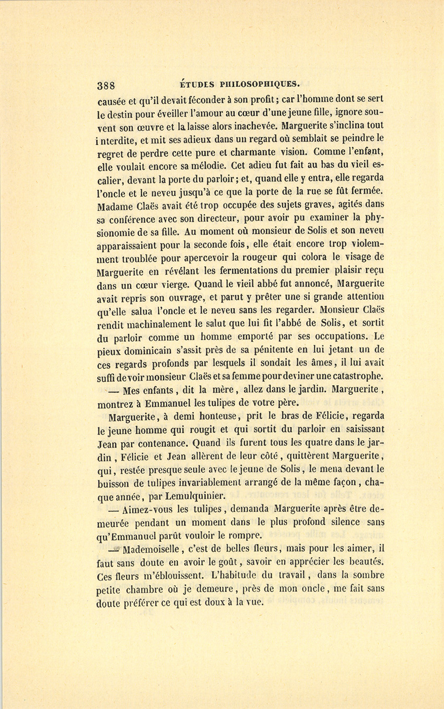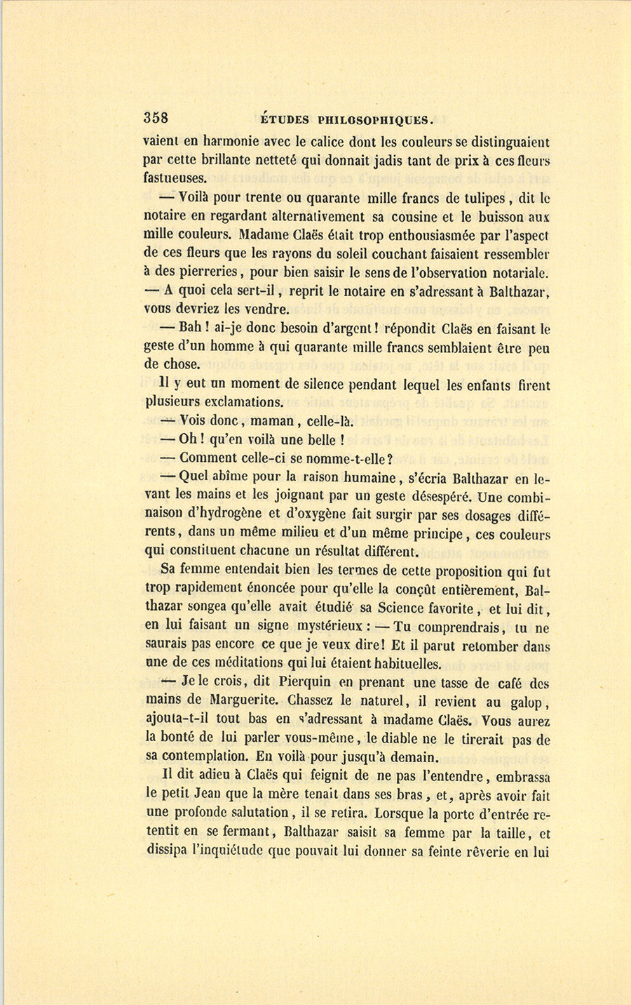 Puis Balthazar se leva, vint à Pierquin, et lui dit avec cette affectueuse courtoisie qui le caractérisait : – Mon cher, vous avez peut-être quelque chose à me demander ? Il lui donna le bras et l’entraîna dans le jardin, en ajoutant : – Venez voir mes tulipes ?…