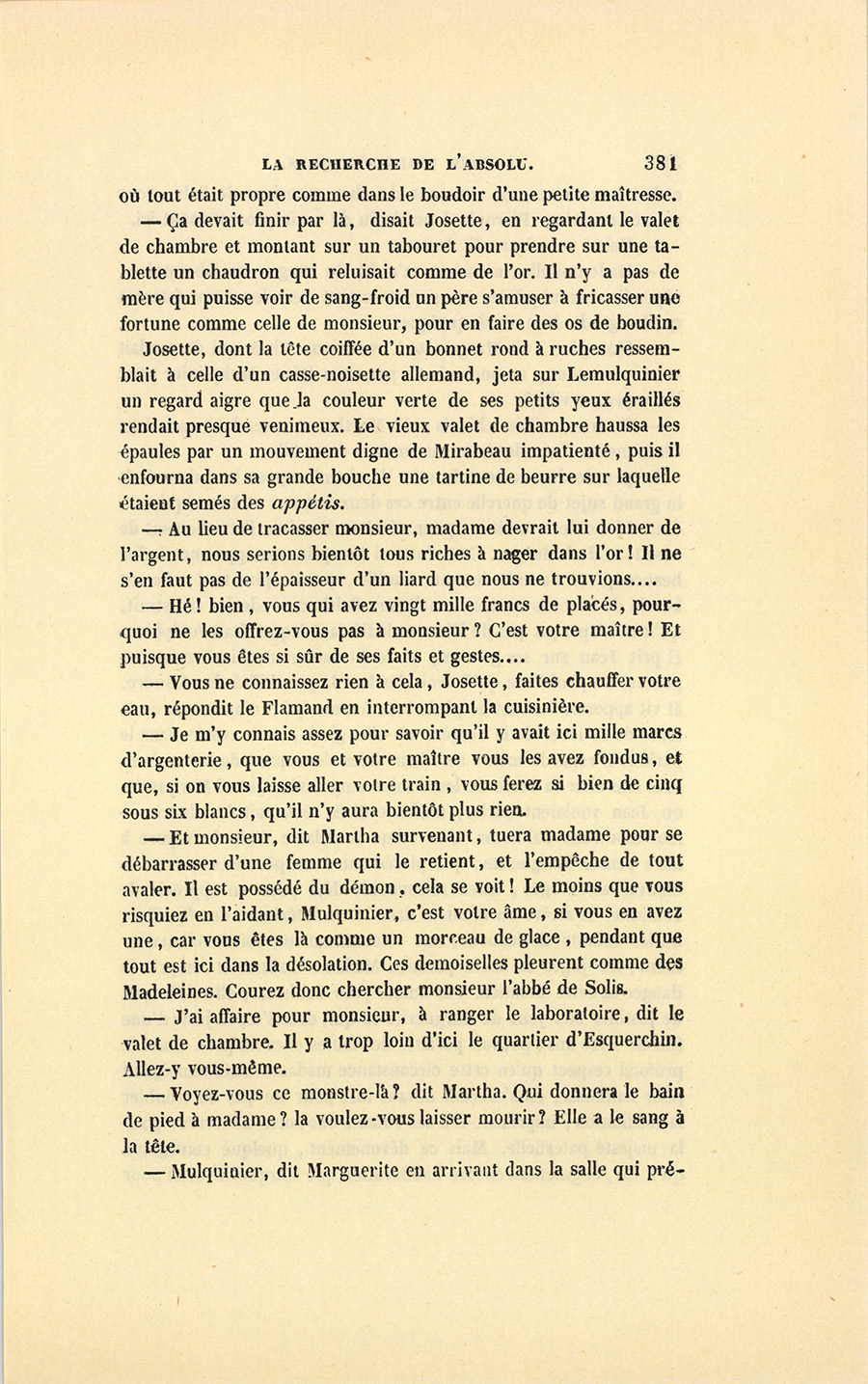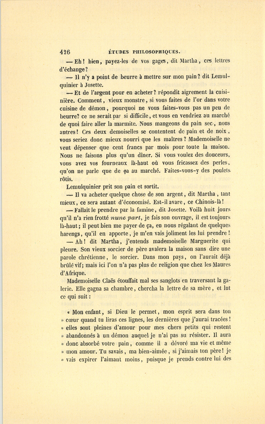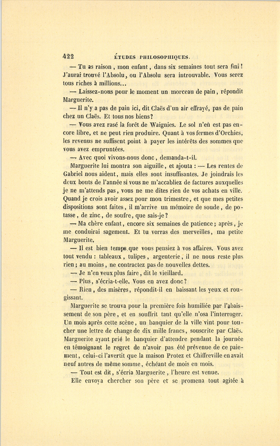 – Ah ! dit-elle, je me jetterais dans le feu de l’enfer qui attise tes fourneaux pour entendre ce mot de ta bouche et pour te voir ainsi. En entendant le pas de sa fille dans l’antichambre, elle s’y élança vivement. – Que voulez-vous, Marguerite ? dit-elle à sa fille aînée.