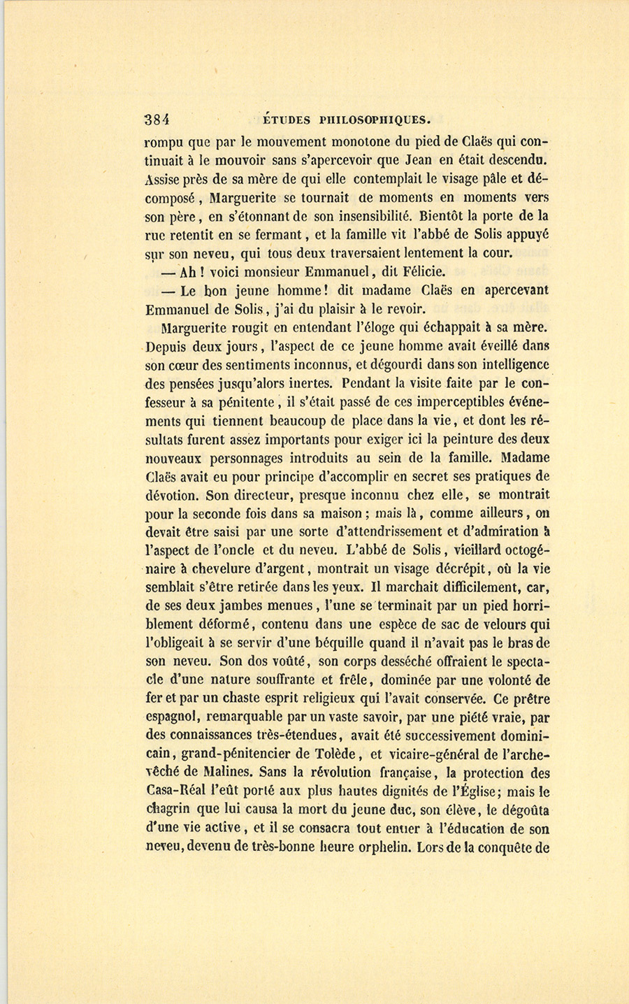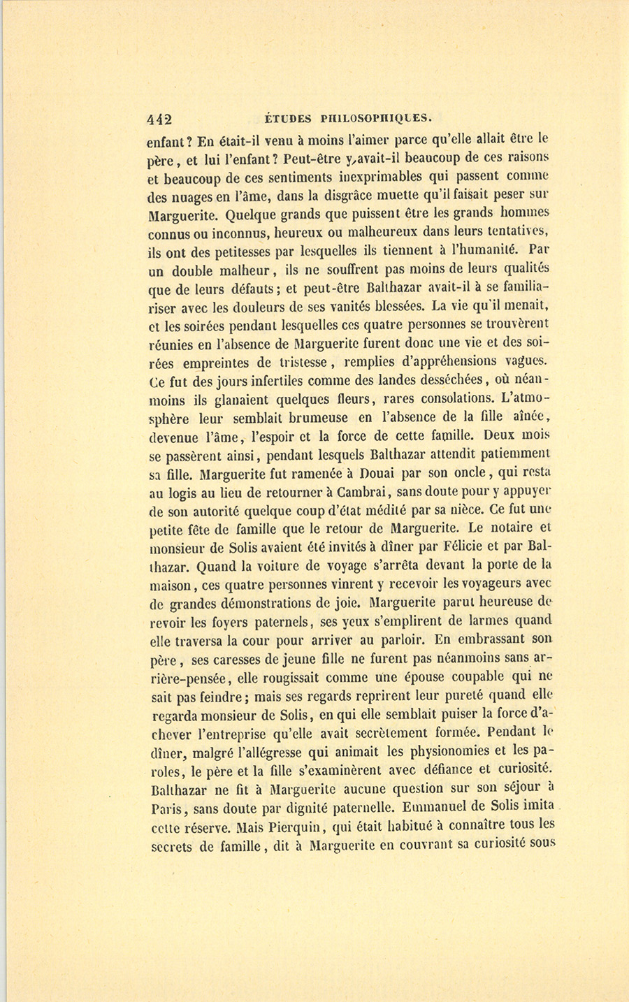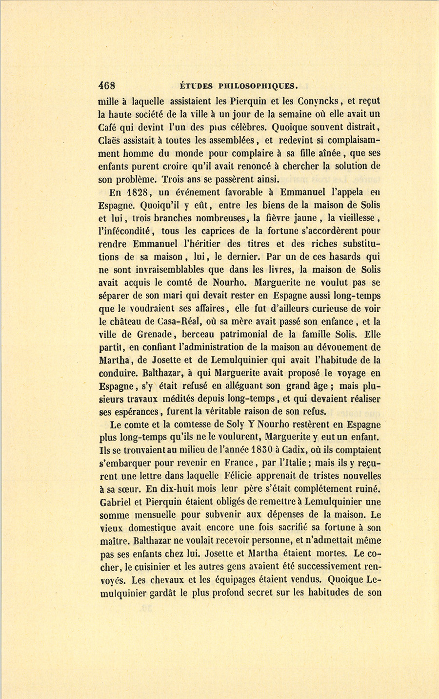 En 1828, un événement favorable à Emmanuel l’appela en Espagne. Quoiqu’il y eût, entre les biens de la maison de Solis et lui, trois branches nombreuses, la fièvre jaune, la vieillesse, l’infécondité, tous les caprices de la fortune s’accordèrent pour rendre Emmanuel l’héritier des titres et des riches substitutions de sa maison, lui, le dernier. Par un de ces hasards qui ne sont invraisemblables que dans les livres, la maison de Solis avait acquis le comté de Nourho. Marguerite ne voulut pas se séparer de son mari qui devait rester en Espagne aussi long-temps que le voudraient ses affaires, elle fut d’ailleurs curieuse de voir le château de Casa-Réal, où sa mère avait passé son enfance, et la ville de Grenade, berceau patrimonial de la famille Solis. Elle partit, en confiant l’administration de la maison au dévouement de Martha, de Josette et de Lemulquinier qui avait l’habitude de la conduire. Balthazar, à qui Marguerite avait proposé le voyage en Espagne, s’y était refusé en alléguant son grand âge ; mais plusieurs travaux médités depuis long-temps, et qui devaient réaliser ses espérances, furent la véritable raison de son refus.