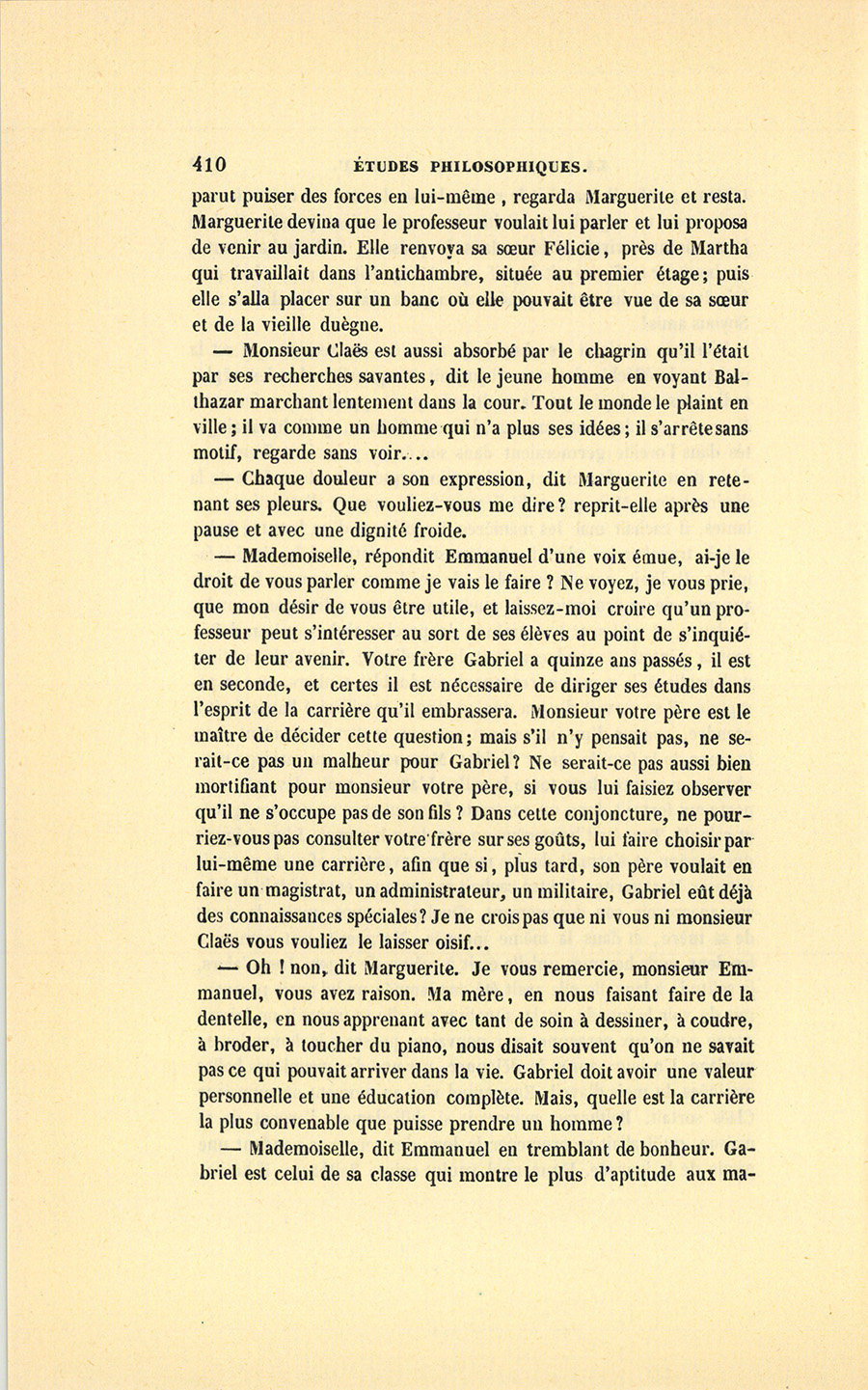 Balthazar leva les yeux au ciel, regarda sa fille, se croisa les bras, et dit après une pause pendant laquelle son visage reprit une expression que ses enfants ne lui avaient pas vue depuis dix ans : – Que n’es-tu là, Pépita, pour admirer notre enfant ! Il serra Marguerite avec force, sans pouvoir prononcer une parole, et rentra. – Mes enfants, dit-il avec cette noblesse de maintien qui en faisait autrefois un des hommes les plus imposants, nous devons tous des remercîments et de la reconnaissance à ma fille Marguerite, pour la sagesse et le courage avec lesquels elle a rempli mes intentions, exécuté mes plans, lorsque, trop absorbé par mes travaux, je lui ai remis les rênes de notre administration domestique.