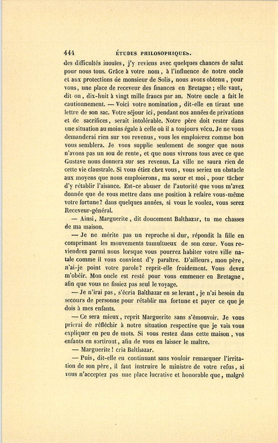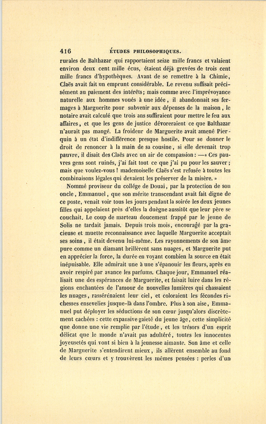 Marguerite accepta l’assistance du notaire, mais seulement dans tout ce qui concernait sa profession, afin de ne compromettre en rien ni sa dignité de femme, ni l’avenir de sa sœur, ni les déterminations de son père. Ce jour même elle confia sa sœur à la garde de Josette et de Martha, qui se vouèrent corps et âme à leur jeune maîtresse, en en secondant les plans d’économie. Marguerite partit aussitôt pour Waignies où elle commença ses opérations qui furent savamment dirigées par Pierquin. Le dévouement s’était chiffré dans l’esprit du notaire comme une excellente spéculation, ses soins, ses peines furent alors en quelque sorte une mise de fonds qu’il ne voulut point épargner. D’abord, il tenta d’éviter à Marguerite la peine de faire défricher et de labourer les terres destinées aux fermes. Il avisa trois jeunes fils de fermiers riches qui désiraient s’établir, il les séduisit par la perspective que leur offrait la richesse de ces terrains, et réussit à leur faire prendre à bail les trois fermes qui allaient être construites. Moyennant l’abandon du prix de la ferme pendant trois ans, les fermiers s’engagèrent à en donner dix mille francs de loyer à la quatrième année, douze mille à la sixième, et quinze mille pendant le reste du bail ; à creuser les fossés, faire les plantations et acheter les bestiaux. Pendant que les fermes se bâtirent, les fermiers vinrent défricher leurs terres. Quatre ans après le départ de Balthazar, Marguerite avait déjà {p. 455} presque rétabli la fortune de son frère et de sa sœur. Deux cent mille francs suffirent à payer toutes les constructions. Ni les secours, ni les conseils ne manquèrent à cette courageuse fille dont la conduite excitait l’admiration de la ville. Marguerite surveilla ses bâtisses, l’exécution de ses marchés et de ses baux avec ce bon sens, cette activité, cette constance que savent déployer les femmes quand elles sont animées par un grand sentiment. Dès la cinquième année, elle put consacrer trente mille francs de revenu que donnèrent les fermes, les rentes de son frère et le produit des biens paternels, à l’acquittement des capitaux hypothéqués, et à la réparation des dommages que la passion de Balthazar avait faits dans sa maison. L’amortissement devait donc aller rapidement par la décroissance des intérêts. Emmanuel de Solis offrit d’ailleurs à Marguerite les cent mille francs qui lui restaient sur la succession de son oncle et qu’elle n’avait pas employés, en y joignant une vingtaine de mille francs de ses économies, en sorte que, dès la troisième année de sa gestion, elle put acquitter une assez forte somme de dettes. Cette vie de courage, de privations et de dévouement ne se démentit point durant cinq années ; mais tout fut d’ailleurs succès et réussite, sous l’administration et l’influence de Marguerite.