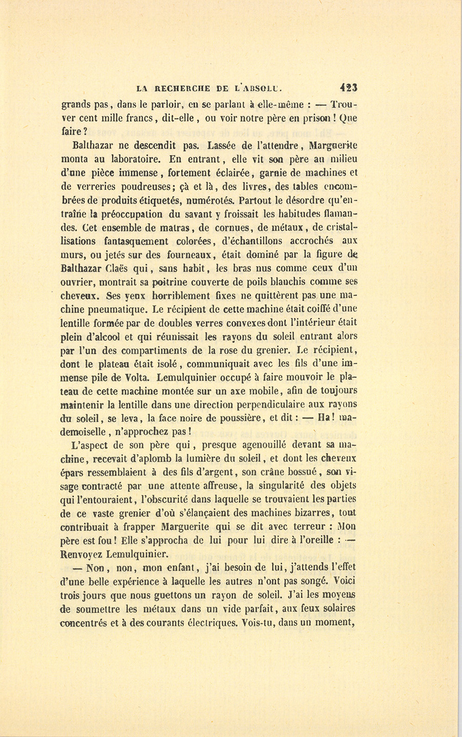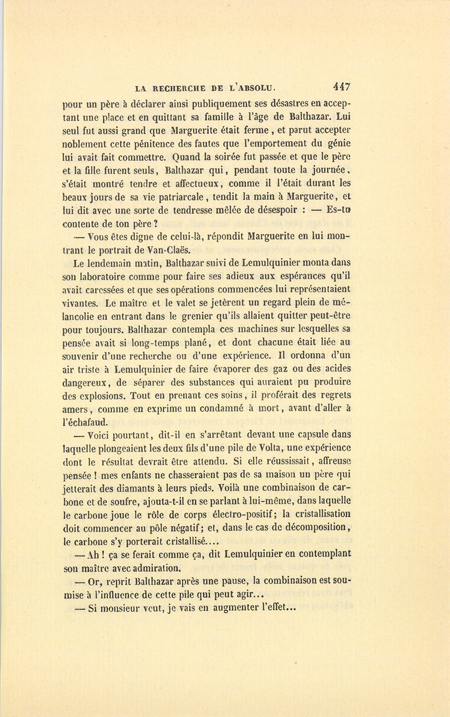 – Mes enfants, mes amis, dit Balthazar, pardonnez à mon vieux serviteur, pardonnez-moi. Ceci va me rendre fou. Un hasard de sept années a produit, sans moi, une découverte que je cherche depuis seize ans. Comment ? je n’en sais rien. Oui, j’avais laissé du sulfure de carbone sous l’influence d’une pile de Volta dont l’action aurait dû être surveillée tous les jours. Eh ! bien, pendant mon absence, le pouvoir de Dieu a éclaté dans mon laboratoire sans que j’aie pu constater ses effets, progressifs, bien entendu ! Cela n’est-il pas affreux ? Maudit exil ! maudit hasard ! Hélas ! si j’avais épié cette longue, cette lente, cette subite, je ne sais comment dire, cristallisation, transformation, enfin ce miracle, eh ! bien, mes enfants seraient plus riches encore. Quoique ce ne soit pas la {p. 465} solution du problème que je cherche, au moins les premiers rayons de ma gloire auraient lui sur mon pays, et ce moment que nos affections satisfaites rendent si ardent de bonheur serait encore échauffé par le soleil de la Science.