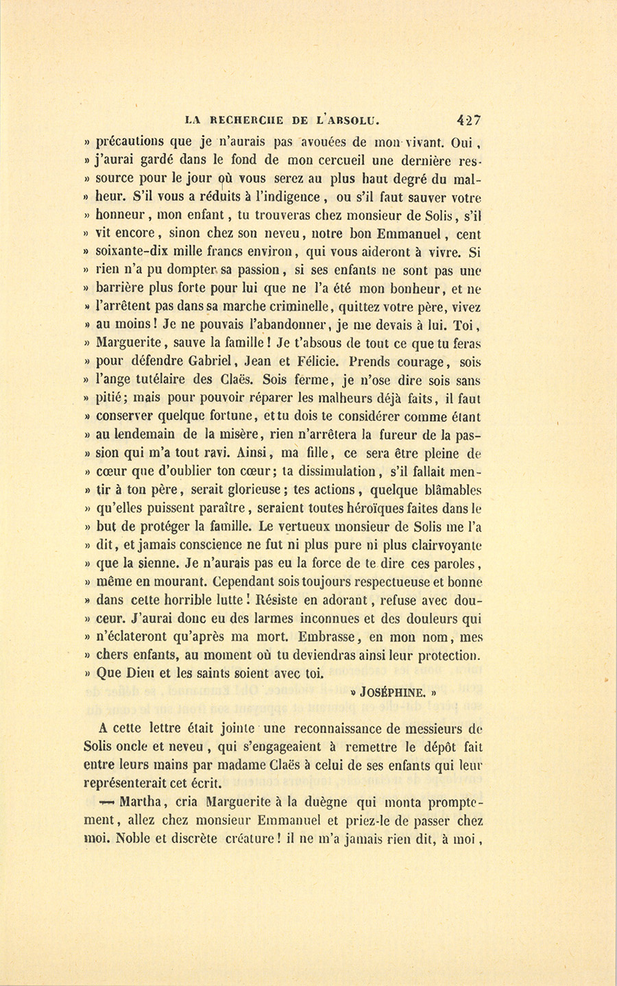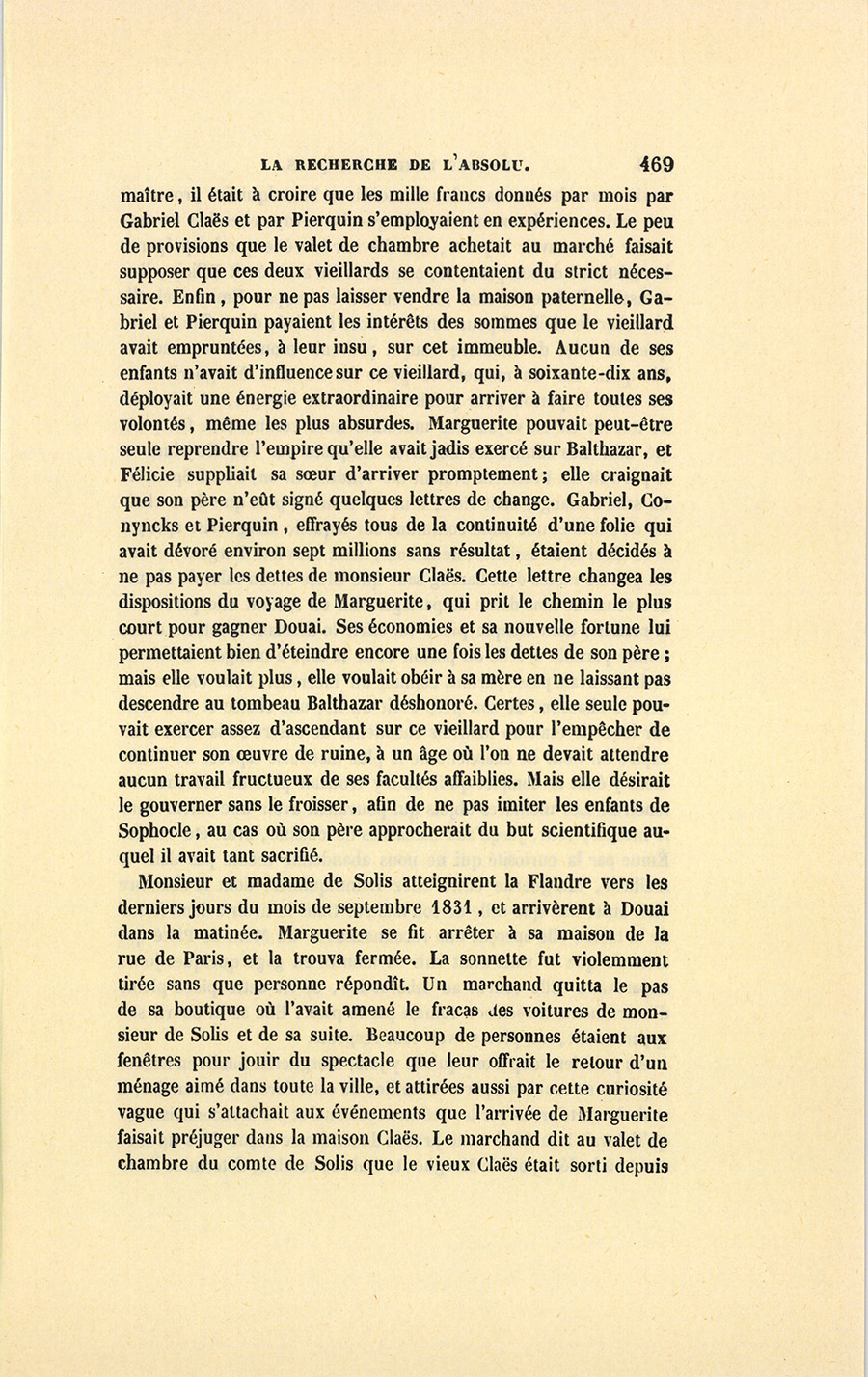 Le comte et la comtesse de Soly Y Nourho restèrent en Espagne plus long-temps qu’ils ne le voulurent, Marguerite y eut un enfant. Ils se trouvaient au milieu de l’année 1830 à Cadix, où ils comptaient s’embarquer pour revenir en France, par l’Italie ; mais ils y reçurent une lettre dans laquelle Félicie apprenait de tristes nouvelles à sa sœur. En dix-huit mois leur père s’était complétement ruiné. Gabriel et Pierquin étaient obligés de remettre à Lemulquinier une somme mensuelle pour subvenir aux dépenses de la maison. Le vieux domestique avait encore une fois sacrifié sa fortune à son maître. Balthazar ne voulait recevoir personne, et n’admettait même pas ses enfants chez lui. Josette et Martha étaient mortes. Le cocher, le cuisinier et les autres gens avaient été successivement renvoyés. Les chevaux et les équipages étaient vendus. Quoique Lemulquinier gardât le plus profond secret sur les habitudes de son {p. 469} maître, il était à croire que les mille francs donnés par mois par Gabriel Claës et par Pierquin s’employaient en expériences. Le peu de provisions que le valet de chambre achetait au marché faisait supposer que ces deux vieillards se contentaient du strict nécessaire. Enfin, pour ne pas laisser vendre la maison paternelle, Gabriel et Pierquin payaient les intérêts des sommes que le vieillard avait empruntées, à leur insu, sur cet immeuble. Aucun de ses enfants n’avait d’influence sur ce vieillard, qui, à soixante-dix ans, déployait une énergie extraordinaire pour arriver à faire toutes ses volontés, même les plus absurdes. Marguerite pouvait peut-être seule reprendre l’empire qu’elle avait jadis exercé sur Balthazar, et Félicie suppliait sa sœur d’arriver promptement ; elle craignait que son père n’eût signé quelques lettres de change. Gabriel, Conyncks et Pierquin, effrayés tous de la continuité d’une folie qui avait dévoré environ sept millions sans résultat, étaient décidés à ne pas payer les dettes de monsieur Claës. Cette lettre changea les dispositions du voyage de Marguerite, qui prit le chemin le plus court pour gagner Douai. Ses économies et sa nouvelle fortune lui permettaient bien d’éteindre encore une fois les dettes de son père ; mais elle voulait plus, elle voulait obéir à sa mère en ne laissant pas descendre au tombeau Balthazar déshonoré. Certes, elle seule pouvait exercer assez d’ascendant sur ce vieillard pour l’empêcher de continuer son œuvre de ruine, à un âge où l’on ne devait attendre aucun travail fructueux de ses facultés affaiblies. Mais elle désirait le gouverner sans le froisser, afin de ne pas imiter les enfants de Sophocle, au cas où son père approcherait du but scientifique auquel il avait tant sacrifié.