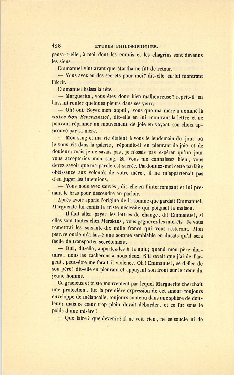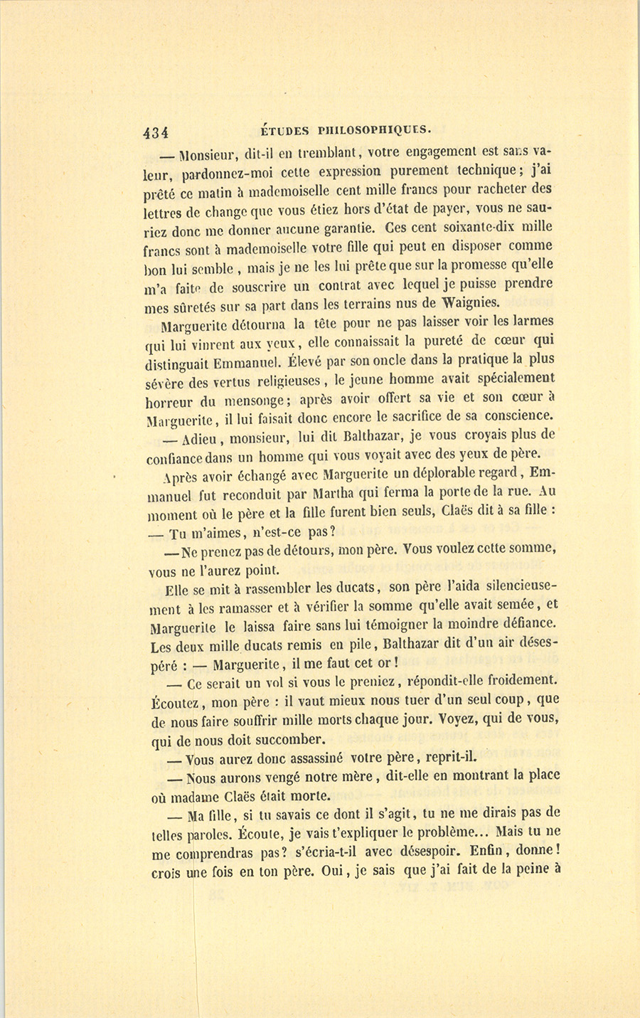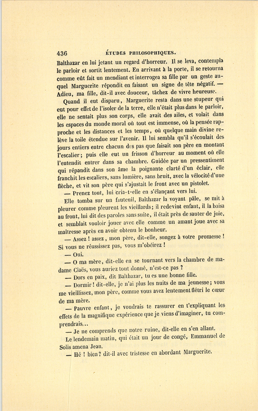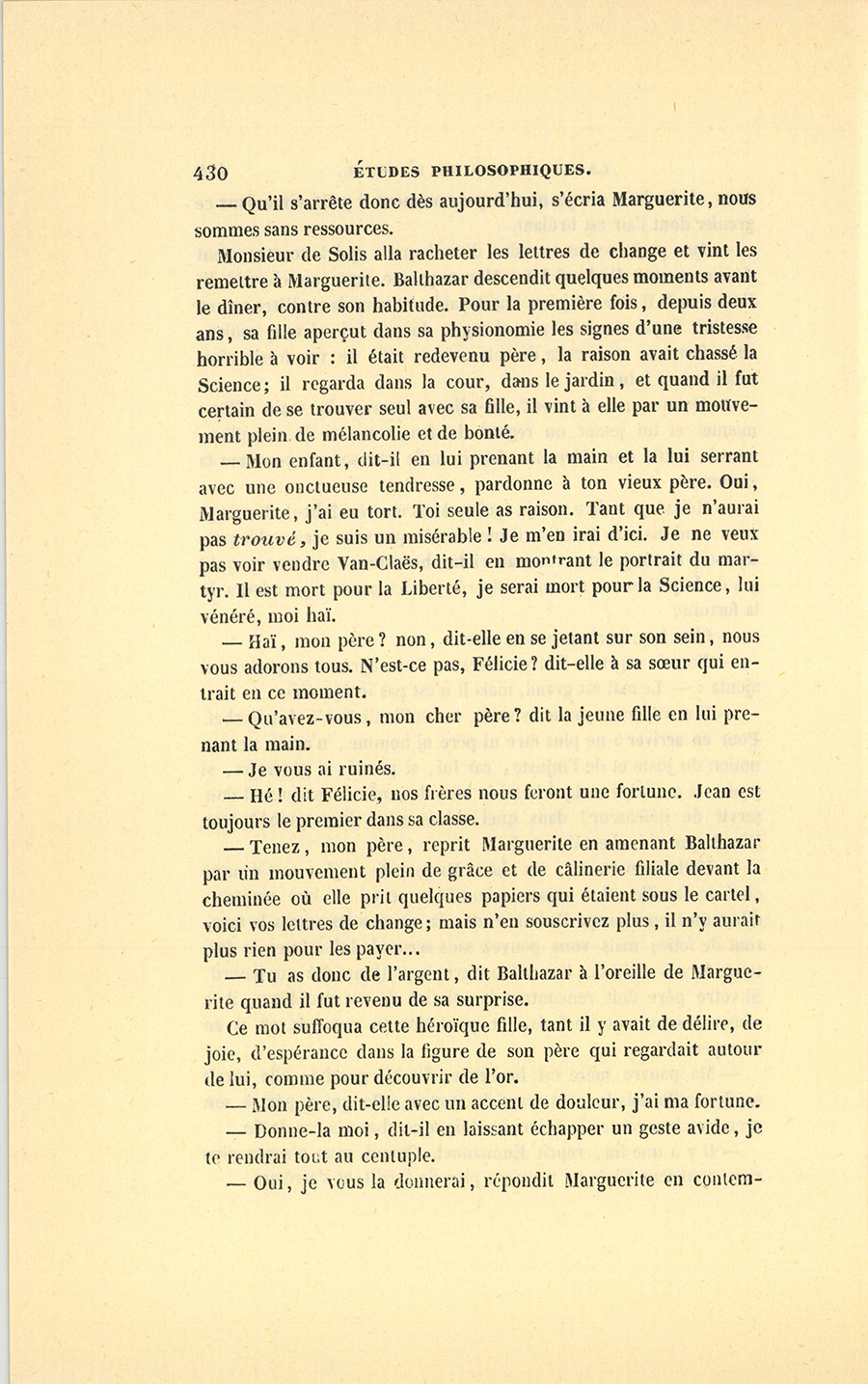 Ce mot excita dans l’assemblée le frissonnement que, dans certains rôles, Talma causait aux masses attentives. Balthazar s’était assis en se disant à voix basse : Je ne dois être que père aujourd’hui. Marguerite entendit le mot, s’avança, saisit la main de son père et la baisa respectueusement.