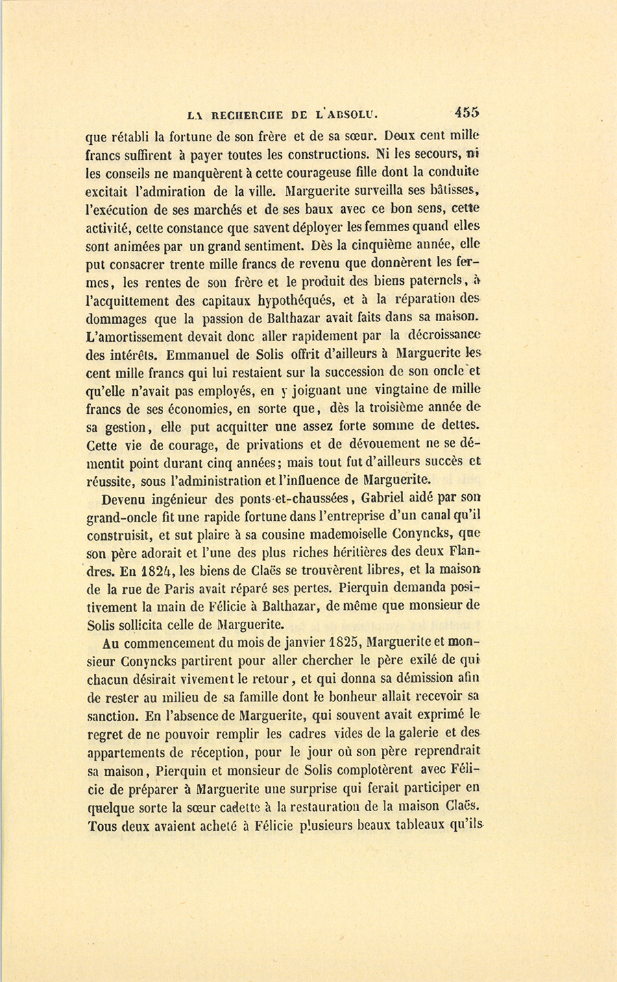 Devenu ingénieur des ponts-et-chaussées, Gabriel aidé par son grand-oncle fit une rapide fortune dans l’entreprise d’un canal qu’il construisit, et sut plaire à sa cousine mademoiselle Conyncks, que son père adorait et l’une des plus riches héritières des deux Flandres. En 1824, les biens de Claës se trouvèrent libres, et la maison de la rue de Paris avait réparé ses pertes. Pierquin demanda positivement la main de Félicie à Balthazar, de même que monsieur de Solis sollicita celle de Marguerite.