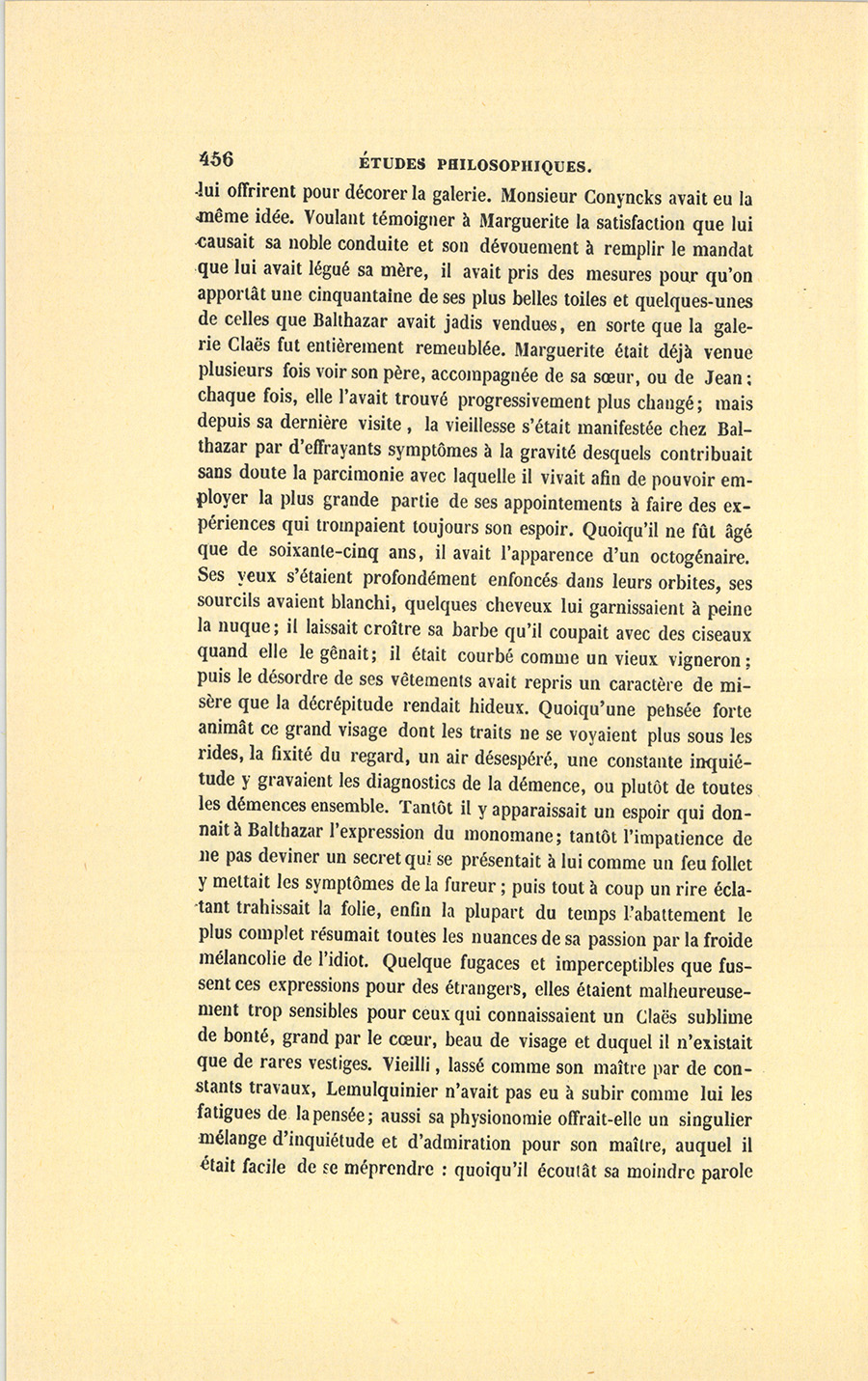 Au commencement du mois de janvier 1825, Marguerite et monsieur Conyncks partirent pour aller chercher le père exilé de qui chacun désirait vivement le retour, et qui donna sa démission afin de rester au milieu de sa famille dont le bonheur allait recevoir sa sanction. En l’absence de Marguerite, qui souvent avait exprimé le regret de ne pouvoir remplir les cadres vides de la galerie et des appartements de réception, pour le jour où son père reprendrait sa maison, Pierquin et monsieur de Solis complotèrent avec Félicie de préparer à Marguerite une surprise qui ferait participer en quelque sorte la sœur cadette à la restauration de la maison Claës. Tous deux avaient acheté à Félicie plusieurs beaux tableaux qu’ils {p. 456} lui offrirent pour décorer la galerie. Monsieur Conyncks avait eu la même idée. Voulant témoigner à Marguerite la satisfaction que lui causait sa noble conduite et son dévouement à remplir le mandat que lui avait légué sa mère, il avait pris des mesures pour qu’on apportât une cinquantaine de ses plus belles toiles et quelques-unes de celles que Balthazar avait jadis vendues, en sorte que la galerie Claës fut entièrement remeublée. Marguerite était déjà venue plusieurs fois voir son père, accompagnée de sa sœur, ou de Jean ; chaque fois, elle l’avait trouvé progressivement plus changé ; mais depuis sa dernière visite, la vieillesse s’était manifestée chez Balthazar par d’effrayants symptômes à la gravité desquels contribuait sans doute la parcimonie avec laquelle il vivait afin de pouvoir employer la plus grande partie de ses appointements à faire des expériences qui trompaient toujours son espoir. Quoiqu’il ne fût âgé que de soixante-cinq ans, il avait l’apparence d’un octogénaire. Ses yeux s’étaient profondément enfoncés dans leurs orbites, ses sourcils avaient blanchi, quelques cheveux lui garnissaient à peine la nuque ; il laissait croître sa barbe qu’il coupait avec des ciseaux quand elle le gênait ; il était courbé comme un vieux vigneron ; puis le désordre de ses vêtements avait repris un caractère de misère que la décrépitude rendait hideux. Quoiqu’une pensée forte animât ce grand visage dont les traits ne se voyaient plus sous les rides, la fixité du regard, un air désespéré, une constante inquiétude y gravaient les diagnostics de la démence, ou plutôt de toutes les démences ensemble. Tantôt il y apparaissait un espoir qui donnait à Balthazar l’expression du monomane ; tantôt l’impatience de ne pas deviner un secret qui se présentait à lui comme un feu follet y mettait les symptômes de la fureur ; puis tout à coup un rire éclatant trahissait la folie, enfin la plupart du temps l’abattement le plus complet résumait toutes les nuances de sa passion par la froide mélancolie de l’idiot. Quelque fugaces et imperceptibles que fussent ces expressions pour des étrangers, elles étaient malheureusement trop sensibles pour ceux qui connaissaient un Claës sublime de bonté, grand par le cœur, beau de visage et duquel il n’existait que de rares vestiges. Vieilli, lassé comme son maître par de constants travaux, Lemulquinier n’avait pas eu à subir comme lui les fatigues de la pensée ; aussi sa physionomie offrait-elle un singulier mélange d’inquiétude et d’admiration pour son maître, auquel il était facile de se méprendre : quoiqu’il écoutât sa moindre parole {p. 457} avec respect, qu’il suivît ses moindres mouvements avec une sorte de tendresse, il avait soin du savant comme une mère a soin d’un enfant ; souvent il pouvait avoir l’air de le protéger, parce qu’il le protégeait véritablement dans les vulgaires nécessités de la vie auxquelles Balthazar ne pensait jamais. Ces deux vieillards enveloppés par une idée, confiants dans la réalité de leur espoir, agités par le même souffle, l’un représentant l’enveloppe et l’autre l’âme de leur existence commune, formaient un spectacle à la fois horrible et attendrissant. Lorsque Marguerite et monsieur Conyncks arrivèrent, ils trouvèrent Claës établi dans une auberge, son successeur ne s’était pas fait attendre et avait déjà pris possession de la place.