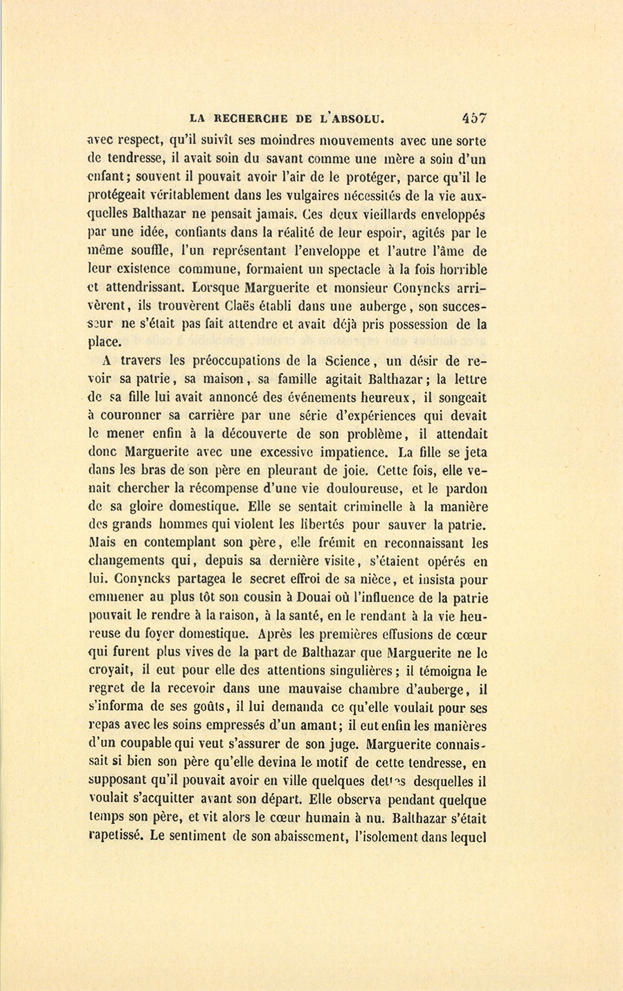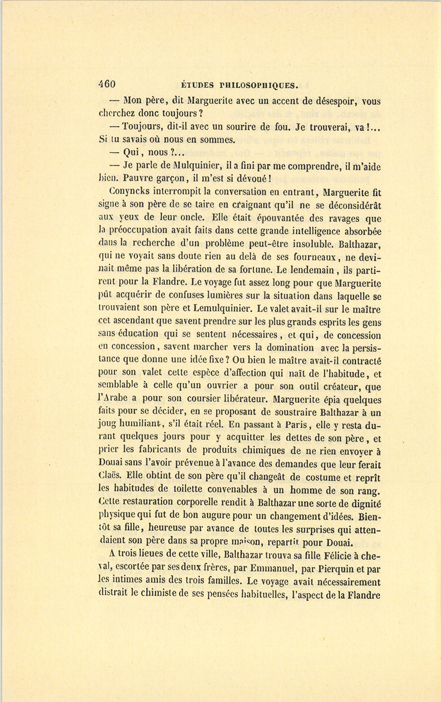 Conyncks interrompit la conversation en entrant, Marguerite fit signe à son père de se taire en craignant qu’il ne se déconsidérât aux yeux de leur oncle. Elle était épouvantée des ravages que la préoccupation avait faits dans cette grande intelligence absorbée dans la recherche d’un problème peut-être insoluble. Balthazar, qui ne voyait sans doute rien au delà de ses fourneaux, ne devinait même pas la libération de sa fortune. Le lendemain, ils partirent pour la Flandre. Le voyage fut assez long pour que Marguerite pût acquérir de confuses lumières sur la situation dans laquelle se trouvaient son père et Lemulquinier. Le valet avait-il sur le maître cet ascendant que savent prendre sur les plus grands esprits les gens sans éducation qui se sentent nécessaires, et qui, de concession en concession, savent marcher vers la domination avec la persistance que donne une idée fixe ? Ou bien le maître avait-il contracté pour son valet cette espèce d’affection qui naît de l’habitude, et semblable à celle qu’un ouvrier a pour son outil créateur, que l’Arabe a pour son coursier libérateur. Marguerite épia quelques faits pour se décider, en se proposant de soustraire Balthazar à un joug humiliant, s’il était réel. En passant à Paris, elle y resta durant quelques jours pour y acquitter les dettes de son père, et prier les fabricants de produits chimiques de ne rien envoyer à Douai sans l’avoir prévenue à l’avance des demandes que leur ferait Claës. Elle obtint de son père qu’il changeât de costume et reprît les habitudes de toilette convenables à un homme de son rang. Cette restauration corporelle rendit à Balthazar une sorte de dignité physique qui fut de bon augure pour un changement d’idées. Bientôt sa fille, heureuse par avance de toutes les surprises qui attendaient son père dans sa propre maison, repartit pour Douai.