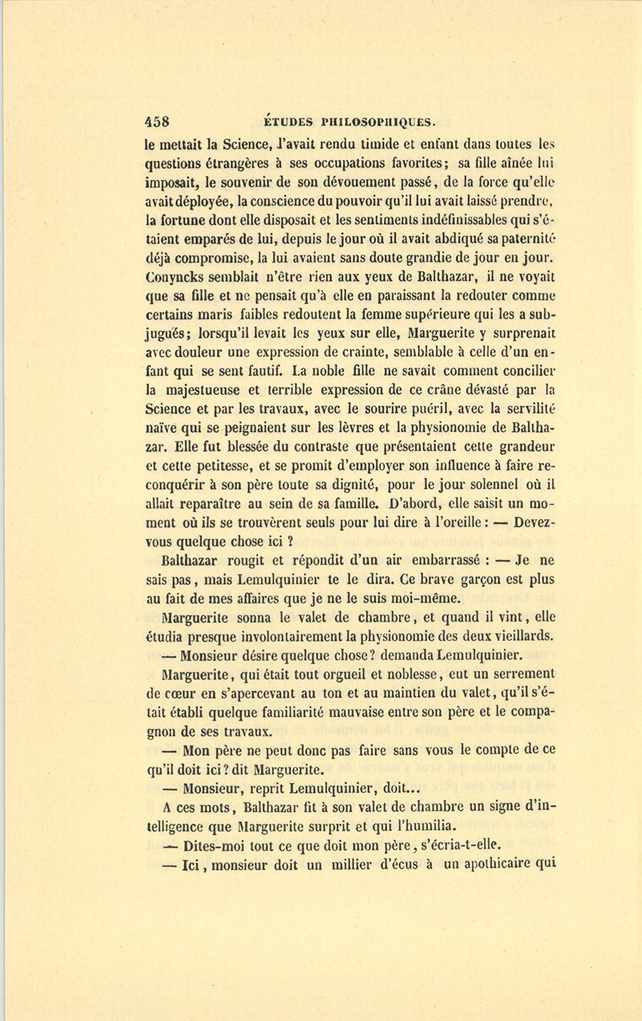 À travers les préoccupations de la Science, un désir de revoir sa patrie, sa maison, sa famille agitait Balthazar ; la lettre de sa fille lui avait annoncé des événements heureux, il songeait à couronner sa carrière par une série d’expériences qui devait le mener enfin à la découverte de son problème, il attendait donc Marguerite avec une excessive impatience. La fille se jeta dans les bras de son père en pleurant de joie. Cette fois, elle venait chercher la récompense d’une vie douloureuse, et le pardon de sa gloire domestique. Elle se sentait criminelle à la manière des grands hommes qui violent les libertés pour sauver la patrie. Mais en contemplant son père, elle frémit en reconnaissant les changements qui, depuis sa dernière visite, s’étaient opérés en lui. Conyncks partagea le secret effroi de sa nièce, et insista pour emmener au plus tôt son cousin à Douai où l’influence de la patrie pouvait le rendre à la raison, à la santé, en le rendant à la vie heureuse du foyer domestique. Après les premières effusions de cœur qui furent plus vives de la part de Balthazar que Marguerite ne le croyait, il eut pour elle des attentions singulières ; il témoigna le regret de la recevoir dans une mauvaise chambre d’auberge, il s’informa de ses goûts, il lui demanda ce qu’elle voulait pour ses repas avec les soins empressés d’un amant ; il eut enfin les manières d’un coupable qui veut s’assurer de son juge. Marguerite connaissait si bien son père qu’elle devina le motif de cette tendresse, en supposant qu’il pouvait avoir en ville quelques dettes desquelles il voulait s’acquitter avant son départ. Elle observa pendant quelque temps son père, et vit alors le cœur humain à nu. Balthazar s’était rapetissé. Le sentiment de son abaissement, l’isolement dans lequel {p. 458} le mettait la Science, l’avait rendu timide et enfant dans toutes les questions étrangères à ses occupations favorites ; sa fille aînée lui imposait, le souvenir de son dévouement passé, de la force qu’elle avait déployée, la conscience du pouvoir qu’il lui avait laissé prendre, la fortune dont elle disposait et les sentiments indéfinissables qui s’étaient emparés de lui, depuis le jour où il avait abdiqué sa paternité déjà compromise, la lui avaient sans doute grandie de jour en jour. Conyncks semblait n’être rien aux yeux de Balthazar, il ne voyait que sa fille et ne pensait qu’à elle en paraissant la redouter comme certains maris faibles redoutent la femme supérieure qui les a subjugués ; lorsqu’il levait les yeux sur elle, Marguerite y surprenait avec douleur une expression de crainte, semblable à celle d’un enfant qui se sent fautif. La noble fille ne savait comment concilier la majestueuse et terrible expression de ce crâne dévasté par la Science et par les travaux, avec le sourire puéril, avec la servilité naïve qui se peignaient sur les lèvres et la physionomie de Balthazar. Elle fut blessée du contraste que présentaient cette grandeur et cette petitesse, et se promit d’employer son influence à faire reconquérir à son père toute sa dignité, pour le jour solennel où il allait reparaître au sein de sa famille. D’abord, elle saisit un moment où ils se trouvèrent seuls pour lui dire à l’oreille : – Devez-vous quelque chose ici ?