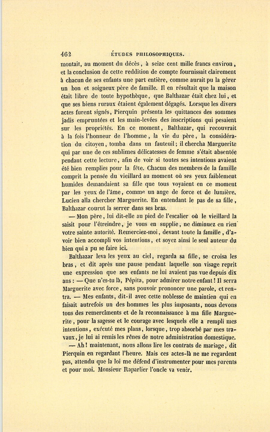 – Mon père, lui dit-elle au pied de l’escalier où le vieillard la saisit pour l’étreindre, je vous en supplie, ne diminuez en rien votre sainte autorité. Remerciez-moi, devant toute la famille, d’avoir bien accompli vos intentions, et soyez ainsi le seul auteur du bien qui a pu se faire ici.