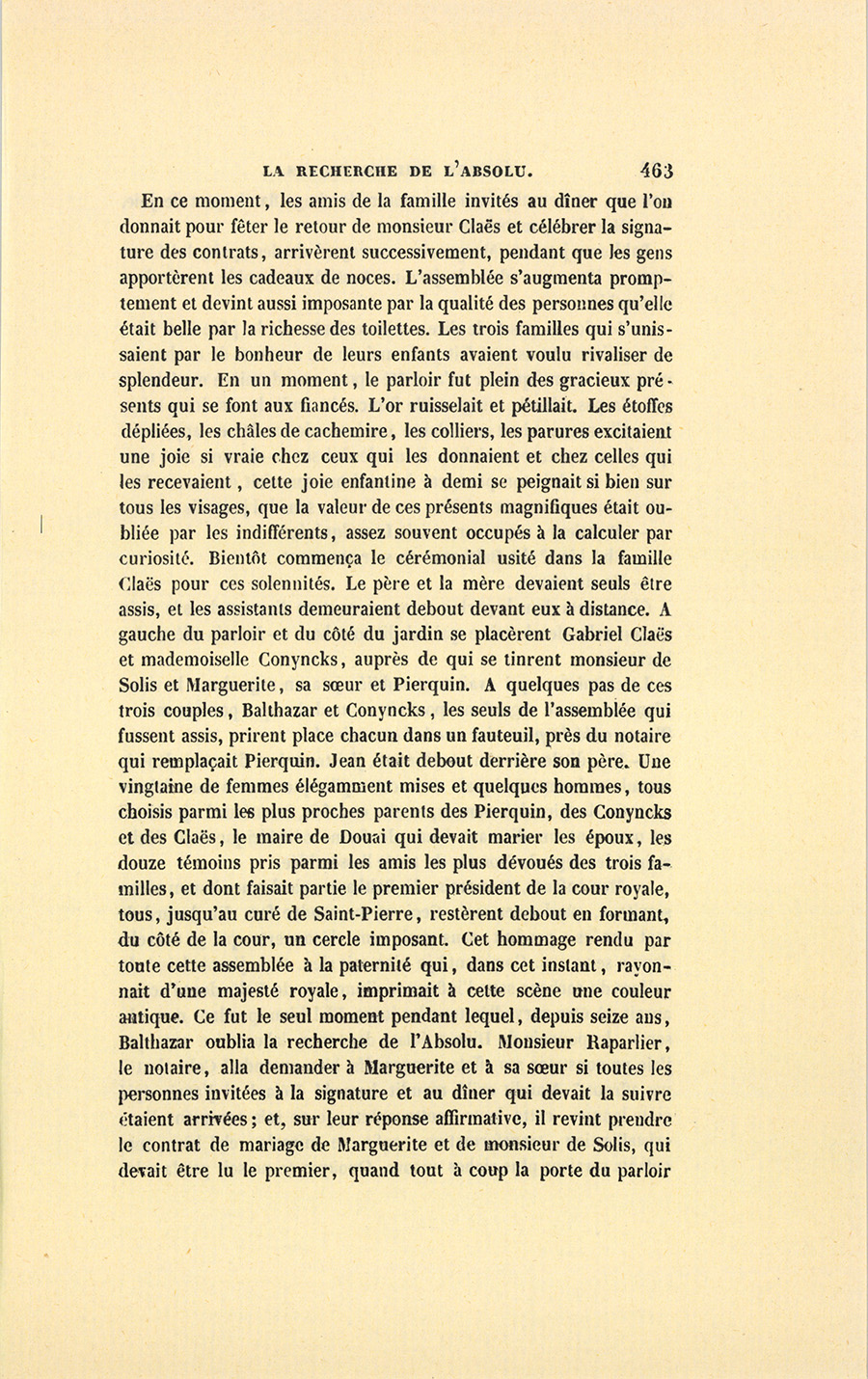 {p. 463} En ce moment, les amis de la famille invités au dîner que l’on donnait pour fêter le retour de monsieur Claës et célébrer la signature des contrats, arrivèrent successivement, pendant que les gens apportèrent les cadeaux de noces. L’assemblée s’augmenta promptement et devint aussi imposante par la qualité des personnes qu’elle était belle par la richesse des toilettes. Les trois familles qui s’unissaient par le bonheur de leurs enfants avaient voulu rivaliser de splendeur. En un moment, le parloir fut plein des gracieux présents qui se font aux fiancés. L’or ruisselait et pétillait. Les étoffes dépliées, les châles de cachemire, les colliers, les parures excitaient une joie si vraie chez ceux qui les donnaient et chez celles qui les recevaient, cette joie enfantine à demi se peignait si bien sur tous les visages, que la valeur de ces présents magnifiques était oubliée par les indifférents, assez souvent occupés à la calculer par curiosité. Bientôt commença le cérémonial usité dans la famille Claës pour ces solennités. Le père et la mère devaient seuls être assis, et les assistants demeuraient debout devant eux à distance. À gauche du parloir et du côté du jardin se placèrent Gabriel Claës et mademoiselle Conyncks, auprès de qui se tinrent monsieur de Solis et Marguerite, sa sœur et Pierquin. À quelques pas de ces trois couples, Balthazar et Conyncks, les seuls de l’assemblée qui fussent assis, prirent place chacun dans un fauteuil, près du notaire qui remplaçait Pierquin. Jean était debout derrière son père. Une vingtaine de femmes élégamment mises et quelques hommes, tous choisis parmi les plus proches parents des Pierquin, des Conyncks et des Claës, le maire de Douai qui devait marier les époux, les douze témoins pris parmi les amis les plus dévoués des trois familles, et dont faisait partie le premier président de la cour royale, tous, jusqu’au curé de Saint-Pierre, restèrent debout en formant, du côté de la cour, un cercle imposant. Cet hommage rendu par toute cette assemblée à la paternité qui, dans cet instant, rayonnait d’une majesté royale, imprimait à cette scène une couleur antique. Ce fut le seul moment pendant lequel, depuis seize ans, Balthazar oublia la recherche de l’Absolu. Monsieur Raparlier, le notaire, alla demander à Marguerite et à sa sœur si toutes les personnes invitées à la signature et au dîner qui devait la suivre étaient arrivées ; et, sur leur réponse affirmative, il revint prendre le contrat de mariage de Marguerite et de monsieur de Solis, qui devait être lu le premier, quand tout à coup la porte du parloir {p. 464} s’ouvrit, et Lemulquinier se montra le visage flamboyant de joie.