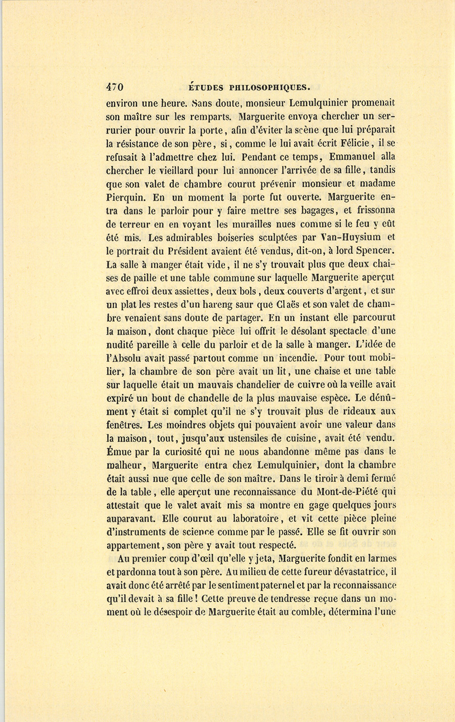 Monsieur et madame de Solis atteignirent la Flandre vers les derniers jours du mois de septembre 1831, et arrivèrent à Douai dans la matinée. Marguerite se fit arrêter à sa maison de la rue de Paris, et la trouva fermée. La sonnette fut violemment tirée sans que personne répondît. Un marchand quitta le pas de sa boutique où l’avait amené le fracas des voitures de monsieur de Solis et de sa suite. Beaucoup de personnes étaient aux fenêtres pour jouir du spectacle que leur offrait le retour d’un ménage aimé dans toute la ville, et attirées aussi par cette curiosité vague qui s’attachait aux événements que l’arrivée de Marguerite faisait préjuger dans la maison Claës. Le marchand dit au valet de chambre du comte de Solis que le vieux Claës était sorti depuis {p. 470} environ une heure. Sans doute, monsieur Lemulquinier promenait son maître sur les remparts. Marguerite envoya chercher un serrurier pour ouvrir la porte, afin d’éviter la scène que lui préparait la résistance de son père, si, comme le lui avait écrit Félicie, il se refusait à l’admettre chez lui. Pendant ce temps, Emmanuel alla chercher le vieillard pour lui annoncer l’arrivée de sa fille, tandis que son valet de chambre courut prévenir monsieur et madame Pierquin. En un moment la porte fut ouverte. Marguerite entra dans le parloir pour y faire mettre ses bagages, et frissonna de terreur en en voyant les murailles nues comme si le feu y eût été mis. Les admirables boiseries sculptées par Van-Huysium et le portrait du Président avaient été vendus, dit-on, à lord Spencer. La salle à manger était vide, il ne s’y trouvait plus que deux chaises de paille et une table commune sur laquelle Marguerite aperçut avec effroi deux assiettes, deux bols, deux couverts d’argent, et sur un plat les restes d’un hareng saur que Claës et son valet de chambre venaient sans doute de partager. En un instant elle parcourut la maison, dont chaque pièce lui offrit le désolant spectacle d’une nudité pareille à celle du parloir et de la salle à manger. L’idée de l’Absolu avait passé partout comme un incendie. Pour tout mobilier, la chambre de son père avait un lit, une chaise et une table sur laquelle était un mauvais chandelier de cuivre où la veille avait expiré un bout de chandelle de la plus mauvaise espèce. Le dénûment y était si complet qu’il ne s’y trouvait plus de rideaux aux fenêtres. Les moindres objets qui pouvaient avoir une valeur dans la maison, tout, jusqu’aux ustensiles de cuisine, avait été vendu. Émue par la curiosité qui ne nous abandonne même pas dans le malheur, Marguerite entra chez Lemulquinier, dont la chambre était aussi nue que celle de son maître. Dans le tiroir à demi fermé de la table, elle aperçut une reconnaissance du Mont-de-Piété qui attestait que le valet avait mis sa montre en gage quelques jours auparavant. Elle courut au laboratoire, et vit cette pièce pleine d’instruments de science comme par le passé. Elle se fit ouvrir son appartement, son père y avait tout respecté.