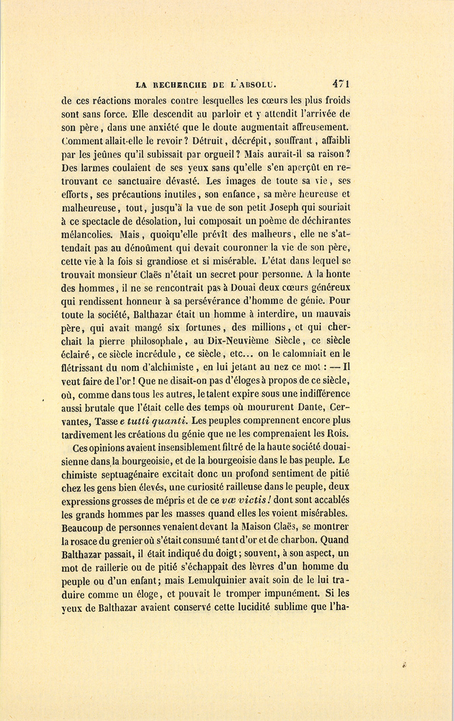 Ces opinions avaient insensiblement filtré de la haute société douaisienne dans la bourgeoisie, et de la bourgeoisie dans le bas peuple. Le chimiste septuagénaire excitait donc un profond sentiment de pitié chez les gens bien élevés, une curiosité railleuse dans le peuple, deux expressions grosses de mépris et de ce væ victis ! dont sont accablés les grands hommes par les masses quand elles les voient misérables. Beaucoup de personnes venaient devant la Maison Claës, se montrer la rosace du grenier où s’était consumé tant d’or et de charbon. Quand Balthazar passait, il était indiqué du doigt ; souvent, à son aspect, un mot de raillerie ou de pitié s’échappait des lèvres d’un homme du peuple ou d’un enfant ; mais Lemulquinier avait soin de le lui traduire comme un éloge, et pouvait le tromper impunément. Si les yeux de Balthazar avaient conservé cette lucidité sublime que {p. 472} l’habitude des grandes pensées y imprime, le sens de l’ouïe s’était affaibli chez lui. Pour beaucoup de paysans, de gens grossiers et superstitieux, ce vieillard était donc un sorcier. La noble, la grande maison Claës s’appelait, dans les faubourgs et dans les campagnes, la maison du diable. Il n’y avait pas jusqu’à la figure de Lemulquinier qui ne prêtât aux croyances ridicules qui s’étaient répandues sur son maître. Aussi, quand le pauvre vieux ilote allait au marché chercher les denrées nécessaires à la subsistance, et qu’il prenait parmi les moins chères de toutes, n’obtenait-il rien sans recevoir quelques injures en manière de réjouissance ; heureux même, si, souvent, quelques marchandes superstitieuses ne refusaient pas de lui vendre sa maigre pitance en craignant de se damner par un contact avec un suppôt de l’enfer. Les sentiments de toute cette ville étaient donc généralement hostiles à ce grand vieillard et à son compagnon. Le désordre des vêtements de l’un et de l’autre y prêtait encore, ils allaient vêtus comme ces pauvres honteux qui conservent un extérieur décent et qui hésitent à demander l’aumône. Tôt ou tard ces deux vieilles gens pouvaient être insultés. Pierquin, sentant combien une injure publique serait déshonorante pour la famille, envoyait toujours, durant les promenades de son beau-père, deux ou trois de ses gens qui l’environnaient à distance avec la mission de le protéger, car la révolution de juillet n’avait pas contribué à rendre le peuple respectueux.