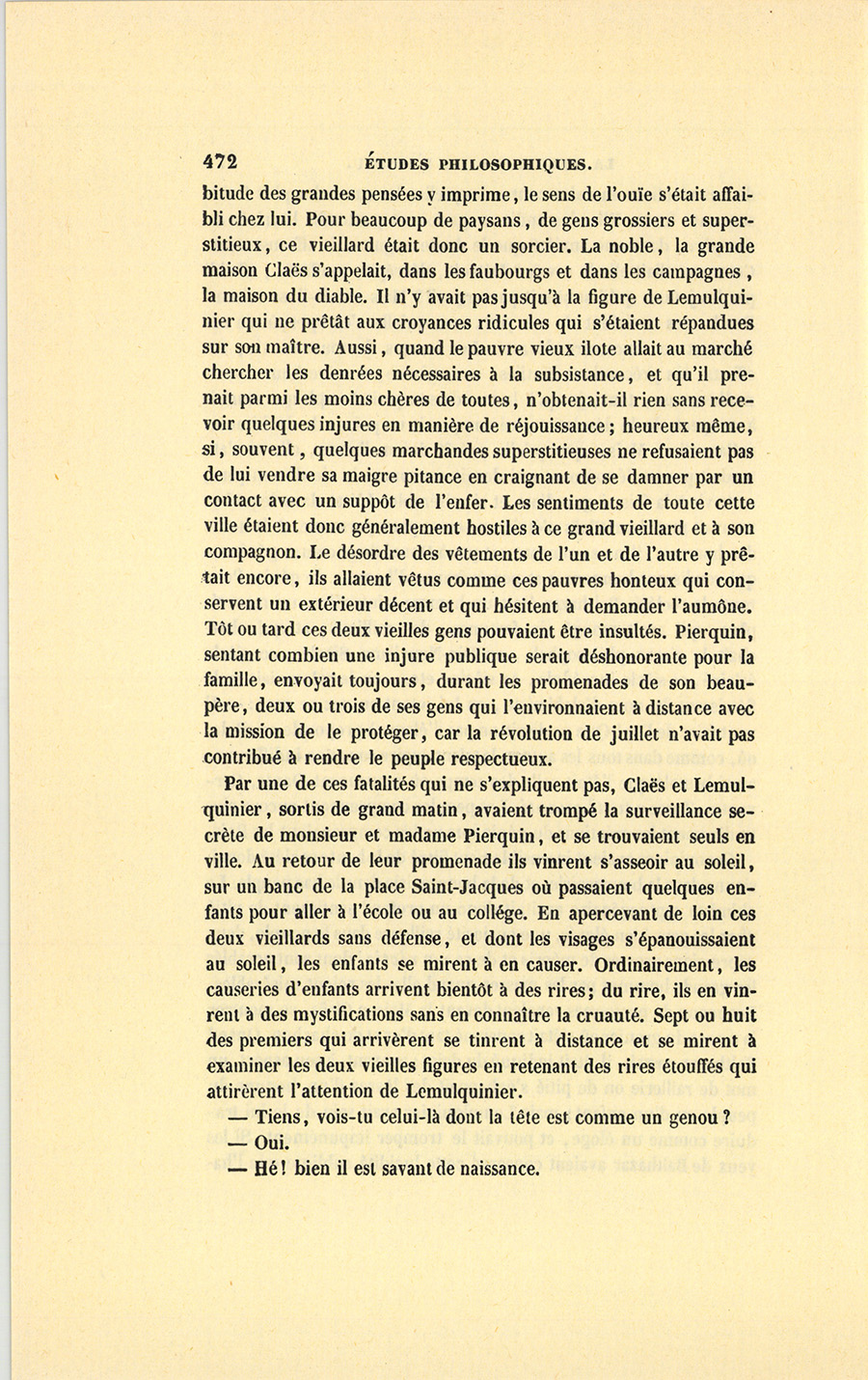 Par une de ces fatalités qui ne s’expliquent pas, Claës et Lemulquinier, sortis de grand matin, avaient trompé la surveillance secrète de monsieur et madame Pierquin, et se trouvaient seuls en ville. Au retour de leur promenade ils vinrent s’asseoir au soleil, sur un banc de la place Saint-Jacques où passaient quelques enfants pour aller à l’école ou au collége. En apercevant de loin ces deux vieillards sans défense, et dont les visages s’épanouissaient au soleil, les enfants se mirent à en causer. Ordinairement, les causeries d’enfants arrivent bientôt à des rires ; du rire, ils en vinrent à des mystifications sans en connaître la cruauté. Sept ou huit des premiers qui arrivèrent se tinrent à distance et se mirent à examiner les deux vieilles figures en retenant des rires étouffés qui attirèrent l’attention de Lemulquinier.
