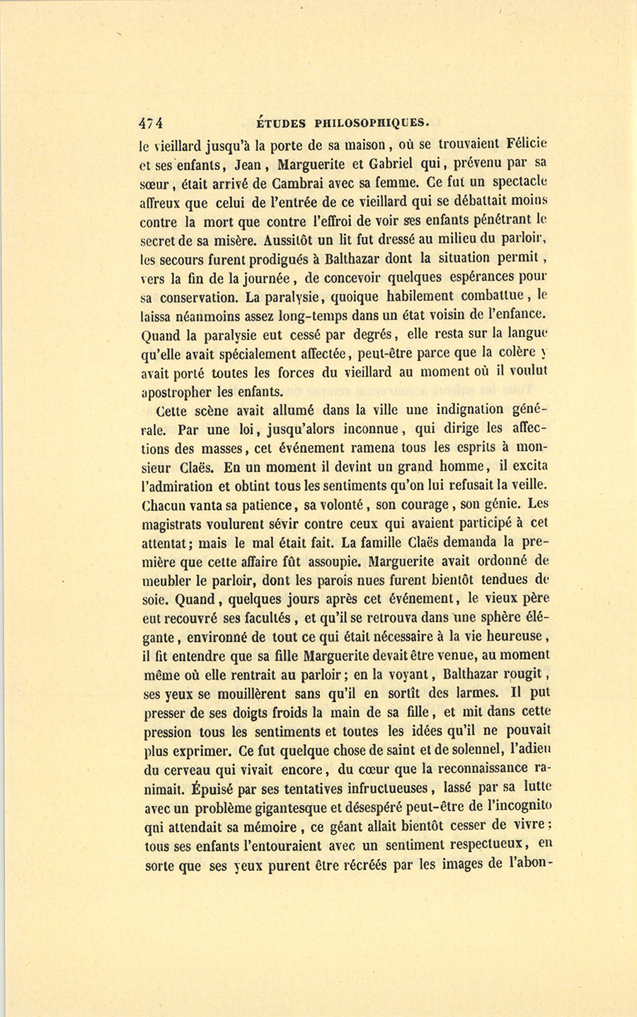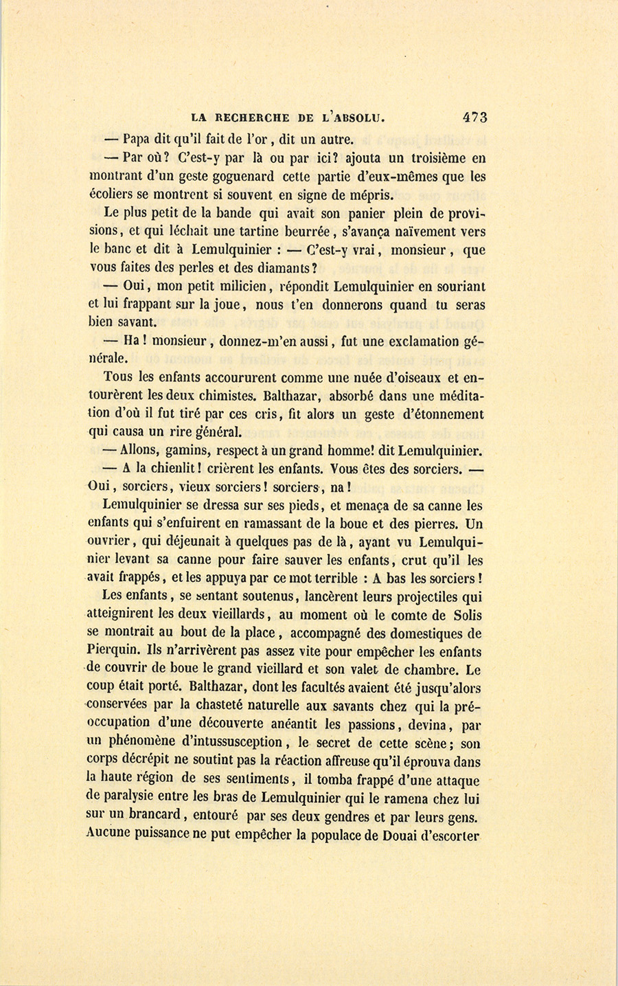 Les enfants, se sentant soutenus, lancèrent leurs projectiles qui atteignirent les deux vieillards, au moment où le comte de Solis se montrait au bout de la place, accompagné des domestiques de Pierquin. Ils n’arrivèrent pas assez vite pour empêcher les enfants de couvrir de boue le grand vieillard et son valet de chambre. Le coup était porté. Balthazar, dont les facultés avaient été jusqu’alors conservées par la chasteté naturelle aux savants chez qui la préoccupation d’une découverte anéantit les passions, devina, par un phénomène d’intussusception, le secret de cette scène ; son corps décrépit ne soutint pas la réaction affreuse qu’il éprouva dans la haute région de ses sentiments, il tomba frappé d’une attaque de paralysie entre les bras de Lemulquinier qui le ramena chez lui sur un brancard, entouré par ses deux gendres et par leurs gens. Aucune puissance ne put empêcher la populace de Douai d’escorter {p. 474} le vieillard jusqu’à la porte de sa maison, où se trouvaient Félicie et ses enfants, Jean, Marguerite et Gabriel qui, prévenu par sa sœur, était arrivé de Cambrai avec sa femme. Ce fut un spectacle affreux que celui de l’entrée de ce vieillard qui se débattait moins contre la mort que contre l’effroi de voir ses enfants pénétrant le secret de sa misère. Aussitôt un lit fut dressé au milieu du parloir, les secours furent prodigués à Balthazar dont la situation permit, vers la fin de la journée, de concevoir quelques espérances pour sa conservation. La paralysie, quoique habilement combattue, le laissa néanmoins assez long-temps dans un état voisin de l’enfance. Quand la paralysie eut cessé par degrés, elle resta sur la langue qu’elle avait spécialement affectée, peut-être parce que la colère y avait porté toutes les forces du vieillard au moment où il voulut apostropher les enfants.