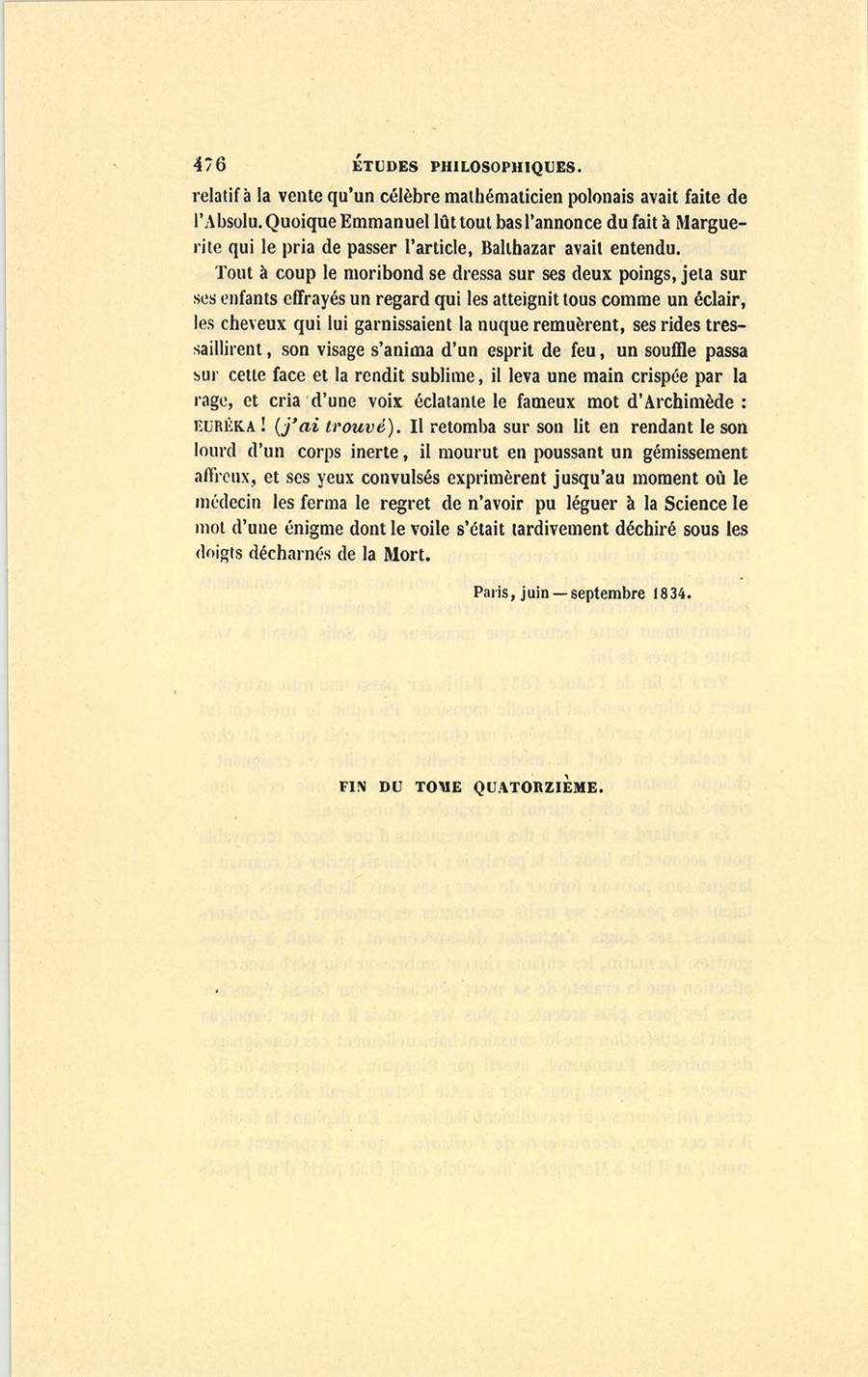 Tout à coup le moribond se dressa sur ses deux poings, jeta sur ses enfants effrayés un regard qui les atteignit tous comme un éclair, les cheveux qui lui garnissaient la nuque remuèrent, ses rides tressaillirent, son visage s’anima d’un esprit de feu, un souffle passa sur cette face et la rendit sublime, il leva une main crispée par la rage, et cria d’une voix éclatante le fameux mot d’Archimède : eurêka ! (j’ai trouvé). Il retomba sur son lit en rendant le son lourd d’un corps inerte, il mourut en poussant un gémissement affreux, et ses yeux convulsés exprimèrent jusqu’au moment où le médecin les ferma le regret de n’avoir pu léguer à la Science le mot d’une énigme dont le voile s’était tardivement déchiré sous les doigts décharnés de la Mort.