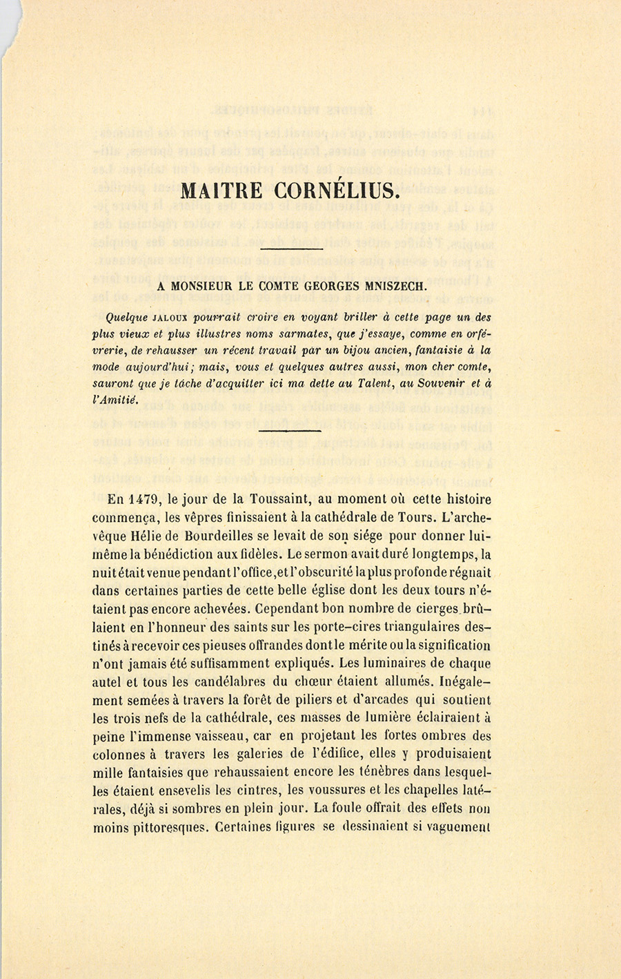 Quelque jaloux pourrait croire en voyant briller à cette page un des plus vieux et plus illustres noms sarmates, que j’essaye, comme en orfévrerie, de rehausser un récent travail par un bijou ancien, fantaisie à la mode aujourd’hui ; mais, vous et quelques autres aussi, mon cher comte, sauront que je tâche d’acquitter ici ma dette au Talent, au Souvenir et à l’Amitié.