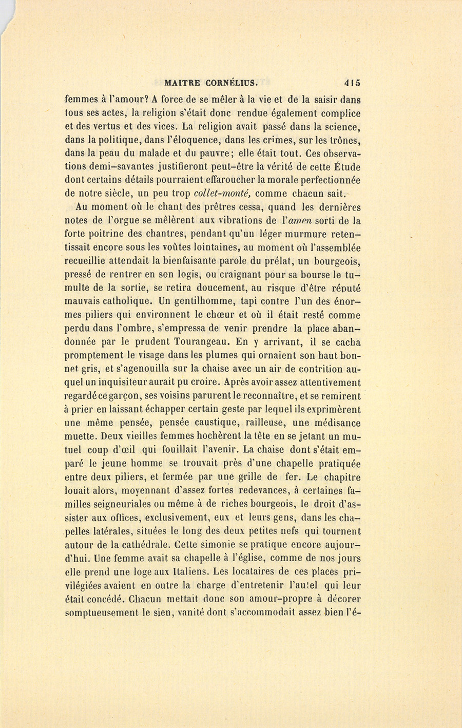 Au moment où le chant des prêtres cessa, quand les dernières notes de l’orgue se mêlèrent aux vibrations de l’amen sorti de la forte poitrine des chantres, pendant qu’un léger murmure retentissait encore sous les voûtes lointaines, au moment où l’assemblée recueillie attendait la bienfaisante parole du prélat, un bourgeois, pressé de rentrer en son logis, ou craignant pour sa bourse le tumulte de la sortie, se retira doucement, au risque d’être réputé mauvais catholique. Un gentilhomme, tapi contre l’un des énormes piliers qui environnent le chœur et où il était resté comme perdu dans l’ombre, s’empressa de venir prendre la place abandonnée par le prudent Tourangeau. En y arrivant, il se cacha promptement le visage dans les plumes qui ornaient son haut bonnet gris, et s’agenouilla sur la chaise avec un air de contrition auquel un inquisiteur aurait pu croire. Après avoir assez attentivement regardé ce garçon, ses voisins parurent le reconnaître, et se remirent à prier en laissant échapper certain geste par lequel ils exprimèrent une même pensée, pensée caustique, railleuse, une médisance muette. Deux vieilles femmes hochèrent la tête en se jetant un mutuel coup d’œil qui fouillait l’avenir. La chaise dont s’était emparé le jeune homme se trouvait près d’une chapelle pratiquée entre deux piliers, et fermée par une grille de fer. Le chapitre louait alors, moyennant d’assez fortes redevances, à certaines familles seigneuriales ou même à de riches bourgeois, le droit d’assister aux offices, exclusivement, eux et leurs gens, dans les chapelles latérales, situées le long des deux petites nefs qui tournent autour de la cathédrale. Cette simonie se pratique encore aujourd’hui. Une femme avait sa chapelle à l’église, comme de nos jours elle prend une loge aux Italiens. Les locataires de ces places privilégiées avaient en outre la charge d’entretenir l’autel qui leur était concédé. Chacun mettait donc son amour-propre à décorer somptueusement le sien, vanité dont s’accommodait assez bien {p. 416} l’église. Dans cette chapelle et près de la grille, une jeune dame était agenouillée sur un beau carreau de velours rouge à glands d’or, précisément auprès de la place précédemment occupée par le bourgeois. Une lampe d’argent vermeil suspendue à la voûte de la chapelle, devant un autel magnifiquement orné, jetait sa pâle lumière sur le livre d’Heures que tenait la dame. Ce livre trembla violemment dans ses mains quand le jeune homme vint près d’elle.