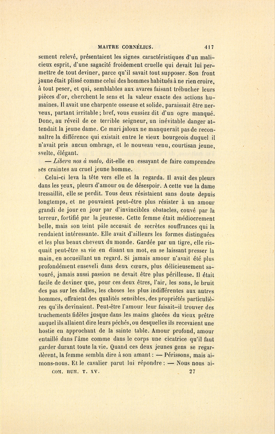 Celui-ci leva la tête vers elle et la regarda. Il avait des pleurs dans les yeux, pleurs d’amour ou de désespoir. À cette vue la dame tressaillit, elle se perdit. Tous deux résistaient sans doute depuis longtemps, et ne pouvaient peut-être plus résister à un amour grandi de jour en jour par d’invincibles obstacles, couvé par la terreur, fortifié par la jeunesse. Cette femme était médiocrement belle, mais son teint pâle accusait de secrètes souffrances qui la rendaient intéressante. Elle avait d’ailleurs les formes distinguées et les plus beaux cheveux du monde. Gardée par un tigre, elle risquait peut-être sa vie en disant un mot, en se laissant presser la main, en accueillant un regard. Si jamais amour n’avait été plus profondément enseveli dans deux cœurs, plus délicieusement savouré, jamais aussi passion ne devait être plus périlleuse. Il était facile de deviner que, pour ces deux êtres, l’air, les sons, le bruit des pas sur les dalles, les choses les plus indifférentes aux autres hommes, offraient des qualités sensibles, des propriétés particulières qu’ils devinaient. Peut-être l’amour leur faisait-il trouver des truchements fidèles jusque dans les mains glacées du vieux prêtre auquel ils allaient dire leurs péchés, ou desquelles ils recevaient une hostie en approchant de la sainte table. Amour profond, amour entaillé dans l’âme comme dans le corps une cicatrice qu’il faut garder durant toute la vie. Quand ces deux jeunes gens se regardèrent, la femme sembla dire à son amant : – Périssons, mais aimons-nous. Et le cavalier parut lui répondre : – Nous nous {p. 418} aimerons, et ne périrons pas. Alors, par un mouvement de tête plein de mélancolie, elle lui montra une vieille duègne et deux pages. La duègne dormait. Les deux pages étaient jeunes, et paraissaient assez insouciants de ce qui pouvait arriver de bien ou de mal à leur maître.