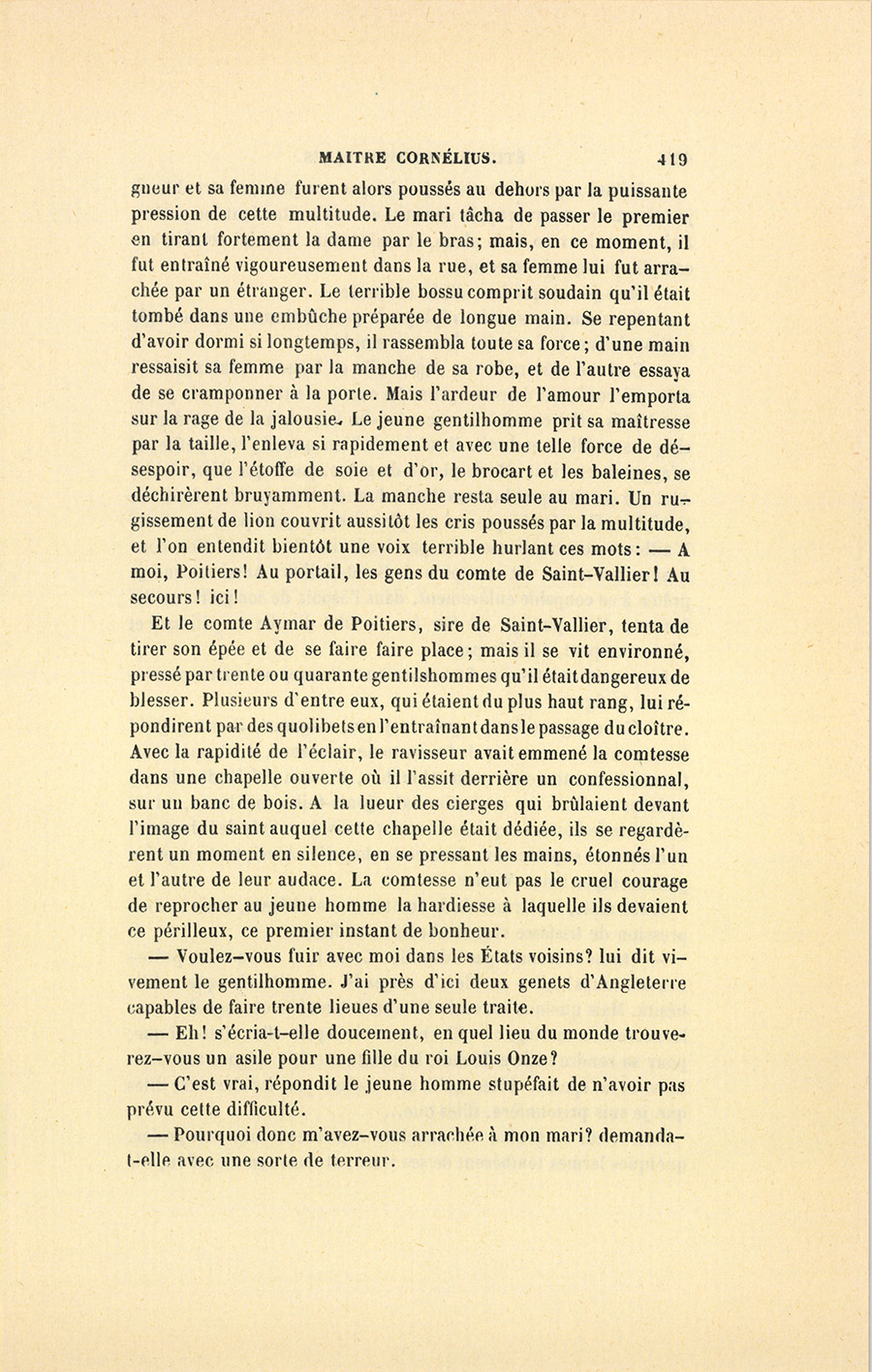 Malgré cette observation, le rusé vieillard parut croire à cette défaite ; mais il soupçonna quelque trahison secrète et résolut de veiller encore plus attentivement sur son trésor. La bénédiction était donnée. Sans attendre la fin du secula seculorum, la foule se précipitait comme un torrent vers les portes de l’église. Suivant son habitude, le seigneur attendit prudemment que l’empressement général fût calmé, puis il sortit en faisant marcher devant lui la duègne et le plus jeune page qui portait un falot ; il donna le bras à sa femme, et se fit suivre par l’autre page. Au moment où le vieux seigneur allait atteindre la porte latérale ouverte dans la partie orientale du cloître et par laquelle il avait coutume de sortir, un flot de monde se détacha de la foule qui obstruait le grand portail, reflua vers la petite nef où il se trouvait avec son monde, et cette masse compacte l’empêcha de retourner sur ses pas. Le {p. 419} seigneur et sa femme furent alors poussés au dehors par la puissante pression de cette multitude. Le mari tâcha de passer le premier en tirant fortement la dame par le bras ; mais, en ce moment, il fut entraîné vigoureusement dans la rue, et sa femme lui fut arrachée par un étranger. Le terrible bossu comprit soudain qu’il était tombé dans une embûche préparée de longue main. Se repentant d’avoir dormi si longtemps, il rassembla toute sa force ; d’une main ressaisit sa femme par la manche de sa robe, et de l’autre essaya de se cramponner à la porte. Mais l’ardeur de l’amour l’emporta sur la rage de la jalousie. Le jeune gentilhomme prit sa maîtresse par la taille, l’enleva si rapidement et avec une telle force de désespoir, que l’étoffe de soie et d’or, le brocart et les baleines, se déchirèrent bruyamment. La manche resta seule au mari. Un rugissement de lion couvrit aussitôt les cris poussés par la multitude, et l’on entendit bientôt une voix terrible hurlant ces mots : – À moi, Poitiers ! Au portail, les gens du comte de Saint-Vallier ! Au secours ! ici !
