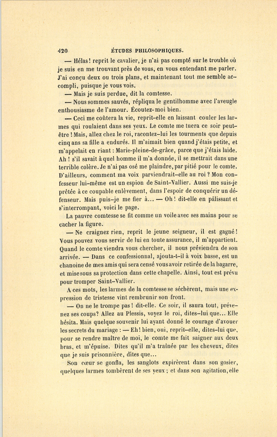 {p. 420}– Hélas ! reprit le cavalier, je n’ai pas compté sur le trouble où je suis en me trouvant près de vous, en vous entendant me parler. J’ai conçu deux ou trois plans, et maintenant tout me semble accompli, puisque je vous vois.