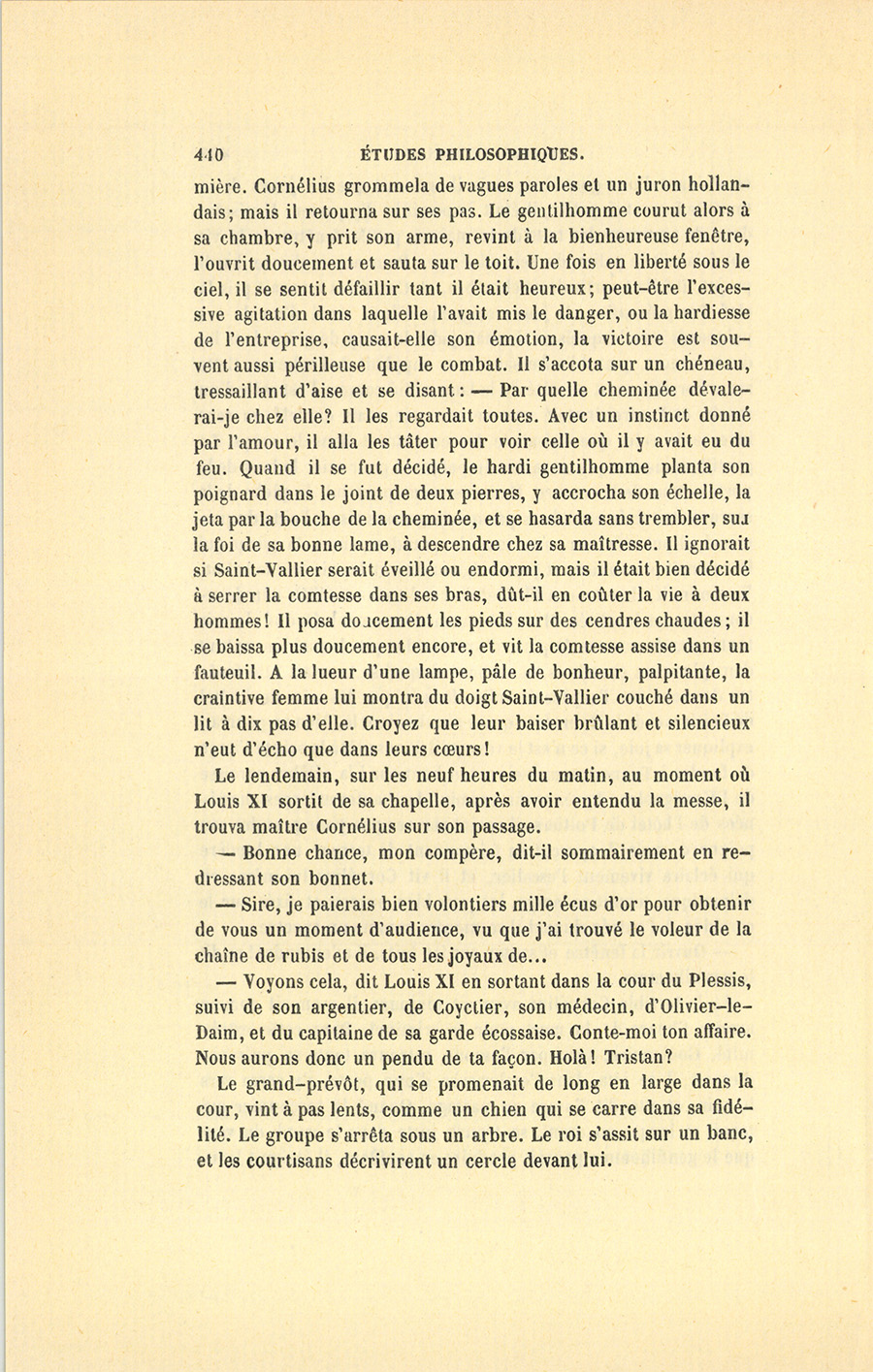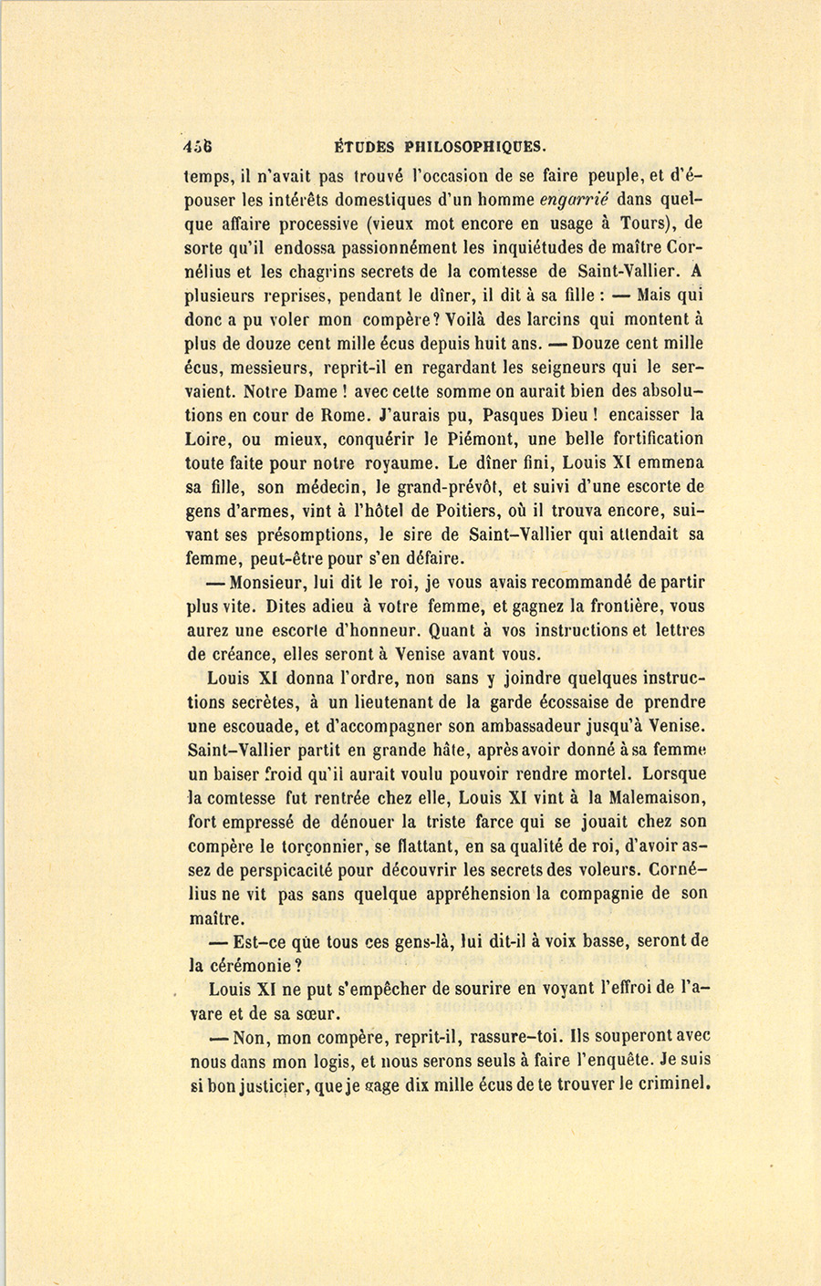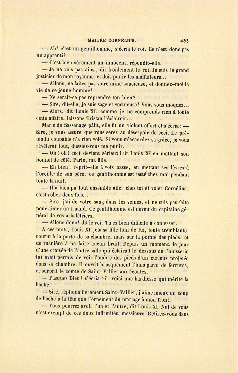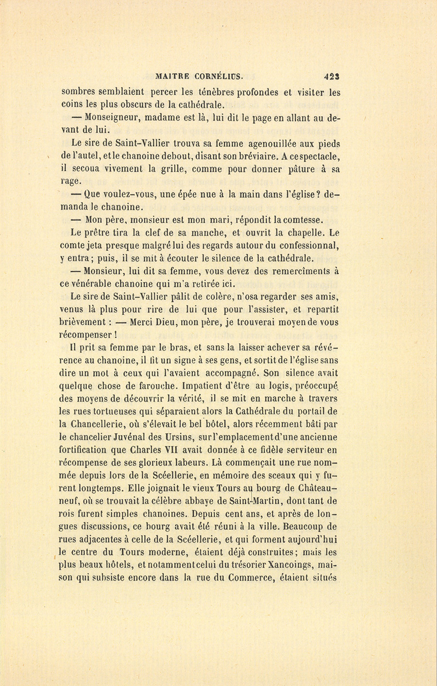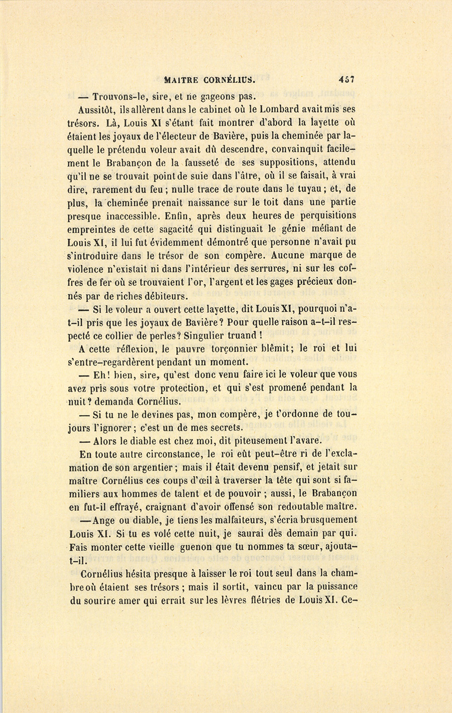 Louis XI aimait beaucoup à intervenir dans les affaires de ses sujets, et mêlait volontiers la majesté royale aux scènes de la vie bourgeoise. Ce goût, sévèrement blâmé par quelques historiens, n’était cependant que la passion de l’incognito, l’un des plus grands plaisirs des princes, espèce d’abdication momentanée qui leur permet de mettre un peu de vie commune dans leur existence affadie par le défaut d’oppositions ; seulement, Louis XI jouait l’incognito à découvert. En ces sortes de rencontres, il était d’ailleurs bon homme, et s’efforçait de plaire aux gens du tiers état, desquels il avait fait ses alliés contre la féodalité. Depuis {p. 456} long-temps, il n’avait pas trouvé l’occasion de se faire peuple, et d’épouser les intérêts domestiques d’un homme engarrié dans quelque affaire processive (vieux mot encore en usage à Tours), de sorte qu’il endossa passionnément les inquiétudes de maître Cornélius et les chagrins secrets de la comtesse de Saint-Vallier. À plusieurs reprises, pendant le dîner, il dit à sa fille : – Mais qui donc a pu voler mon compère ? Voilà des larcins qui montent à plus de douze cent mille écus depuis huit ans. – Douze cent mille écus, messieurs, reprit-il en regardant les seigneurs qui le servaient. Notre Dame ! avec cette somme on aurait bien des absolutions en cour de Rome. J’aurais pu, Pasques Dieu ! encaisser la Loire, ou mieux, conquérir le Piémont, une belle fortification toute faite pour notre royaume. Le dîner fini, Louis XI emmena sa fille, son médecin, le grand-prévôt, et suivi d’une escorte de gens d’armes, vint à l’hôtel de Poitiers, où il trouva encore, suivant ses présomptions, le sire de Saint-Vallier qui attendait sa femme, peut-être pour s’en défaire.