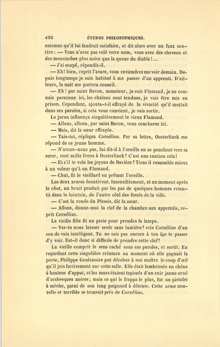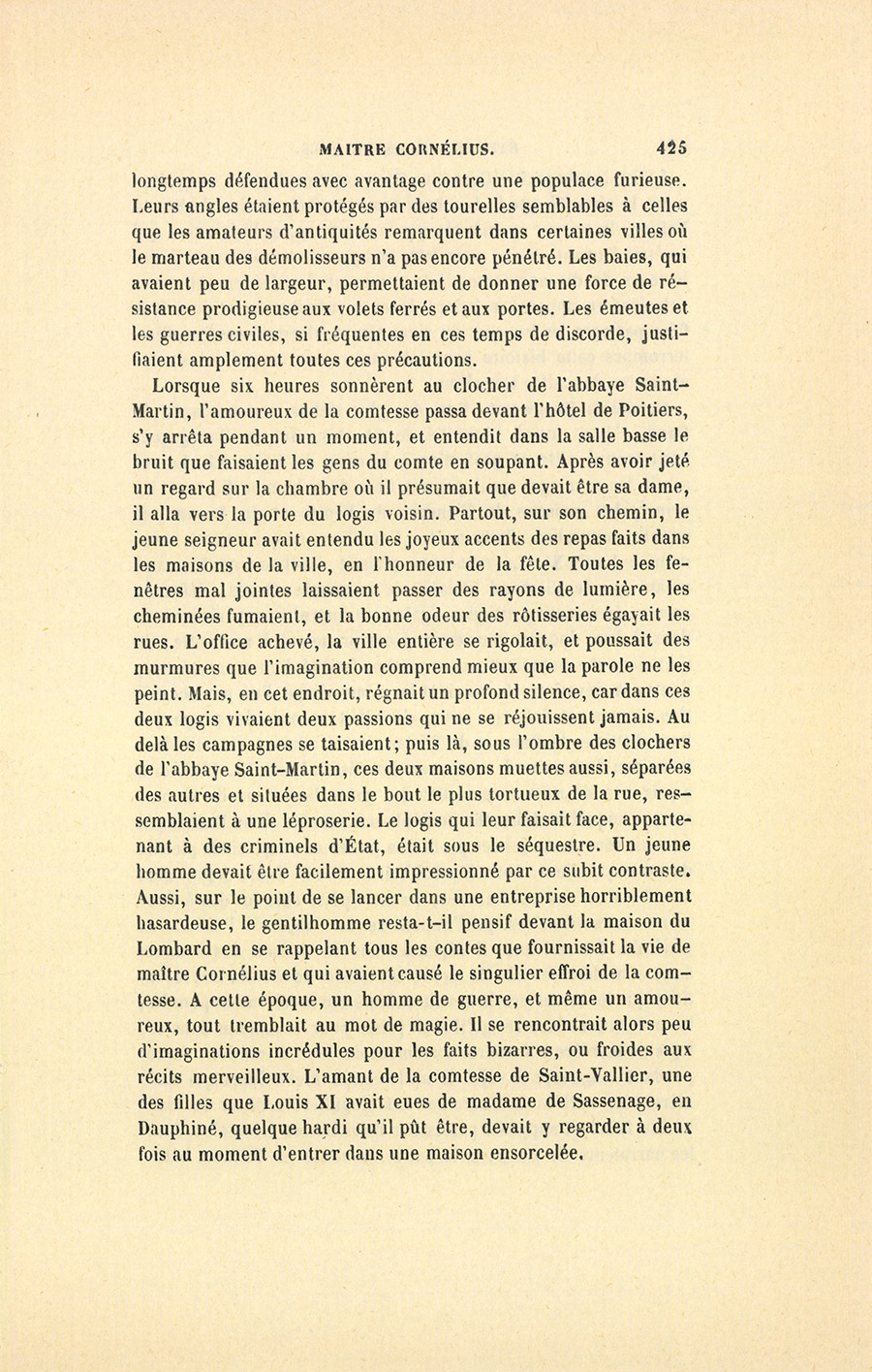 {p. 426} L’histoire de maître Cornélius Hoogworst expliquera complétement la sécurité que le Lombard avait inspirée au sire de Saint-Vallier, la terreur manifestée par la comtesse, et l’hésitation qui arrêtait l’amant. Mais, pour faire comprendre entièrement à des lecteurs du dix-neuvième siècle comment des événements assez vulgaires en apparence étaient devenus surnaturels, et pour leur faire partager les frayeurs du vieux temps, il est nécessaire d’interrompre cette histoire pour jeter un rapide coup d’œil sur les aventures de maître Cornélius.