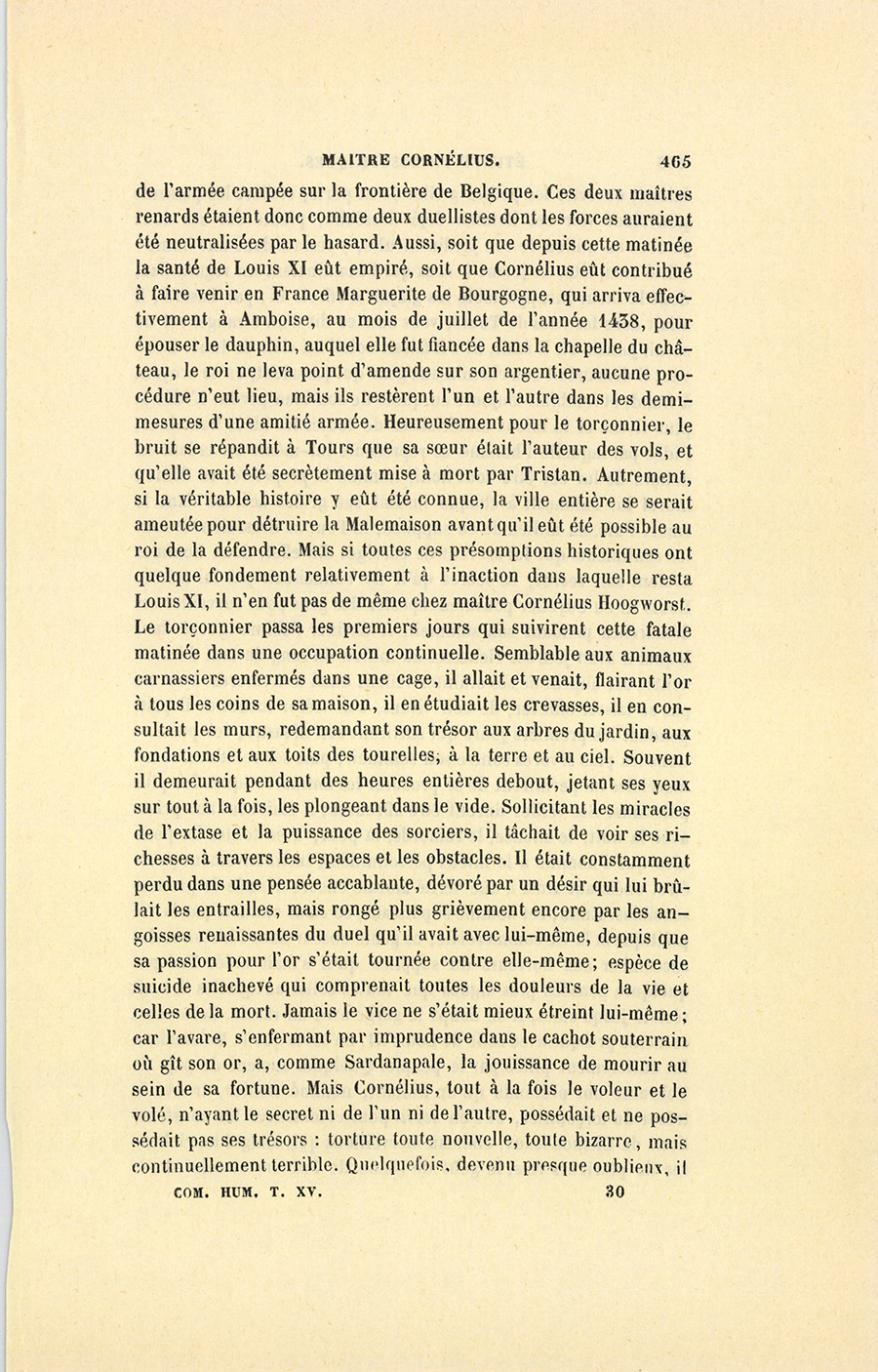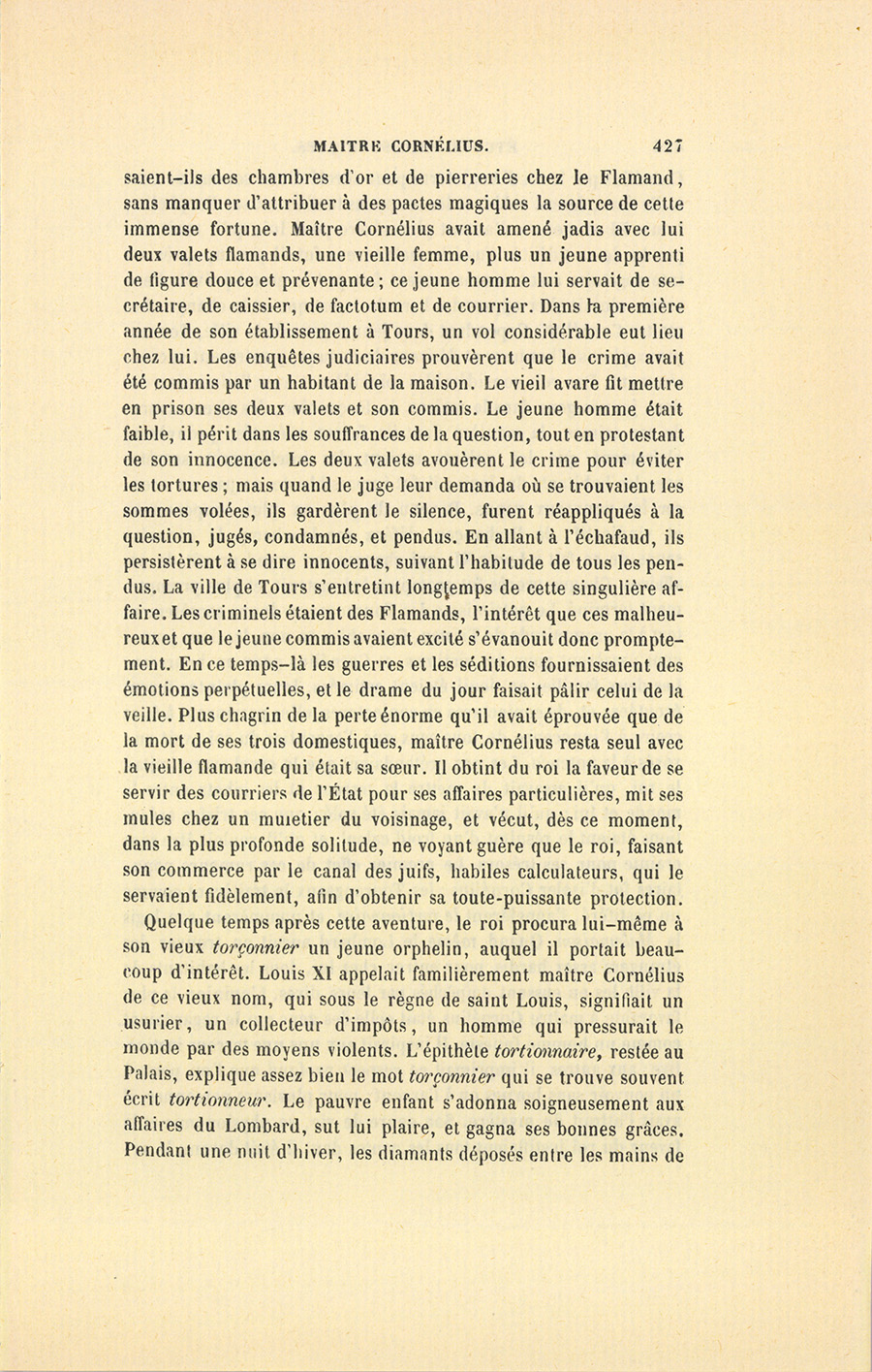 Cornélius Hoogworst, l’un des plus riches commerçants de Gand, s’étant attiré l’inimitié de Charles, duc de Bourgogne, avait trouvé asile et protection à la cour de Louis XI. Le roi sentit les avantages qu’il pouvait tirer d’un homme lié avec les principales maisons de Flandre, de Venise et du Levant, il anoblit, naturalisa, flatta maître Cornélius, ce qui arrivait rarement à Louis XI. Le monarque plaisait d’ailleurs au Flamand autant que le Flamand plaisait au monarque. Rusés, défiants, avares ; également politiques, également instruits ; supérieurs tous deux à leur époque, tous deux se comprenaient à merveille ; ils quittaient et reprenaient avec une même facilité, l’un sa conscience, l’autre sa dévotion ; ils aimaient la même vierge, l’un par conviction, l’autre par flatterie ; enfin, s’il fallait en croire les propos jaloux d’Olivier le Daim et de Tristan, le roi allait se divertir dans la maison du Lombard, comme se divertissait Louis XI. L’histoire a pris soin de nous transmettre les goûts licencieux de ce monarque auquel la débauche ne déplaisait pas. Le vieux Brabançon trouvait sans doute joie et profit à se prêter aux capricieux plaisirs de son royal client. Cornélius habitait la ville de Tours depuis neuf ans. Pendant ces neuf années, il s’était passé chez lui des événements extraordinaires qui l’avaient rendu l’objet de l’exécration générale. En arrivant, il dépensa dans sa maison des sommes assez considérables afin de mettre ses trésors en sûreté. Les inventions que les serruriers de la ville exécutèrent secrètement pour lui, les précautions bizarres qu’il avait prises pour les amener dans son logis de manière à s’assurer forcément de leur discrétion, furent pendant longtemps le sujet de mille contes merveilleux qui charmèrent les veillées de Touraine. Les singuliers artifices du vieillard le faisaient supposer possesseur de richesses orientales. Aussi les narrateurs de ce pays, la patrie du conte en France, {p. 427} bâtissaient-ils des chambres d’or et de pierreries chez le Flamand, sans manquer d’attribuer à des pactes magiques la source de cette immense fortune. Maître Cornélius avait amené jadis avec lui deux valets flamands, une vieille femme, plus un jeune apprenti de figure douce et prévenante ; ce jeune homme lui servait de secrétaire, de caissier, de factotum et de courrier. Dans la première année de son établissement à Tours, un vol considérable eut lieu chez lui. Les enquêtes judiciaires prouvèrent que le crime avait été commis par un habitant de la maison. Le vieil avare fit mettre en prison ses deux valets et son commis. Le jeune homme était faible, il périt dans les souffrances de la question, tout en protestant de son innocence. Les deux valets avouèrent le crime pour éviter les tortures ; mais quand le juge leur demanda où se trouvaient les sommes volées, ils gardèrent le silence, furent réappliqués à la question, jugés, condamnés, et pendus. En allant à l’échafaud, ils persistèrent à se dire innocents, suivant l’habitude de tous les pendus. La ville de Tours s’entretint longtemps de cette singulière affaire. Les criminels étaient des Flamands, l’intérêt que ces malheureux et que le jeune commis avaient excité s’évanouit donc promptement. En ce temps-là les guerres et les séditions fournissaient des émotions perpétuelles, et le drame du jour faisait pâlir celui de la veille. Plus chagrin de la perte énorme qu’il avait éprouvée que de la mort de ses trois domestiques, maître Cornélius resta seul avec la vieille flamande qui était sa sœur. Il obtint du roi la faveur de se servir des courriers de l’État pour ses affaires particulières, mit ses mules chez un muletier du voisinage, et vécut, dès ce moment, dans la plus profonde solitude, ne voyant guère que le roi, faisant son commerce par le canal des juifs, habiles calculateurs, qui le servaient fidèlement, afin d’obtenir sa toute-puissante protection.