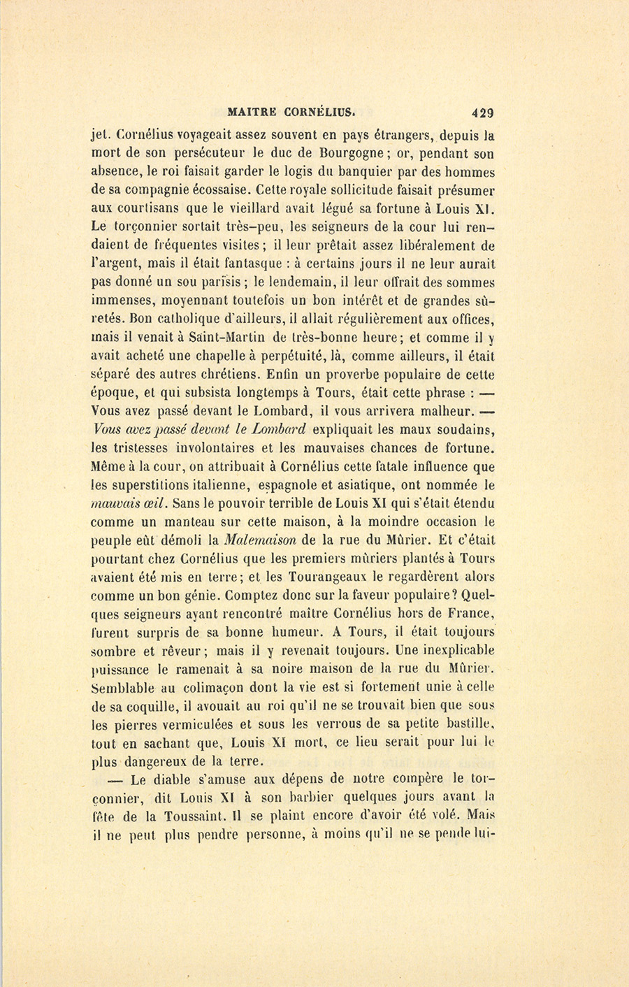 Quelque temps après cette aventure, le roi procura lui-même à son vieux torçonnier un jeune orphelin, auquel il portait beaucoup d’intérêt. Louis XI appelait familièrement maître Cornélius de ce vieux nom, qui sous le règne de saint Louis, signifiait un usurier, un collecteur d’impôts, un homme qui pressurait le monde par des moyens violents. L’épithète tortionnaire, restée au Palais, explique assez bien le mot torçonnier qui se trouve souvent écrit tortionneur. Le pauvre enfant s’adonna soigneusement aux affaires du Lombard, sut lui plaire, et gagna ses bonnes grâces. Pendant une nuit d’hiver, les diamants déposés entre les mains de {p. 428} Cornélius par le roi d’Angleterre pour sûreté d’une somme de cent mille écus, furent volés, et les soupçons tombèrent sur l’orphelin ; Louis XI se montra d’autant plus sévère pour lui, qu’il avait répondu de sa fidélité. Aussi le malheureux fut-il pendu, après un interrogatoire assez sommairement fait par le grand-prévôt. Personne n’osait aller apprendre l’art de la banque et le change chez maître Cornélius. Cependant deux jeunes gens de la ville, Tourangeaux pleins d’honneur et désireux de fortune, y entrèrent successivement. Des vols considérables coïncidèrent avec l’admission des deux jeunes gens dans la maison du torçonnier ; les circonstances de ces crimes, la manière dont ils furent exécutés, prouvèrent clairement que les voleurs avaient des intelligences secrètes avec les habitants du logis ; il fut impossible de ne pas en accuser les nouveaux venus. Devenu de plus en plus soupçonneux et vindicatif, le Brabançon déféra sur-le-champ la connaissance de ce fait à Louis XI, qui chargea son grand-prévôt de ces affaires. Chaque procès fut promptement instruit, et plus promptement terminé. Le patriotisme des Tourangeaux donna secrètement tort à la promptitude de Tristan. Coupables ou non, les deux jeunes gens passèrent pour des victimes, et Cornélius pour un bourreau. Les deux familles en deuil étaient estimées, leurs plaintes furent écoutées ; et, de conjectures en conjectures, elles parvinrent à faire croire à l’innocence de tous ceux que l’argentier du roi avait envoyés à la potence. Les uns prétendaient que le cruel avare imitait le roi, qu’il essayait de mettre la terreur et les gibets entre le monde et lui ; qu’il n’avait jamais été volé ; que ces tristes exécutions étaient le résultat d’un froid calcul, et qu’il voulait être sans crainte pour ses trésors. Le premier effet de ces rumeurs populaires fut d’isoler Cornélius ; les Tourangeaux le traitèrent comme un pestiféré, l’appelèrent le tortionnaire, et nommèrent son logis la Malemaison. Quand même le Lombard aurait pu trouver des étrangers assez hardis pour entrer chez lui, tous les habitants de la ville les en eussent empêchés par leurs dires. L’opinion la plus favorable à maître Cornélius était celle des gens qui le regardaient comme un homme funeste. Il inspirait aux uns une terreur instinctive ; aux autres, il imprimait ce respect profond que l’on porte à un pouvoir sans bornes ou à l’argent ; pour plusieurs personnes, il avait l’attrait du mystère. Son genre de vie, sa physionomie et la faveur du roi justifiaient tous les contes dont il était devenu le {p. 429} sujet. Cornélius voyageait assez souvent en pays étrangers, depuis la mort de son persécuteur le duc de Bourgogne ; or, pendant son absence, le roi faisait garder le logis du banquier par des hommes de sa compagnie écossaise. Cette royale sollicitude faisait présumer aux courtisans que le vieillard avait légué sa fortune à Louis XI. Le torçonnier sortait très-peu, les seigneurs de la cour lui rendaient de fréquentes visites ; il leur prêtait assez libéralement de l’argent, mais il était fantasque : à certains jours il ne leur aurait pas donné un sou parisis ; le lendemain, il leur offrait des sommes immenses, moyennant toutefois un bon intérêt et de grandes sûretés. Bon catholique d’ailleurs, il allait régulièrement aux offices, mais il venait à Saint-Martin de très-bonne heure ; et comme il y avait acheté une chapelle à perpétuité, là, comme ailleurs, il était séparé des autres chrétiens. Enfin un proverbe populaire de cette époque, et qui subsista longtemps à Tours, était cette phrase : – Vous avez passé devant le Lombard, il vous arrivera malheur. – Vous avez passé devant le Lombard expliquait les maux soudains, les tristesses involontaires et les mauvaises chances de fortune. Même à la cour, on attribuait à Cornélius cette fatale influence que les superstitions italienne, espagnole et asiatique, ont nommée le mauvais œil. Sans le pouvoir terrible de Louis XI qui s’était étendu comme un manteau sur cette maison, à la moindre occasion le peuple eût démoli la Malemaison de la rue du Mûrier. Et c’était pourtant chez Cornélius que les premiers mûriers plantés à Tours avaient été mis en terre ; et les Tourangeaux le regardèrent alors comme un bon génie. Comptez donc sur la faveur populaire ? Quelques seigneurs ayant rencontré maître Cornélius hors de France, furent surpris de sa bonne humeur. À Tours, il était toujours sombre et rêveur ; mais il y revenait toujours. Une inexplicable puissance le ramenait à sa noire maison de la rue du Mûrier. Semblable au colimaçon dont la vie est si fortement unie à celle de sa coquille, il avouait au roi qu’il ne se trouvait bien que sous les pierres vermiculées et sous les verrous de sa petite bastille, tout en sachant que, Louis XI mort, ce lieu serait pour lui le plus dangereux de la terre.