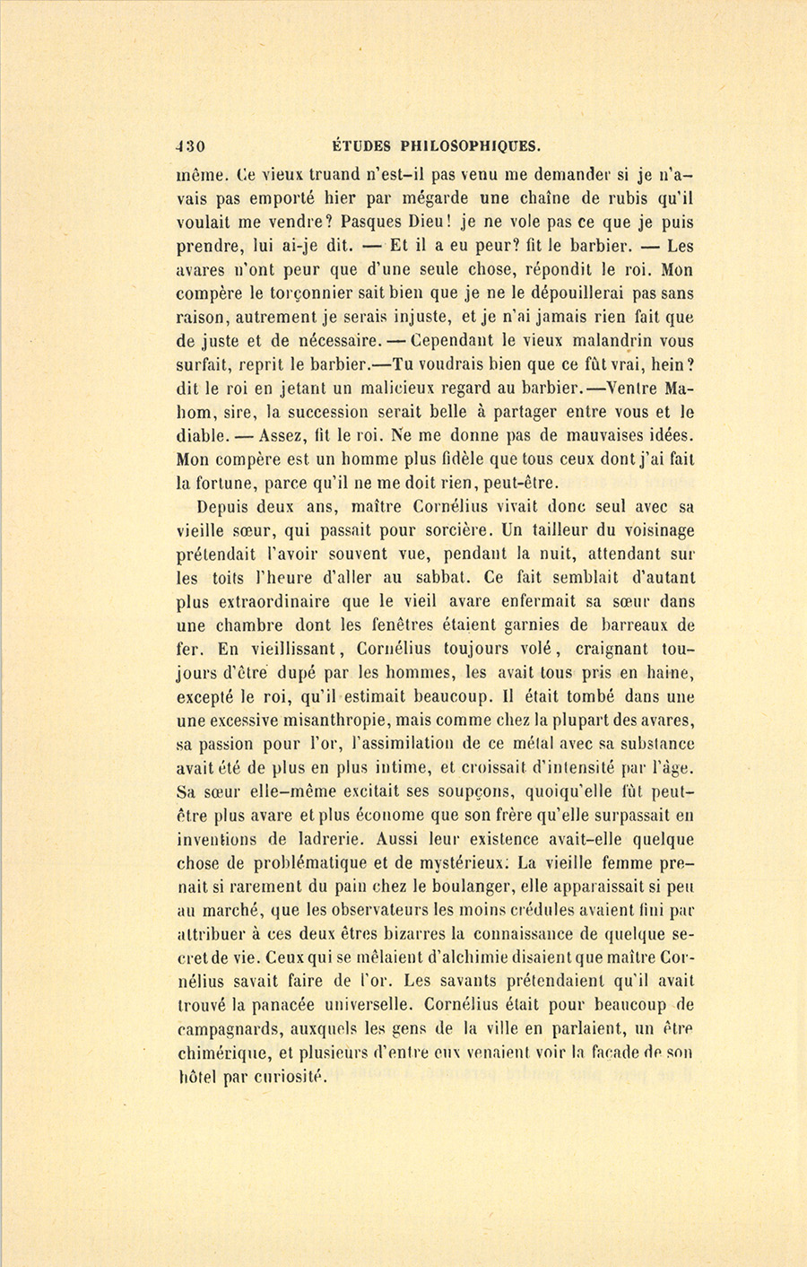 Depuis deux ans, maître Cornélius vivait donc seul avec sa vieille sœur, qui passait pour sorcière. Un tailleur du voisinage prétendait l’avoir souvent vue, pendant la nuit, attendant sur les toits l’heure d’aller au sabbat. Ce fait semblait d’autant plus extraordinaire que le vieil avare enfermait sa sœur dans une chambre dont les fenêtres étaient garnies de barreaux de fer. En vieillissant, Cornélius toujours volé, craignant toujours d’être dupé par les hommes, les avait tous pris en haine, excepté le roi, qu’il estimait beaucoup. Il était tombé dans une excessive misanthropie, mais comme chez la plupart des avares, sa passion pour l’or, l’assimilation de ce métal avec sa substance avait été de plus en plus intime, et croissait d’intensité par l’âge. Sa sœur elle-même excitait ses soupçons, quoiqu’elle fût peut-être plus avare et plus économe que son frère qu’elle surpassait en inventions de ladrerie. Aussi leur existence avait-elle quelque chose de problématique et de mystérieux. La vieille femme prenait si rarement du pain chez le boulanger, elle apparaissait si peu au marché, que les observateurs les moins crédules avaient fini par attribuer à ces deux êtres bizarres la connaissance de quelque secret de vie. Ceux qui se mêlaient d’alchimie disaient que maître Cornélius savait faire de l’or. Les savants prétendaient qu’il avait trouvé la panacée universelle. Cornélius était pour beaucoup de campagnards, auxquels les gens de la ville en parlaient, un être chimérique, et plusieurs d’entre eux venaient voir la façade de son hôtel par curiosité.