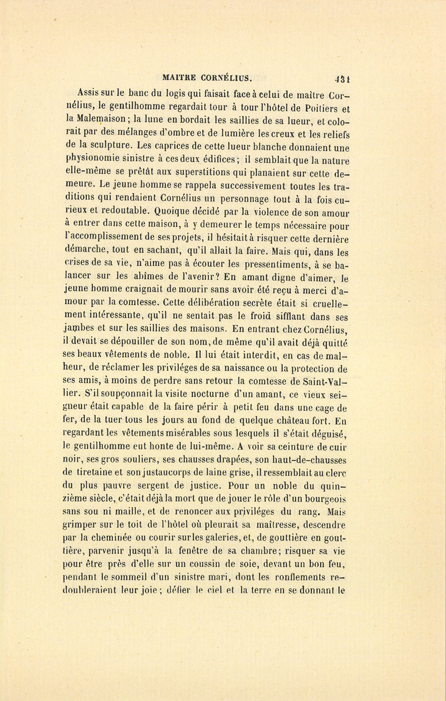 {p. 431} Assis sur le banc du logis qui faisait face à celui de maître Cornélius, le gentilhomme regardait tour à tour l’hôtel de Poitiers et la Malemaison ; la lune en bordait les saillies de sa lueur, et colorait par des mélanges d’ombre et de lumière les creux et les reliefs de la sculpture. Les caprices de cette lueur blanche donnaient une physionomie sinistre à ces deux édifices ; il semblait que la nature elle-même se prêtât aux superstitions qui planaient sur cette demeure. Le jeune homme se rappela successivement toutes les traditions qui rendaient Cornélius un personnage tout à la fois curieux et redoutable. Quoique décidé par la violence de son amour à entrer dans cette maison, à y demeurer le temps nécessaire pour l’accomplissement de ses projets, il hésitait à risquer cette dernière démarche, tout en sachant, qu’il allait la faire. Mais qui, dans les crises de sa vie, n’aime pas à écouter les pressentiments, à se balancer sur les abîmes de l’avenir ? En amant digne d’aimer, le jeune homme craignait de mourir sans avoir été reçu à merci d’amour par la comtesse. Cette délibération secrète était si cruellement intéressante, qu’il ne sentait pas le froid sifflant dans ses jambes et sur les saillies des maisons. En entrant chez Cornélius, il devait se dépouiller de son nom, de même qu’il avait déjà quitté ses beaux vêtements de noble. Il lui était interdit, en cas de malheur, de réclamer les priviléges de sa naissance ou la protection de ses amis, à moins de perdre sans retour la comtesse de Saint-Vallier. S’il soupçonnait la visite nocturne d’un amant, ce vieux seigneur était capable de la faire périr à petit feu dans une cage de fer, de la tuer tous les jours au fond de quelque château fort. En regardant les vêtements misérables sous lesquels il s’était déguisé, le gentilhomme eut honte de lui-même. À voir sa ceinture de cuir noir, ses gros souliers, ses chausses drapées, son haut-de-chausses de tiretaine et son justaucorps de laine grise, il ressemblait au clerc du plus pauvre sergent de justice. Pour un noble du quinzième siècle, c’était déjà la mort que de jouer le rôle d’un bourgeois sans sou ni maille, et de renoncer aux priviléges du rang. Mais grimper sur le toit de l’hôtel où pleurait sa maîtresse, descendre par la cheminée ou courir sur les galeries, et, de gouttière en gouttière, parvenir jusqu’à la fenêtre de sa chambre ; risquer sa vie pour être près d’elle sur un coussin de soie, devant un bon feu, pendant le sommeil d’un sinistre mari, dont les ronflements redoubleraient leur joie ; défier le ciel et la terre en se donnant le {p. 432} plus audacieux de tous les baisers ; ne pas dire une parole qui ne pût être suivie de la mort, ou, tout au moins, d’un sanglant combat ; toutes ces voluptueuses images et les romanesques dangers de cette entreprise décidèrent le jeune homme. Plus léger devait être le prix de ses soins, ne pût-il même que baiser encore une fois la main de la comtesse, plus promptement il se résolut à tout tenter, poussé par l’esprit chevaleresque et passionné de cette époque. Puis, il ne supposa point que la comtesse osât lui refuser le plus doux plaisir de l’amour au milieu de dangers si mortels. Cette aventure était trop périlleuse, trop impossible pour n’être pas achevée.