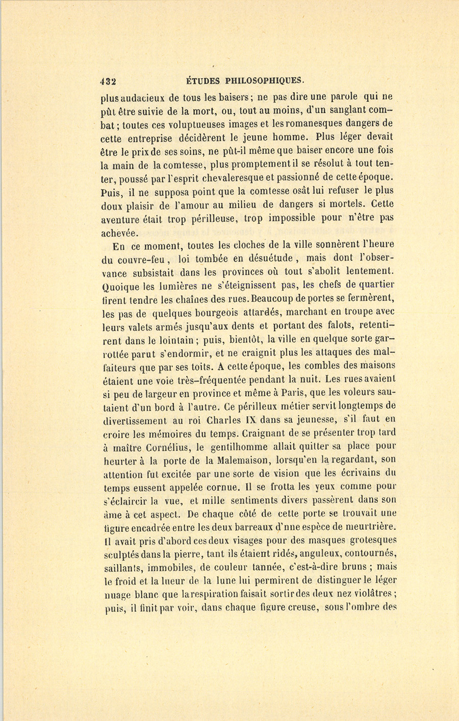 En ce moment, toutes les cloches de la ville sonnèrent l’heure du couvre-feu, loi tombée en désuétude, mais dont l’observance subsistait dans les provinces où tout s’abolit lentement. Quoique les lumières ne s’éteignissent pas, les chefs de quartier firent tendre les chaînes des rues. Beaucoup de portes se fermèrent, les pas de quelques bourgeois attardés, marchant en troupe avec leurs valets armés jusqu’aux dents et portant des falots, retentirent dans le lointain ; puis, bientôt, la ville en quelque sorte garrottée parut s’endormir, et ne craignit plus les attaques des malfaiteurs que par ses toits. À cette époque, les combles des maisons étaient une voie très-fréquentée pendant la nuit. Les rues avaient si peu de largeur en province et même à Paris, que les voleurs sautaient d’un bord à l’autre. Ce périlleux métier servit longtemps de divertissement au roi Charles IX dans sa jeunesse, s’il faut en croire les mémoires du temps. Craignant de se présenter trop tard à maître Cornélius, le gentilhomme allait quitter sa place pour heurter à la porte de la Malemaison, lorsqu’en la regardant, son attention fut excitée par une sorte de vision que les écrivains du temps eussent appelée cornue. Il se frotta les yeux comme pour s’éclaircir la vue, et mille sentiments divers passèrent dans son âme à cet aspect. De chaque côté de cette porte se trouvait une figure encadrée entre les deux barreaux d’une espèce de meurtrière. Il avait pris d’abord ces deux visages pour des masques grotesques sculptés dans la pierre, tant ils étaient ridés, anguleux, contournés, saillants, immobiles, de couleur tannée, c’est-à-dire bruns ; mais le froid et la lueur de la lune lui permirent de distinguer le léger nuage blanc que la respiration faisait sortir des deux nez violâtres ; puis, il finit par voir, dans chaque figure creuse, sous l’ombre des {p. 433} sourcils, deux yeux d’un bleu faïence qui jetaient un feu clair, et ressemblaient à ceux d’un loup couché dans la feuillée, qui croit entendre les cris d’une meute. La lueur inquiète de ces yeux était dirigée sur lui si fixement, qu’après l’avoir reçue pendant le moment où il examina ce singulier spectacle, il se trouva comme un oiseau surpris par des chiens à l’arrêt, il se fit dans son âme un mouvement fébrile, promptement réprimé. Ces deux visages, tendus et soupçonneux, étaient sans doute ceux de Cornélius et de sa sœur. Alors le gentilhomme feignit de regarder où il était, de chercher à distinguer un logis indiqué sur une carte qu’il tira de sa poche en essayant de la lire aux clartés de la lune ; puis, il alla droit à la porte du torçonnier, et y frappa trois coups qui retentirent au dedans de la maison, comme si c’eût été l’entrée d’une cave. Une faible lumière passa sous le porche, et, par une petite grille extrêmement forte, un œil vint à briller.