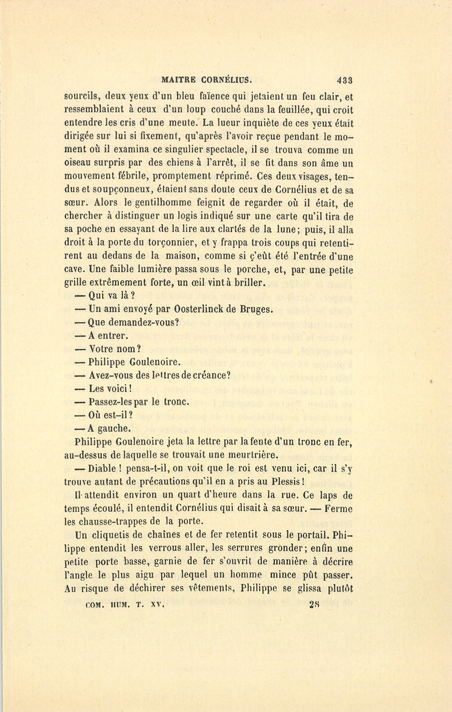 Il attendit environ un quart d’heure dans la rue. Ce laps de temps écoulé, il entendit Cornélius qui disait à sa sœur3 : – Ferme les chausse-trapes de la porte.