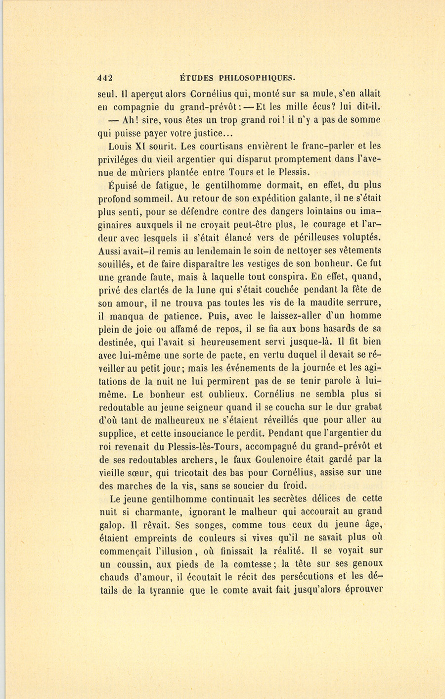 Louis XI donna l’ordre, non sans y joindre quelques instructions secrètes, à un lieutenant de la garde écossaise de prendre une escouade, et d’accompagner son ambassadeur jusqu’à Venise. Saint-Vallier partit en grande hâte, après avoir donné à sa femme un baiser froid qu’il aurait voulu pouvoir rendre mortel. Lorsque la comtesse fut rentrée chez elle, Louis XI vint à la Malemaison, fort empressé de dénouer la triste farce qui se jouait chez son compère le torçonnier, se flattant, en sa qualité de roi, d’avoir assez de perspicacité pour découvrir les secrets des voleurs. Cornélius ne vit pas sans quelque appréhension la compagnie de son maître.