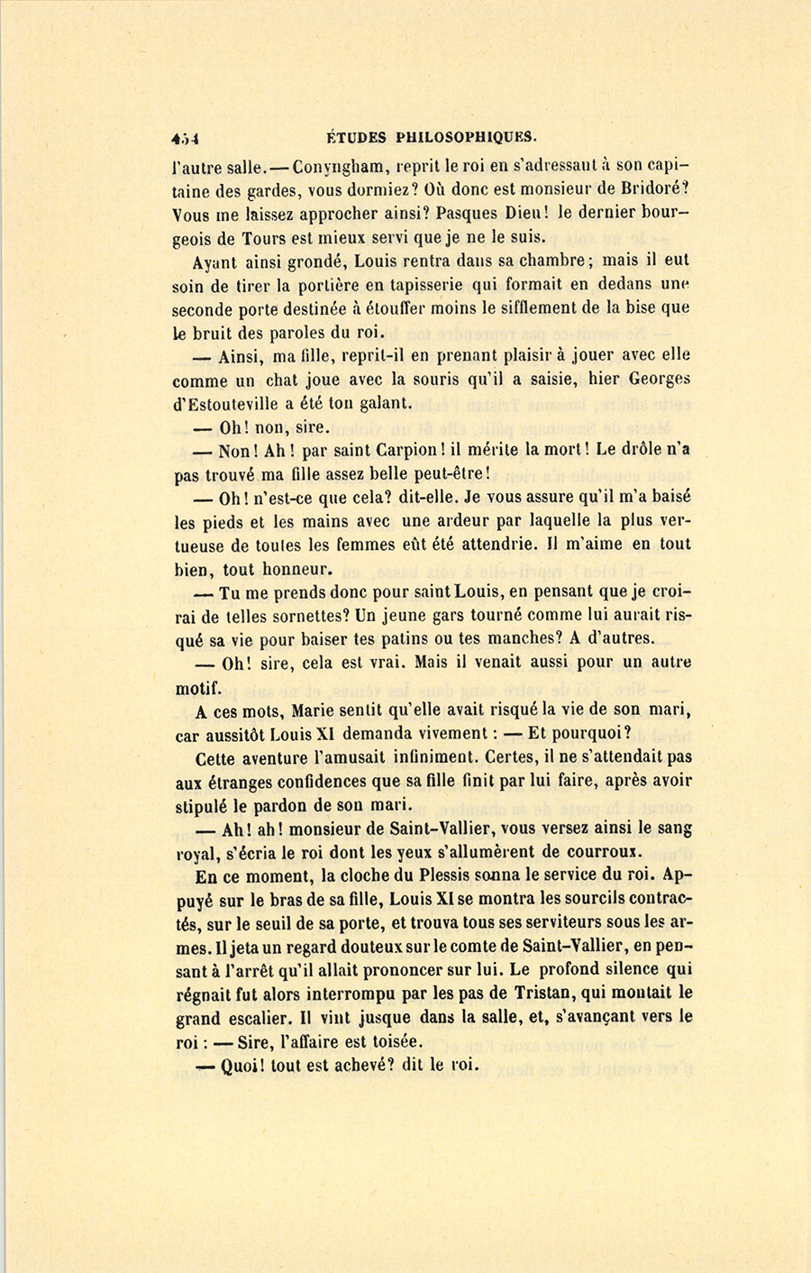 – Vous pourrez avoir l’un et l’autre, dit Louis XI. Nul de vous n’est exempt de ces deux infirmités, messieurs. Retirez-vous dans {p. 454} l’autre salle. – Conyngham, reprit le roi en s’adressant à son capitaine des gardes, vous dormiez ? Où donc est monsieur de Bridoré ? Vous me laissez approcher ainsi ? Pasques Dieu ! le dernier bourgeois de Tours est mieux servi que je ne le suis.