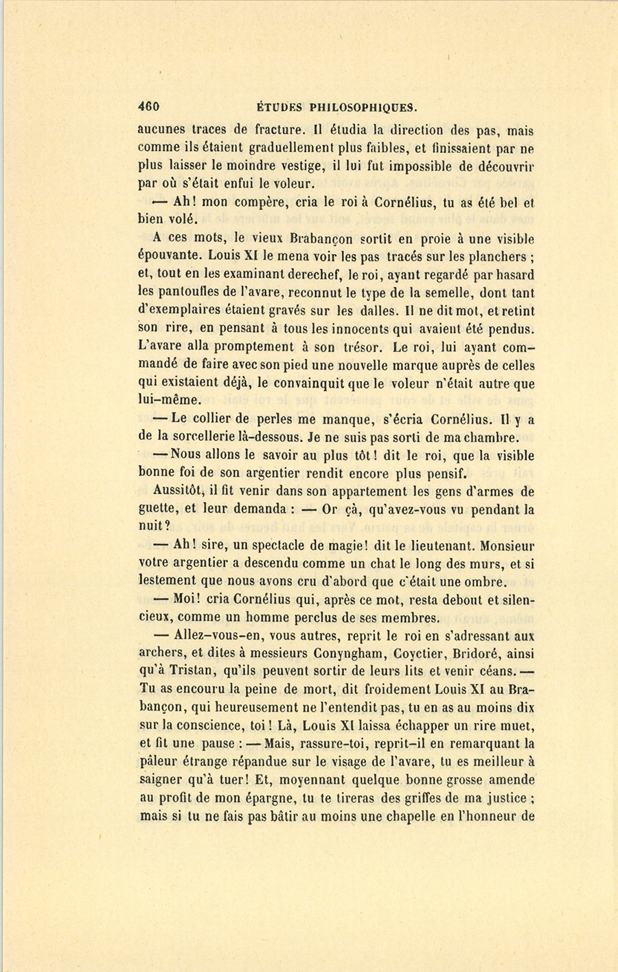 À ces mots, le vieux Brabançon sortit en proie à une visible épouvante. Louis XI le mena voir les pas tracés sur les planchers ; et, tout en les examinant derechef, le roi, ayant regardé par hasard les pantoufles de l’avare, reconnut le type de la semelle, dont tant d’exemplaires étaient gravés sur les dalles. Il ne dit mot, et retint son rire, en pensant à tous les innocents qui avaient été pendus. L’avare alla promptement à son trésor. Le roi, lui ayant commandé de faire avec son pied une nouvelle marque auprès de celles qui existaient déjà, le convainquit que le voleur n’était autre que lui-même.