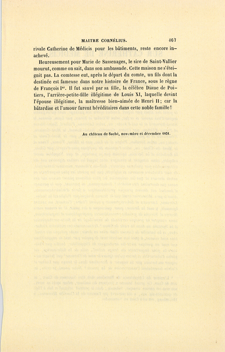 Heureusement pour Marie de Sassenage, le sire de Saint-Vallier mourut, comme on sait, dans son ambassade. Cette maison ne s’éteignit pas. La comtesse eut, après le départ du comte, un fils dont la destinée est fameuse dans notre histoire de France, sous le règne de François Ier. Il fut sauvé par sa fille, la célèbre Diane de Poitiers, l’arrière-petite-fille illégitime de Louis XI, laquelle devint l’épouse illégitime, la maîtresse bien-aimée de Henri II ; car la bâtardise et l’amour furent héréditaires dans cette noble famille !