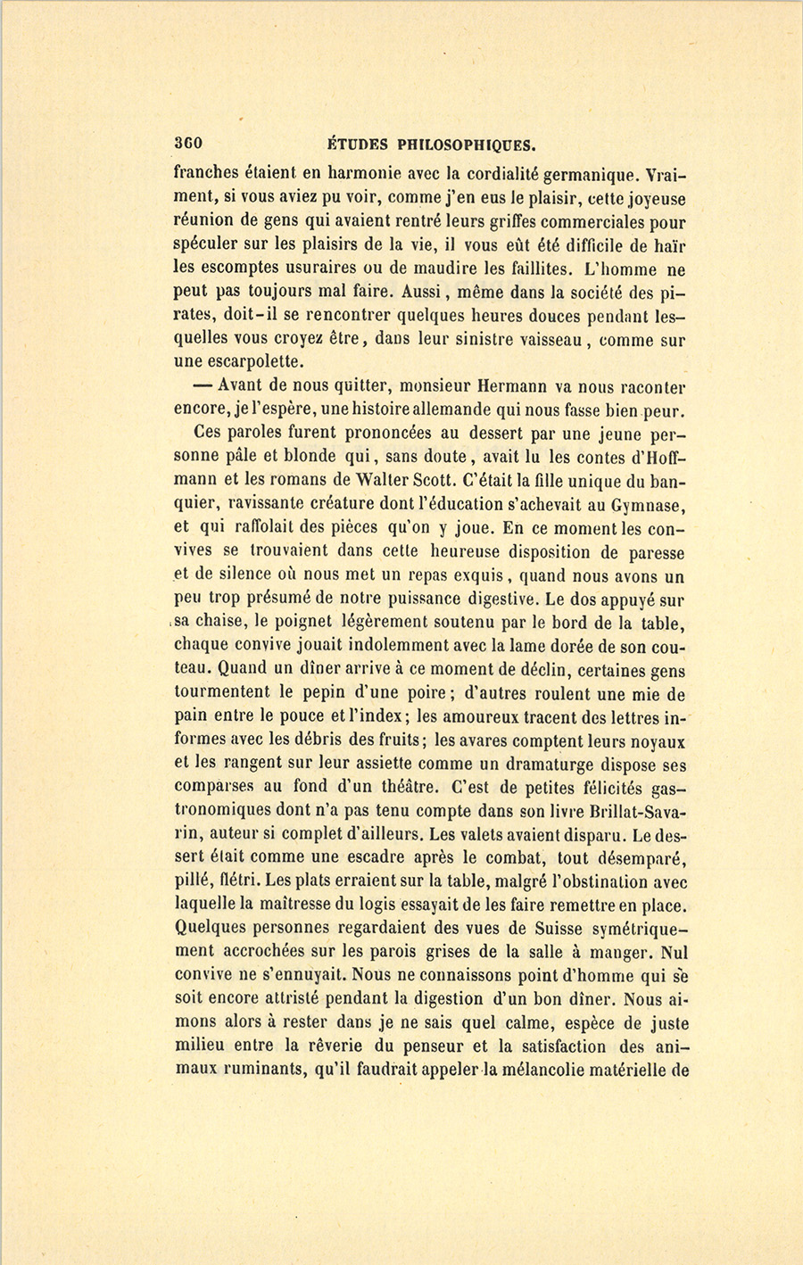 Ces paroles furent prononcées au dessert par une jeune personne pâle et blonde qui, sans doute, avait lu les contes d’Hoffmann et les romans de Walter Scott. C’était la fille unique du banquier, ravissante créature dont l’éducation s’achevait au Gymnase, et qui raffolait des pièces qu’on y joue. En ce moment les convives se trouvaient dans cette heureuse disposition de paresse et de silence où nous met un repas exquis, quand nous avons un peu trop présumé de notre puissance digestive. Le dos appuyé sur sa chaise, le poignet légèrement soutenu par le bord de la table, chaque convive jouait indolemment avec la lame dorée de son couteau. Quand un dîner arrive à ce moment de déclin, certaines gens tourmentent le pépin d’une poire ; d’autres roulent une mie de pain entre le pouce et l’index ; les amoureux tracent des lettres informes avec les débris des fruits ; les avares comptent leurs noyaux et les rangent sur leur assiette comme un dramaturge dispose ses comparses au fond d’un théâtre. C’est de petites félicités gastronomiques dont n’a pas tenu compte dans son livre Brillat-Savarin, auteur si complet d’ailleurs. Les valets avaient disparu. Le dessert était comme une escadre après le combat, tout désemparé, pillé, flétri. Les plats erraient sur la table, malgré l’obstination avec laquelle la maîtresse du logis essayait de les faire remettre en place. Quelques personnes regardaient des vues de Suisse symétriquement accrochées sur les parois grises de la salle à manger. Nul convive ne s’ennuyait. Nous ne connaissons point d’homme qui se soit encore attristé pendant la digestion d’un bon dîner. Nous aimons alors à rester dans je ne sais quel calme, espèce de juste milieu entre la rêverie du penseur et la satisfaction des animaux ruminants, qu’il faudrait appeler la mélancolie matérielle de {p. 361} la gastronomie. Aussi les convives se tournèrent-ils spontanément vers le bon Allemand, enchantés tous d’avoir une ballade à écouter, fût-elle même sans intérêt. Pendant cette benoîte pause, la voix d’un conteur semble toujours délicieuse à nos sens engourdis, elle en favorise le bonheur négatif. Chercheur de tableaux, j’admirais ces visages égayés par un sourire, éclairés par les bougies, et que la bonne chère avait empourprés ; leurs expressions diverses produisaient de piquants effets à travers les candélabres, les corbeilles en porcelaine, les fruits et les cristaux.