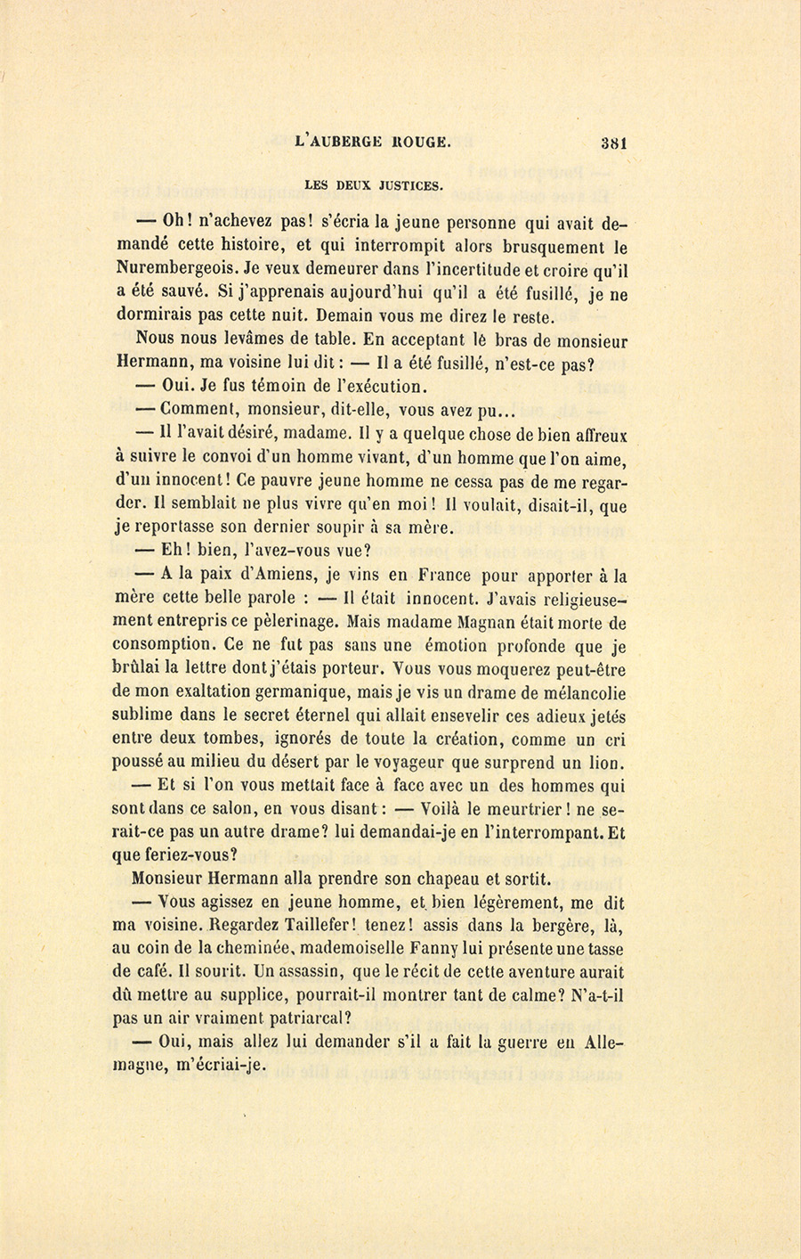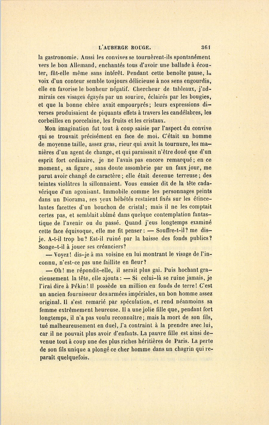 {p. 362} En ce moment, le fournisseur leva les yeux sur moi ; son regard me fit tressaillir, tant il était sombre et pensif ! Assurément ce coup d’œil résumait toute une vie. Mais tout à coup sa physionomie devint gaie ; il prit le bouchon de cristal, le mit, par un mouvement machinal, à une carafe pleine d’eau qui se trouvait devant son assiette, et tourna la tête vers monsieur Hermann en souriant. Cet homme, béatifié par ses jouissances gastronomiques, n’avait sans doute pas deux idées dans la cervelle, et ne songeait à rien. Aussi eus-je en quelque sorte, honte de prodiguer ma science divinatoire in anima vili d’un épais financier. Pendant que je faisais, en pure perte, des observations phrénologiques, le bon Allemand s’était lesté le nez d’une prise de tabac, et commençait son histoire. Il me serait assez difficile de la reproduire dans les mêmes termes, avec ses interruptions fréquentes et ses digressions verbeuses. Aussi l’ai-je écrite à ma guise, laissant les fautes au Nurembergeois, et m’emparant de ce qu’elle peut avoir de poétique et d’intéressant, avec la candeur des écrivains qui oublient de mettre au titre de leurs livres : traduit de l’allemand.